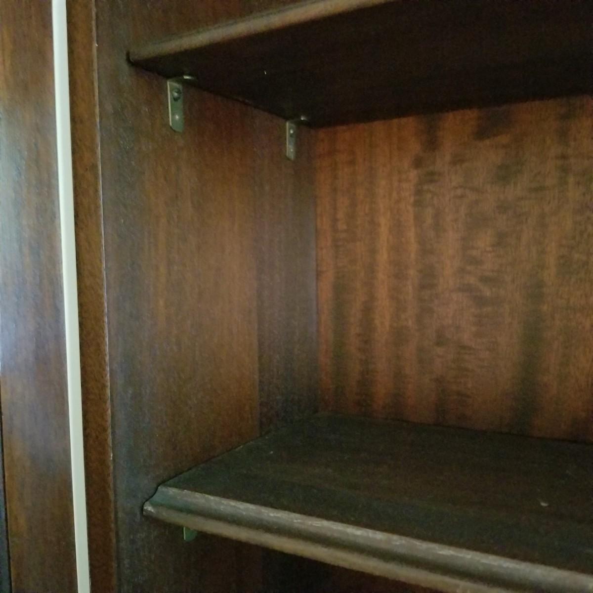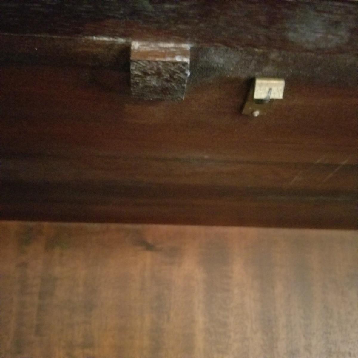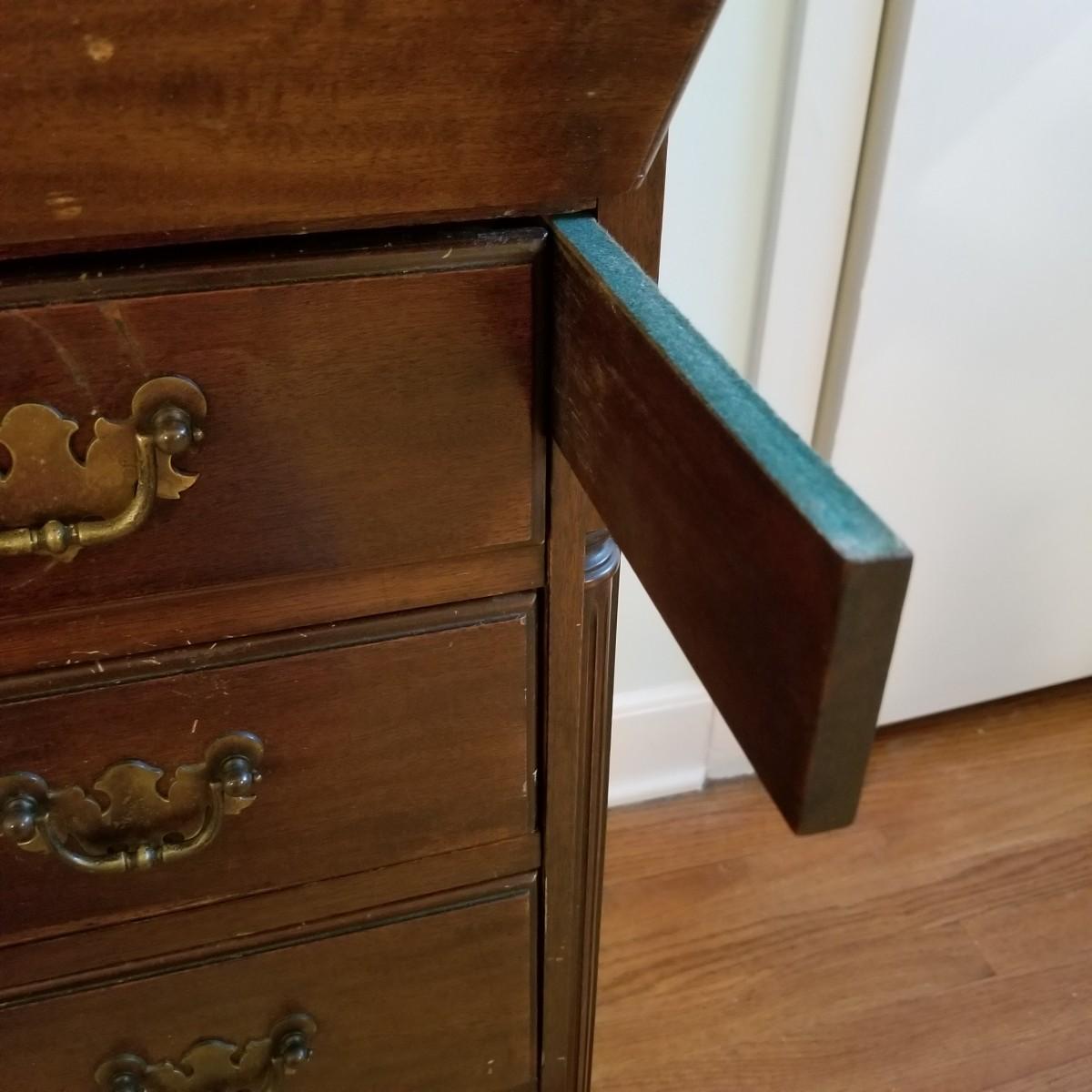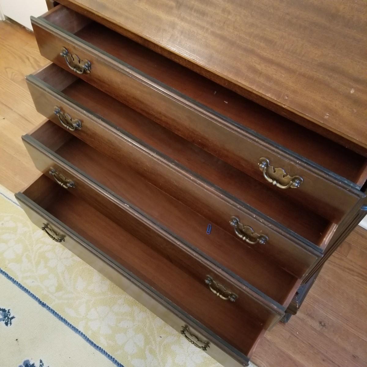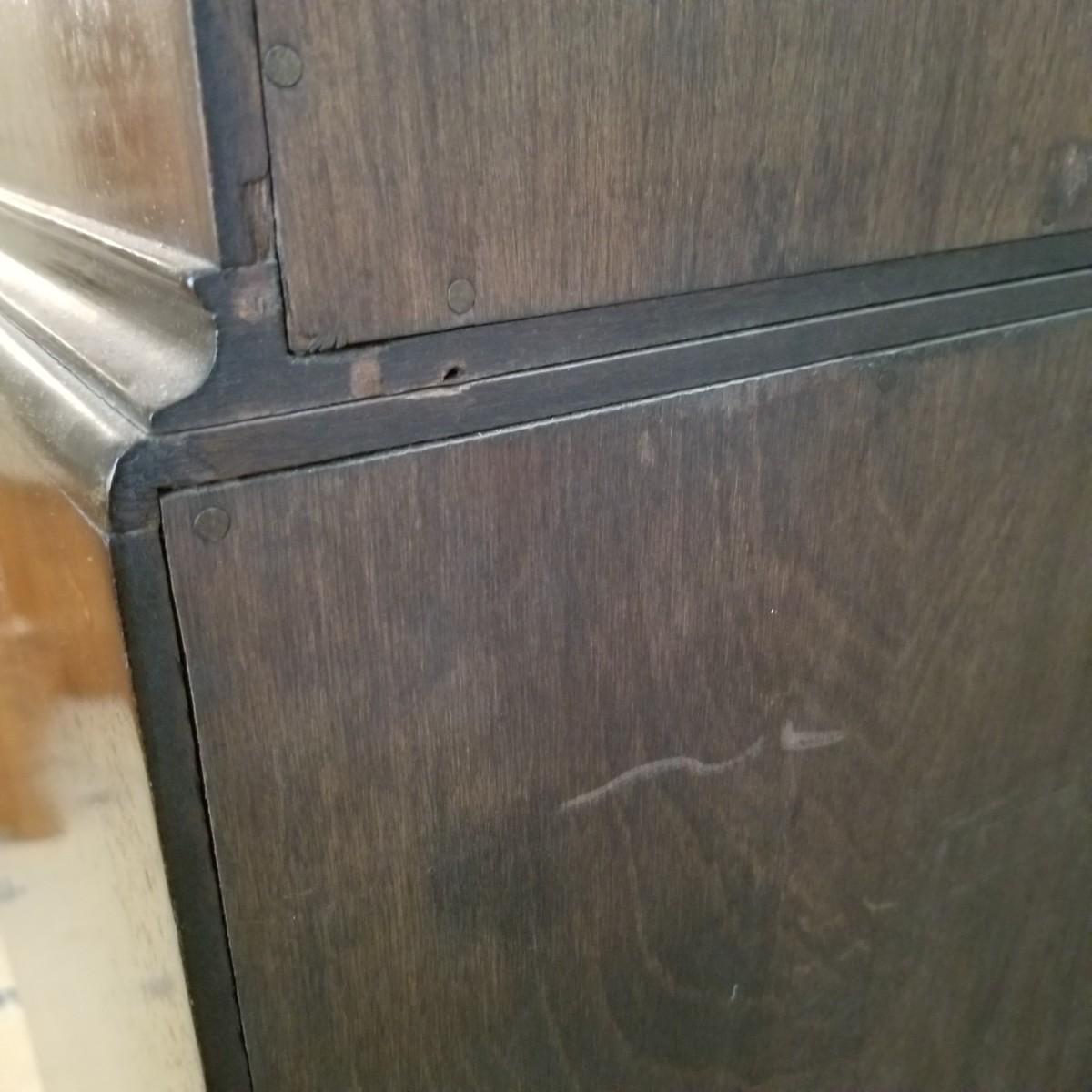 Beautiful wooden drop-front desk with glass door hutch top. Four drawers have dovetail construction,  desk has slide out supports. Multiple drawers and cubby holes inside including two 'hidden' compartments on either side of the center door. One drawer missing pull, otherwise piece mostly in good condition. Key in door is included but does not fit any of the locks.See photos for detail. 80" x 32" x 19". All one piece, winning bidder will need to bring help to load. Item is located on the second floor of the house and will need to be moved down one flight of stairs. Local pickup only.