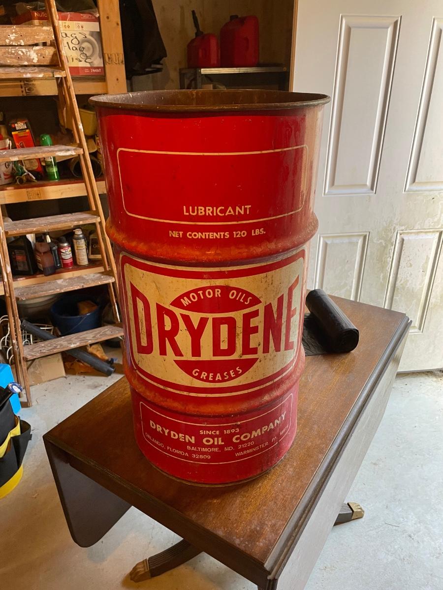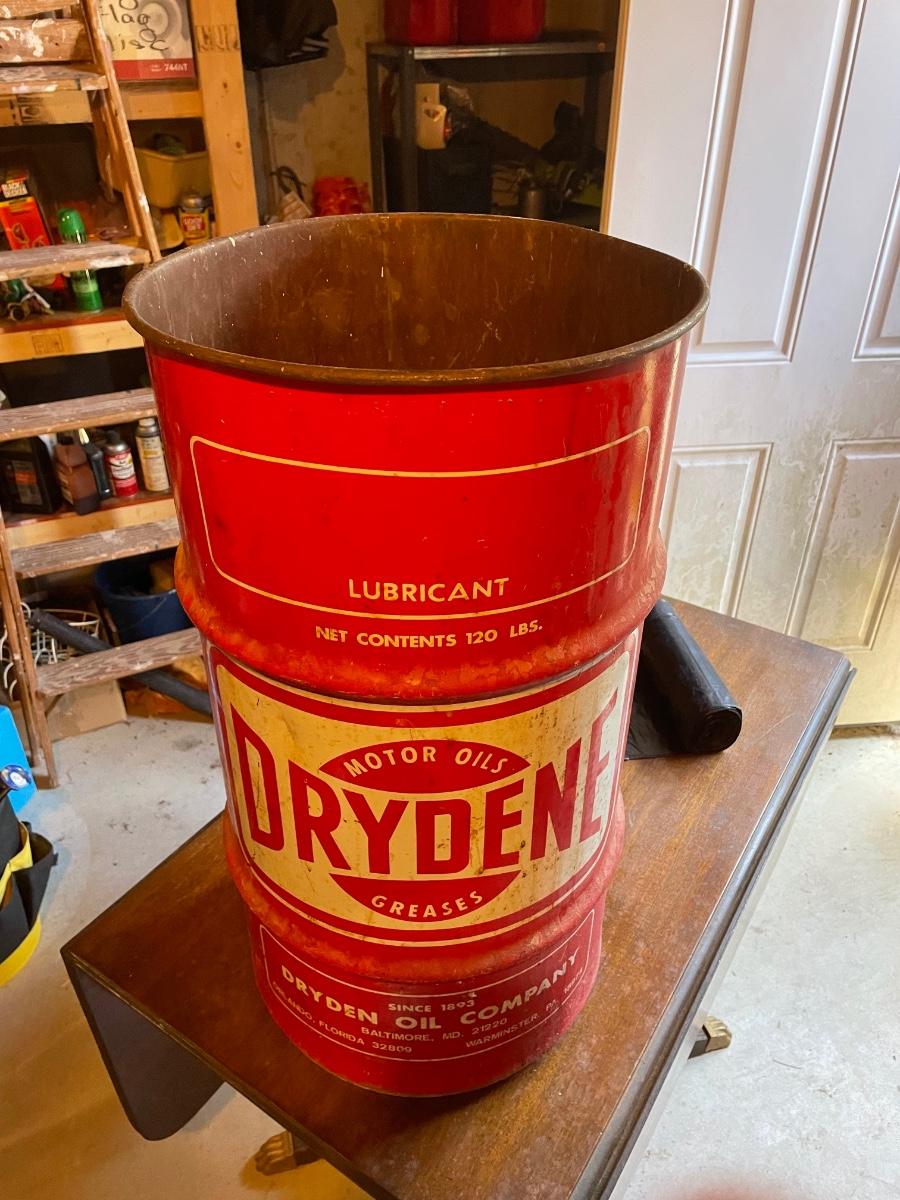 Vintage Drydene Steel Oil Drum. 26 inches high by 14 inches Diameter.
