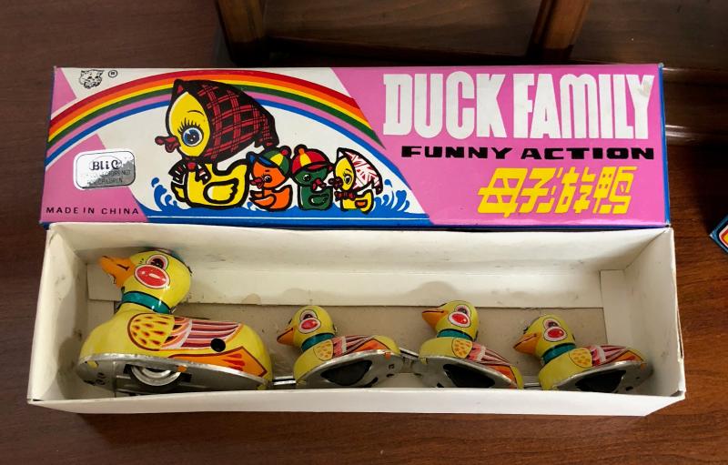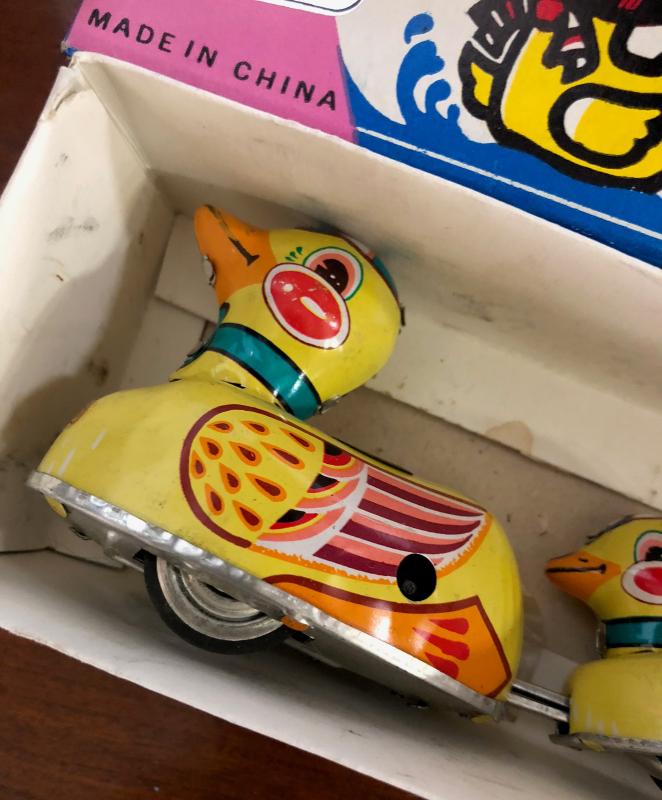 With box here is a 10" long mechanical windup tin litho toy Duck Family....with 'Funny Action'...