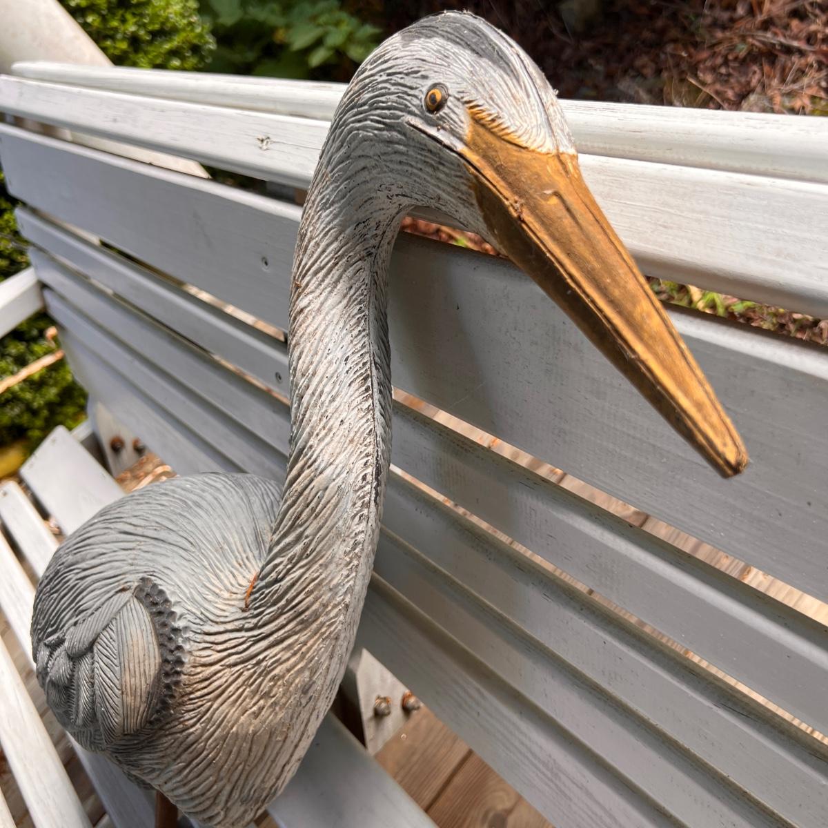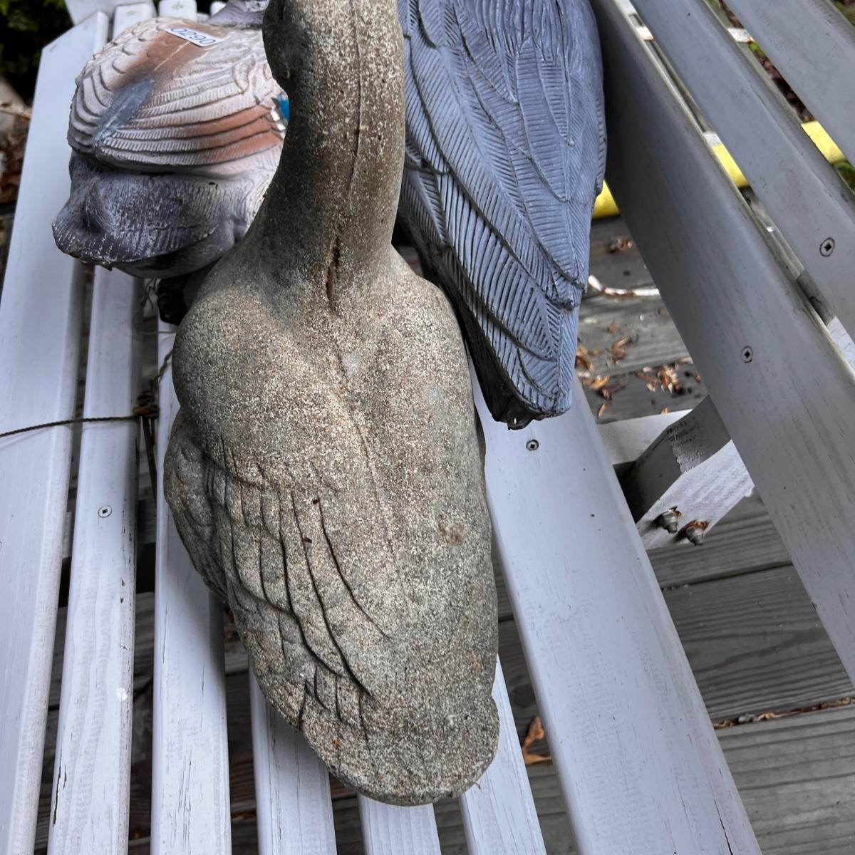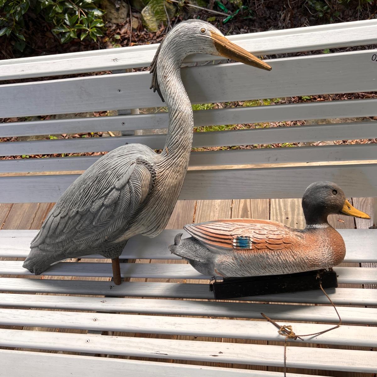 Plastic decoy heron and duck, stone duck.