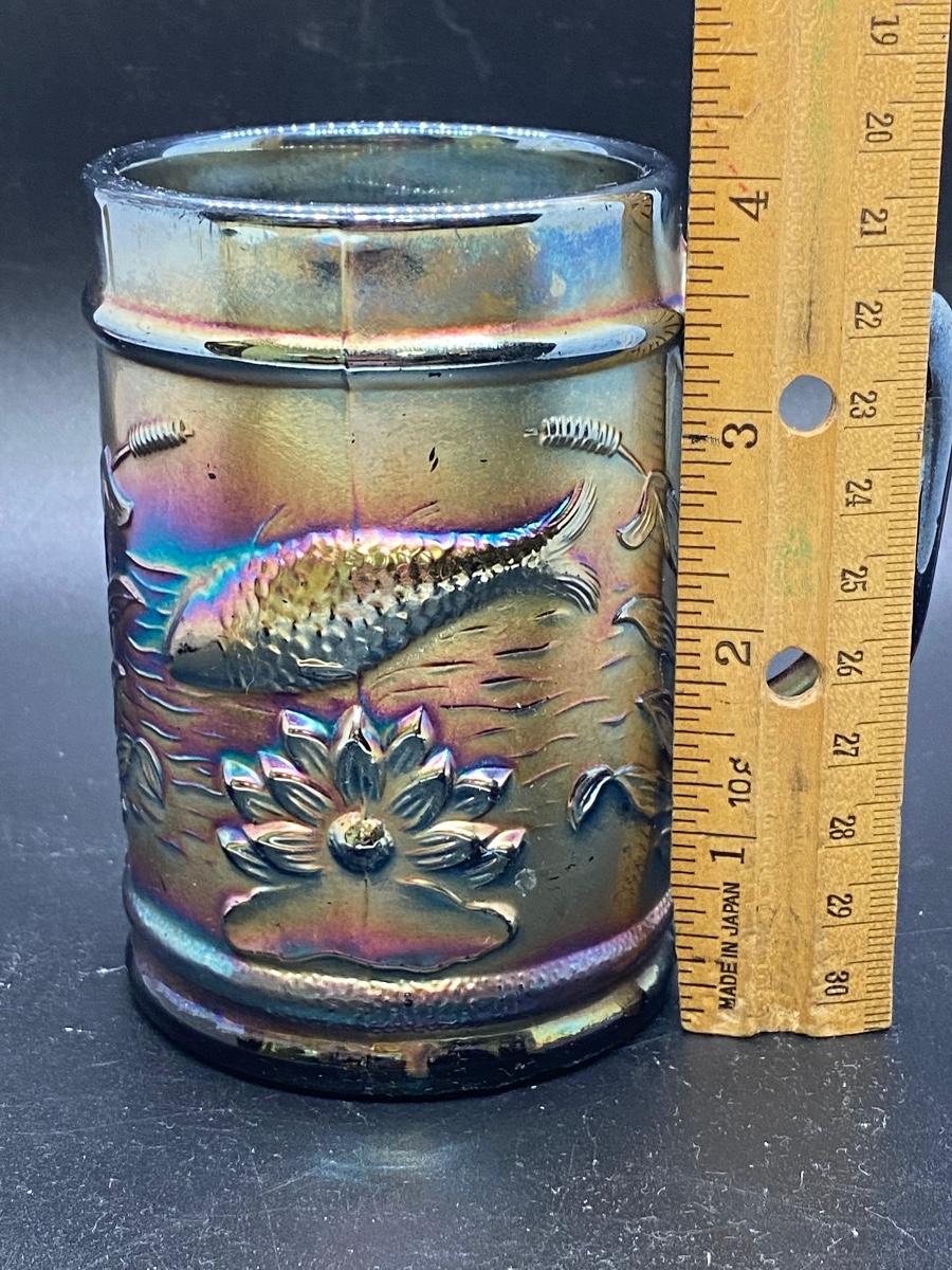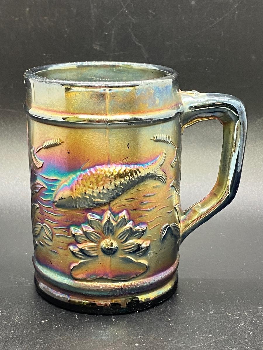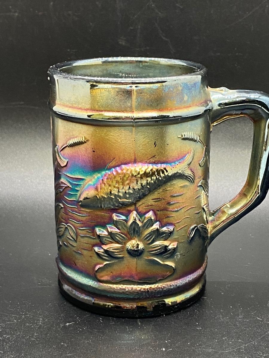 Vintage Dugan Glass fisherman mug. Black carnival glass, great gold reflect. Features embossed fish and flower pattern. There is a couple very small chips in the bottom edge and one on the top. Displays great. About 4" tall.