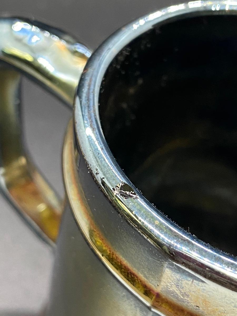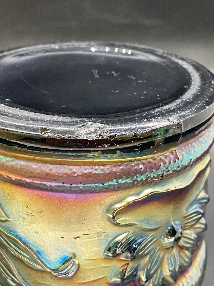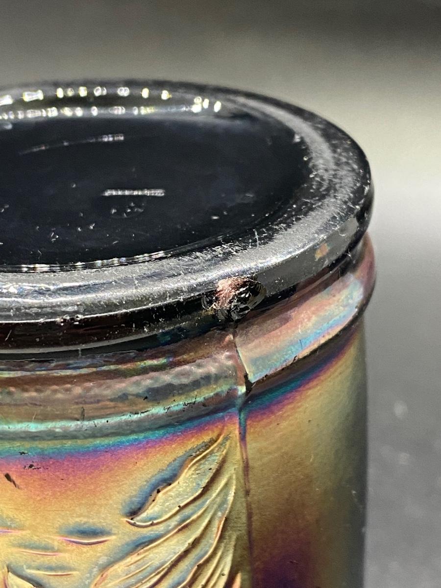Vintage Dugan Glass fisherman mug. Black carnival glass, great gold reflect. Features embossed fish and flower pattern. There is a couple very small chips in the bottom edge and one on the top. Displays great. About 4" tall.