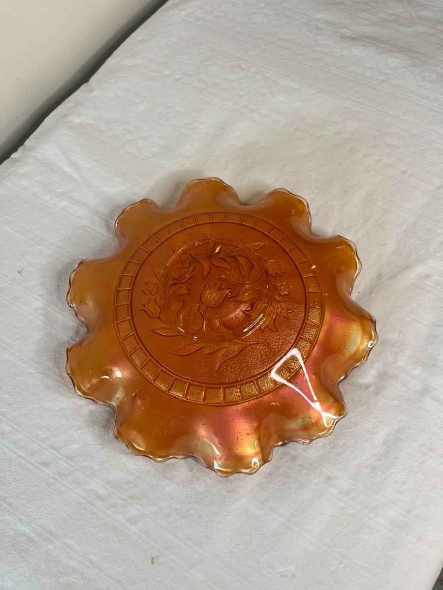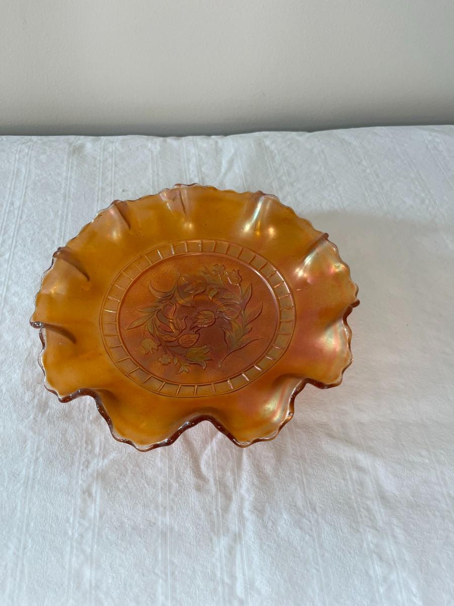 Vintage Dugan Marigold Carnival Glass Bowl likely in the windflower pattern