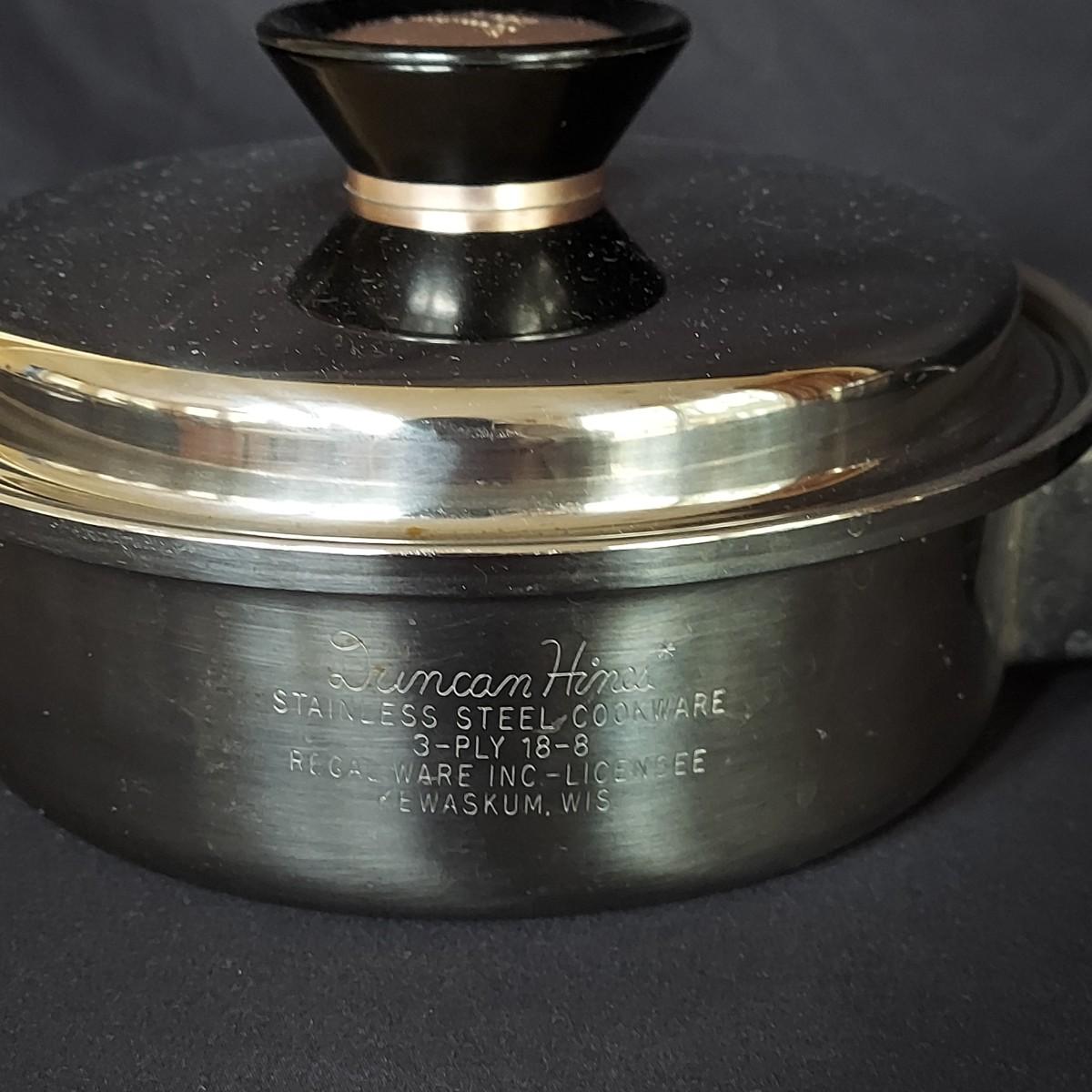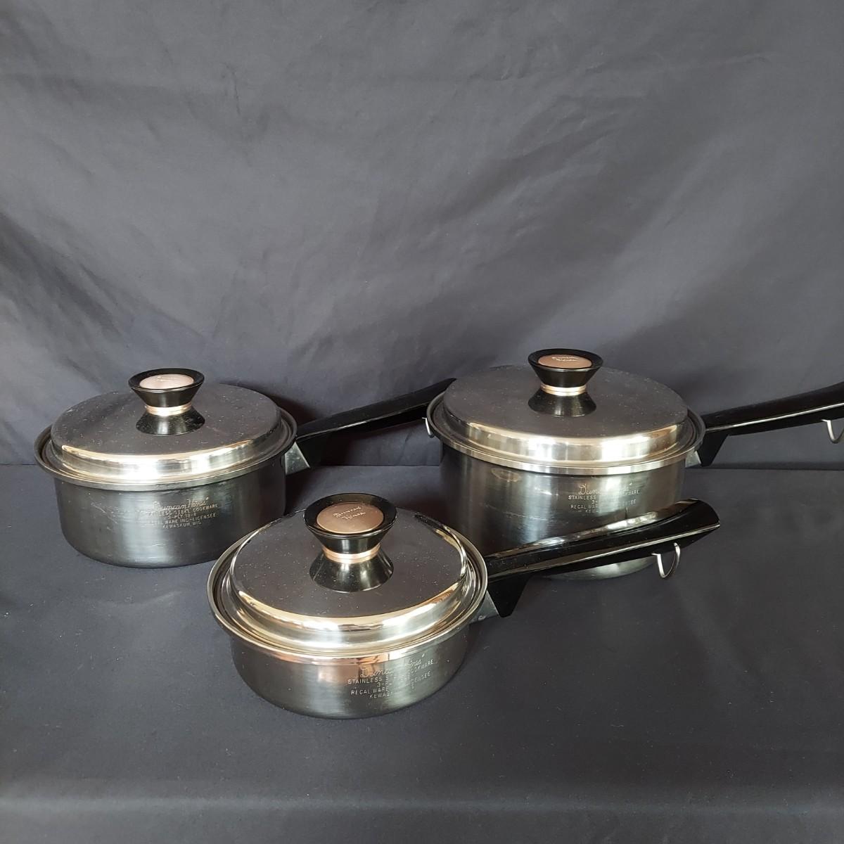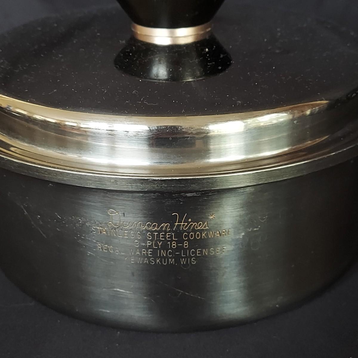 Vintage Duncan Hines Regal Ware 3 ply sauce pans. There is a 7", 8" and 8.5" pan. Each has a matching lid. Shipping available