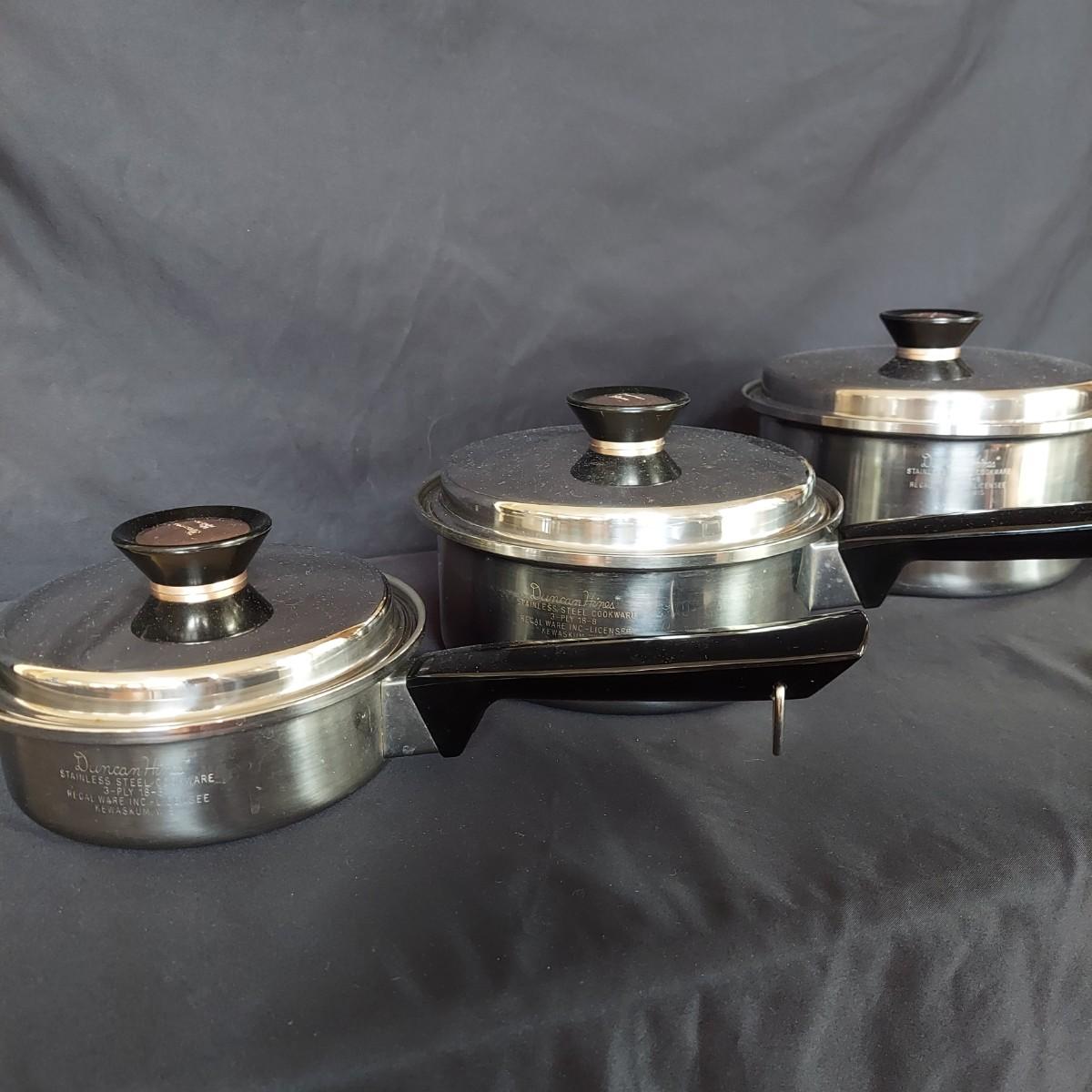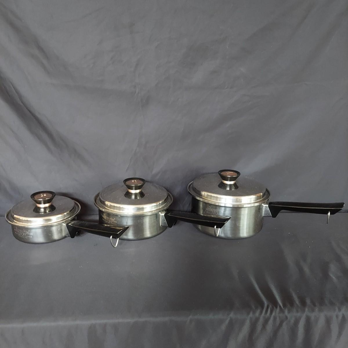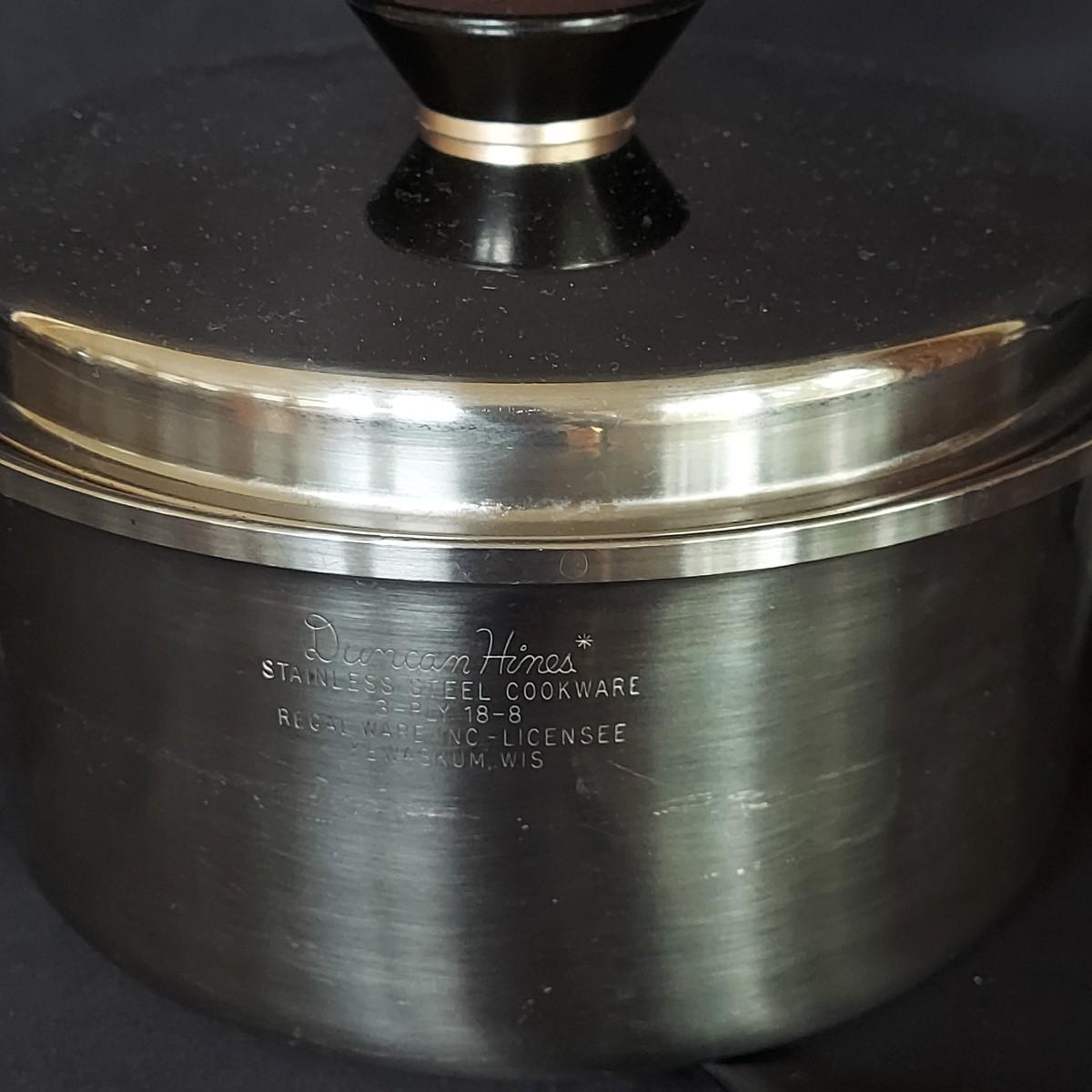 Vintage Duncan Hines Regal Ware 3 ply sauce pans. There is a 7", 8" and 8.5" pan. Each has a matching lid. Shipping available