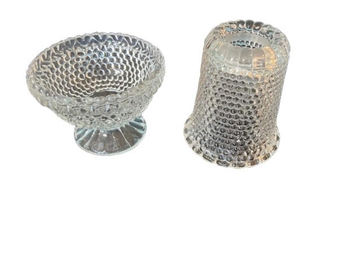 Thousand eyes hobnail pattern. Clear. No obvious chips or cracks. Measurement: 6.5"H.