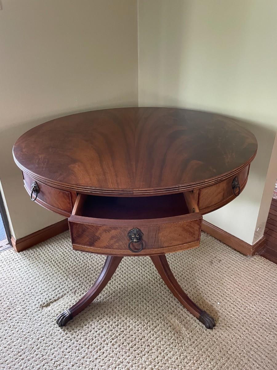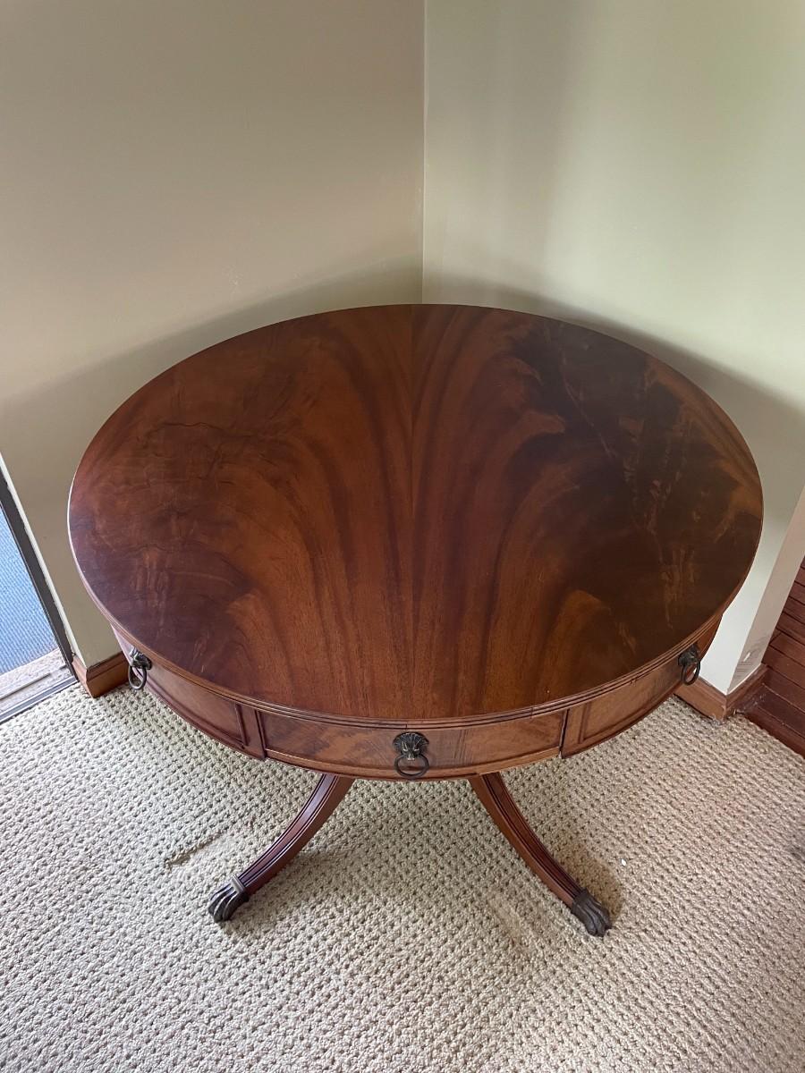 The table features a pedestal base with flared feet and brass hardware shaped like a lion. The table has one drawer and is in excellent condition. 36w x 29h.