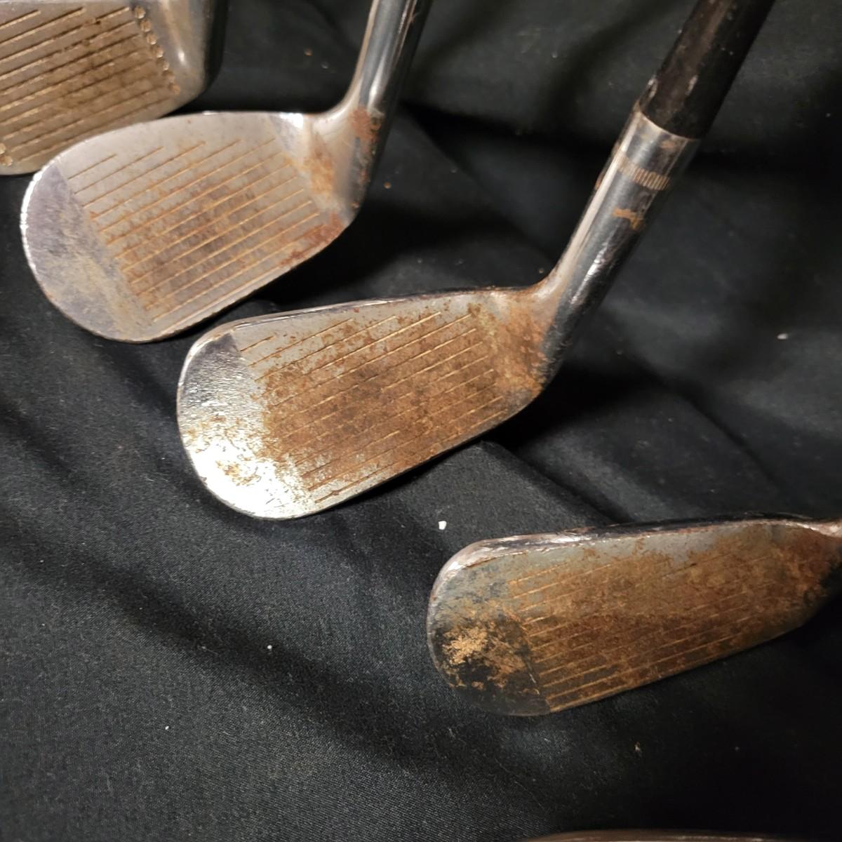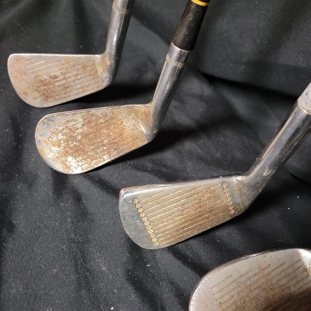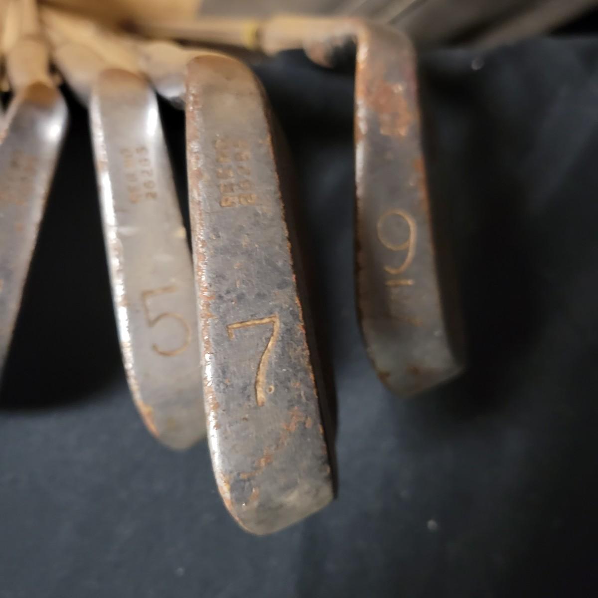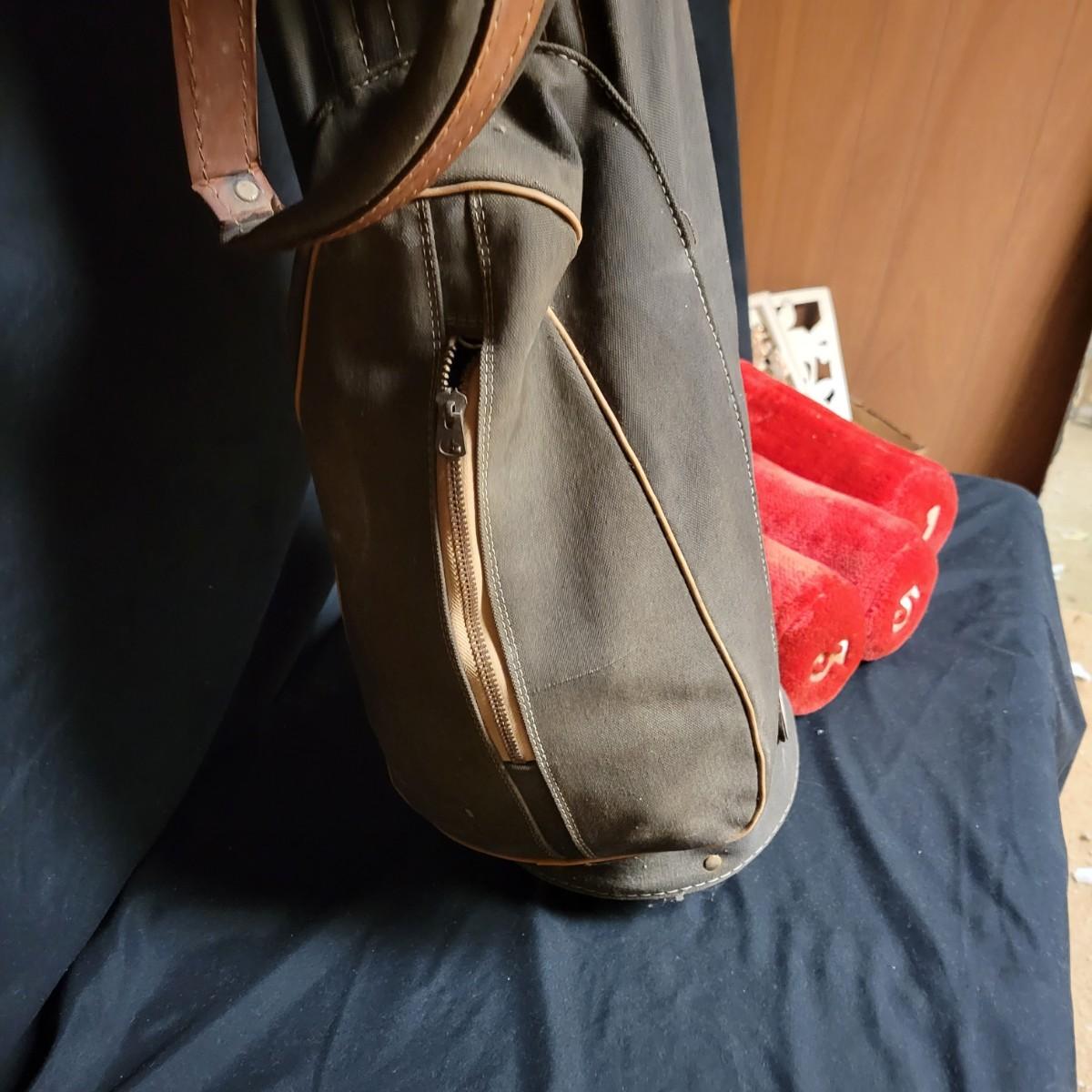 A golf bag and clubs in good condition. The bag is made by Dunlop and is made of canvas with leather accents. This bag has one large pocket stuffed with balls. Nine clubs are included. A five wood made by Golf Pride, six irons made by McGregor that are Sam Sneed Signature clubs and a wedge and 3 iron manufactured by Northwestern that are Bruce Crampton professional clubs. The five wood has a shaft length of 39" and the four iron has a shaft length of 35". Irons do have some rust and there is some wear and tear from use. Local pickup only