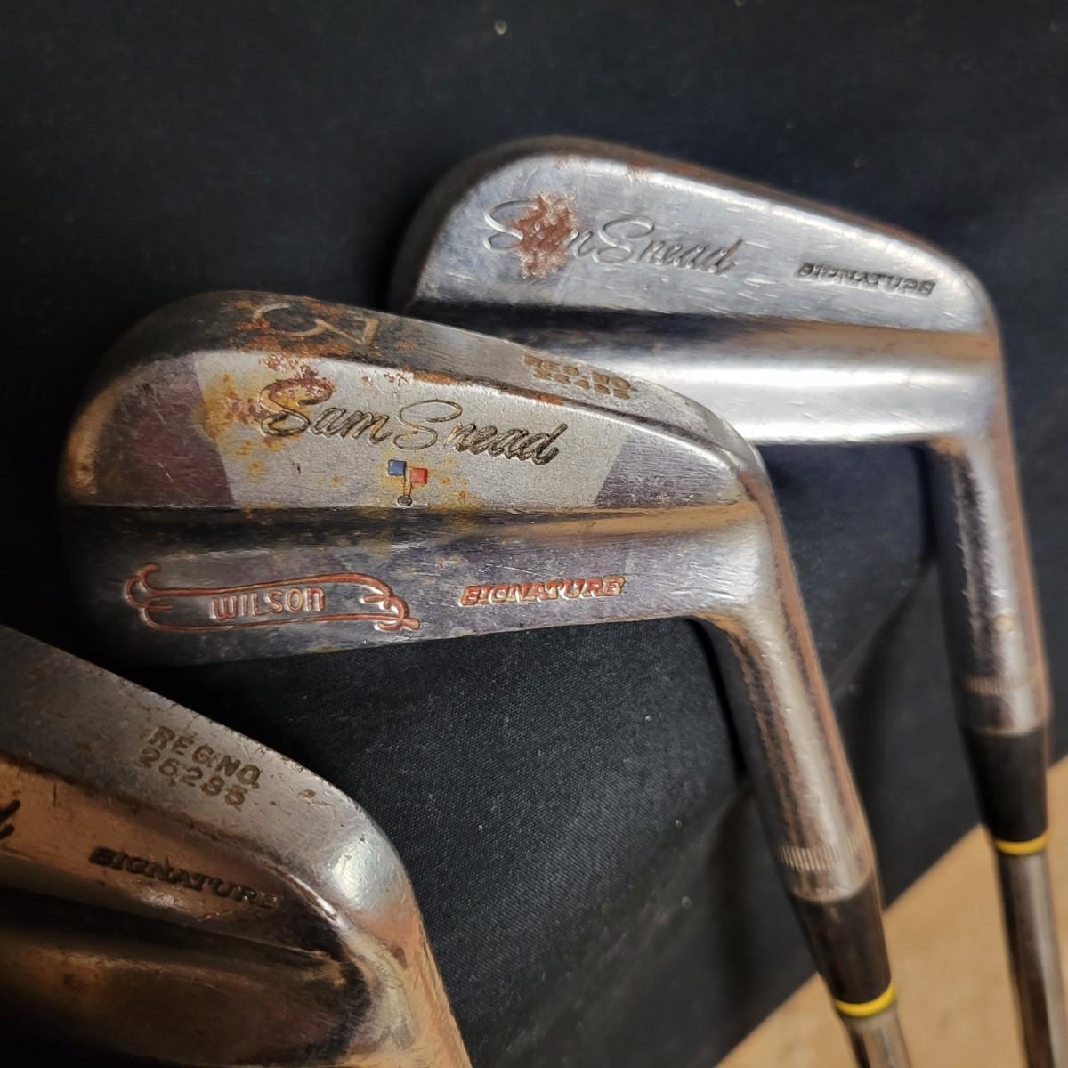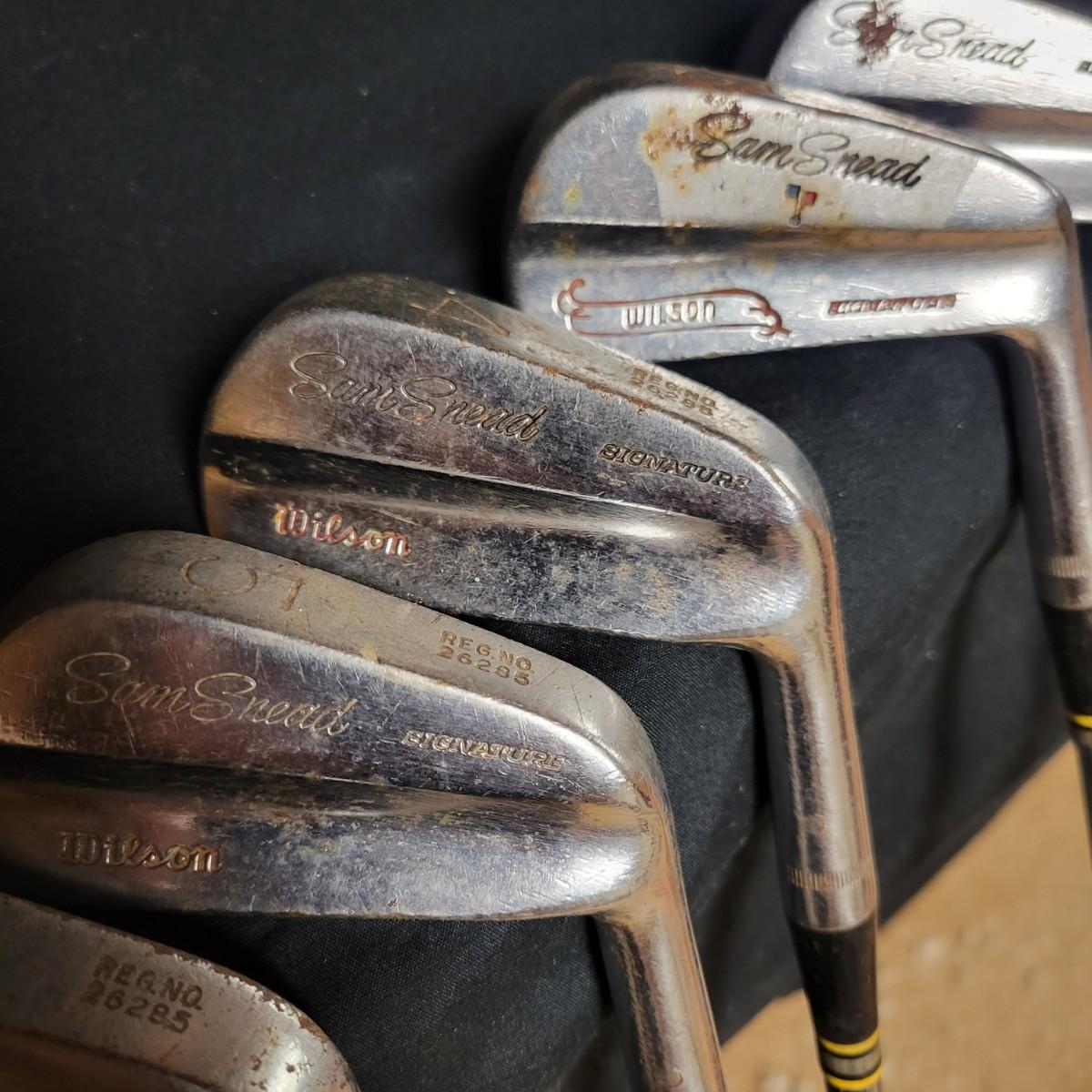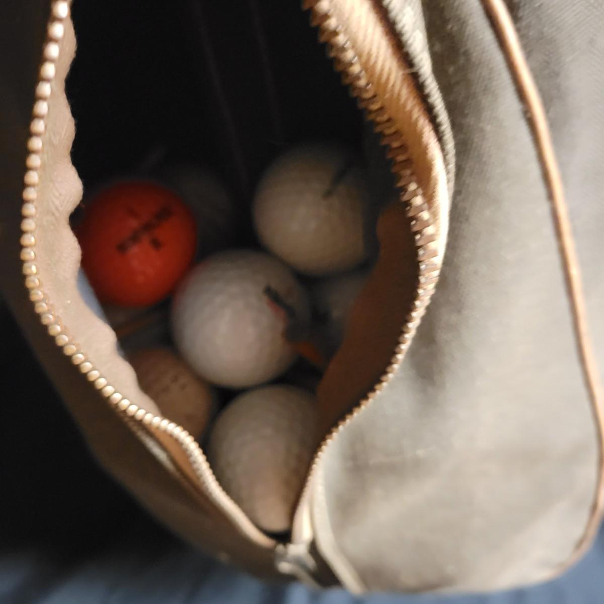 A golf bag and clubs in good condition. The bag is made by Dunlop and is made of canvas with leather accents. This bag has one large pocket stuffed with balls. Nine clubs are included. A five wood made by Golf Pride, six irons made by McGregor that are Sam Sneed Signature clubs and a wedge and 3 iron manufactured by Northwestern that are Bruce Crampton professional clubs. The five wood has a shaft length of 39" and the four iron has a shaft length of 35". Irons do have some rust and there is some wear and tear from use. Local pickup only