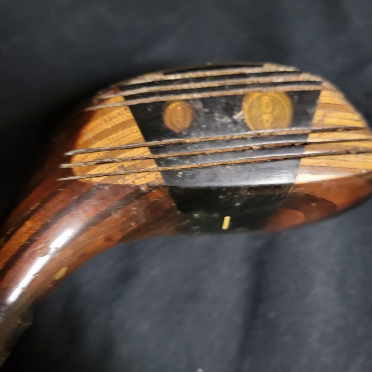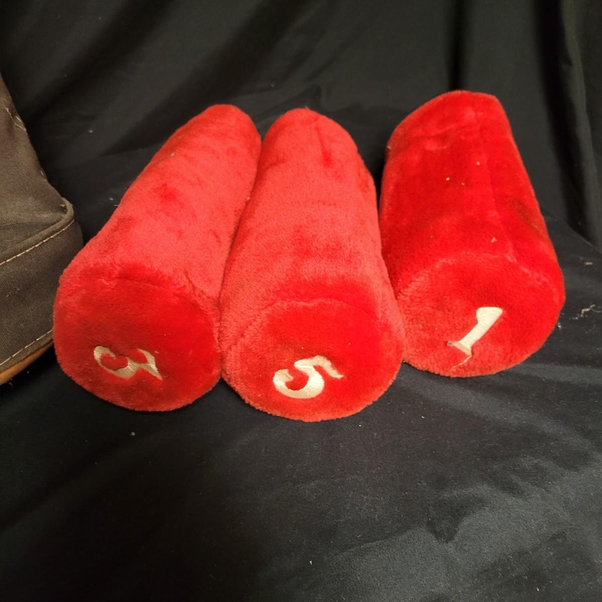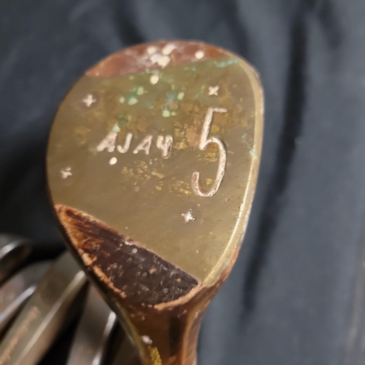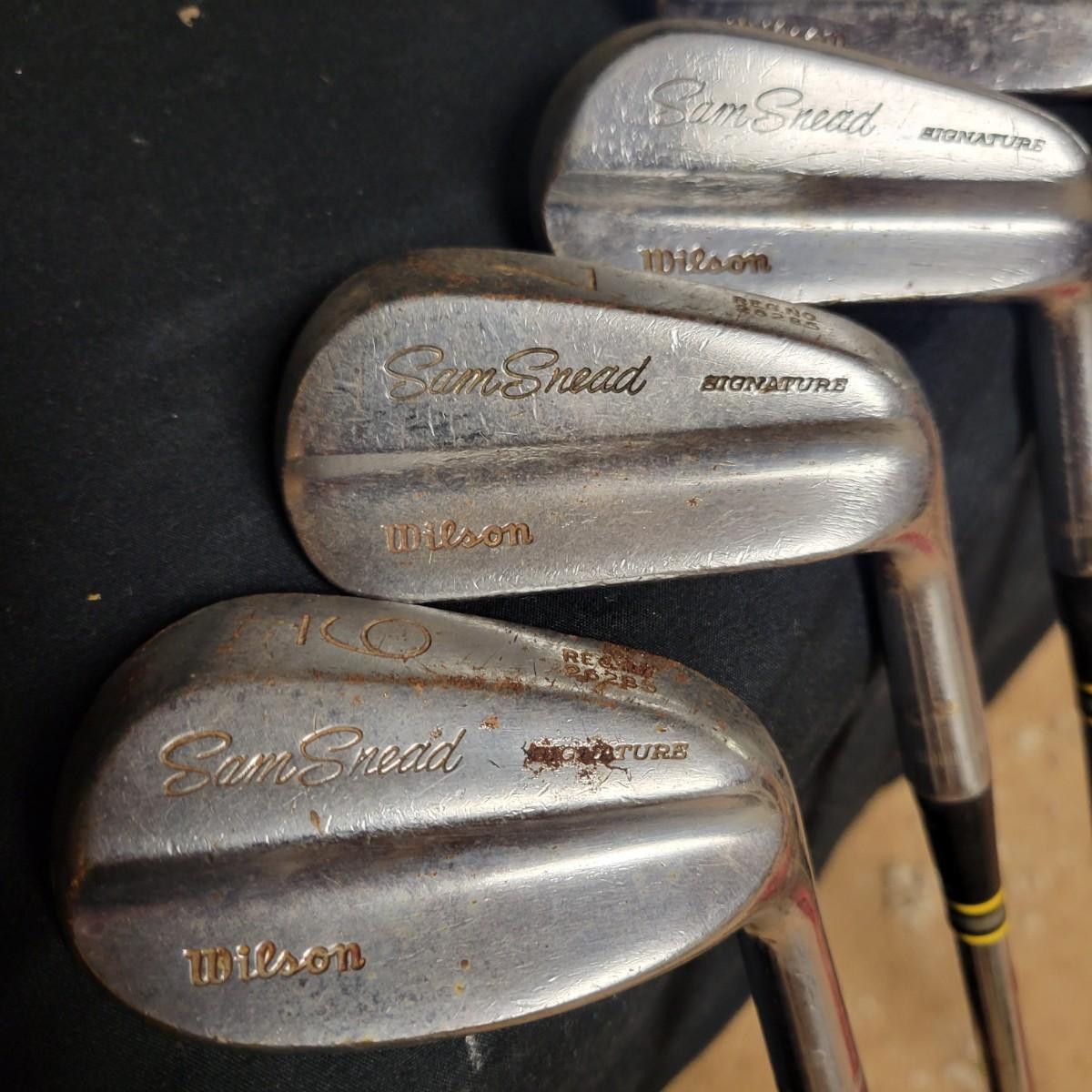 A golf bag and clubs in good condition. The bag is made by Dunlop and is made of canvas with leather accents. This bag has one large pocket stuffed with balls. Nine clubs are included. A five wood made by Golf Pride, six irons made by McGregor that are Sam Sneed Signature clubs and a wedge and 3 iron manufactured by Northwestern that are Bruce Crampton professional clubs. The five wood has a shaft length of 39" and the four iron has a shaft length of 35". Irons do have some rust and there is some wear and tear from use. Local pickup only