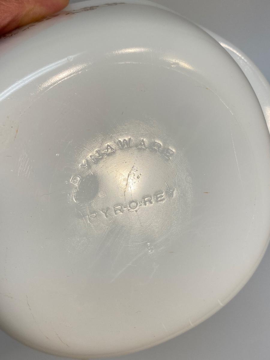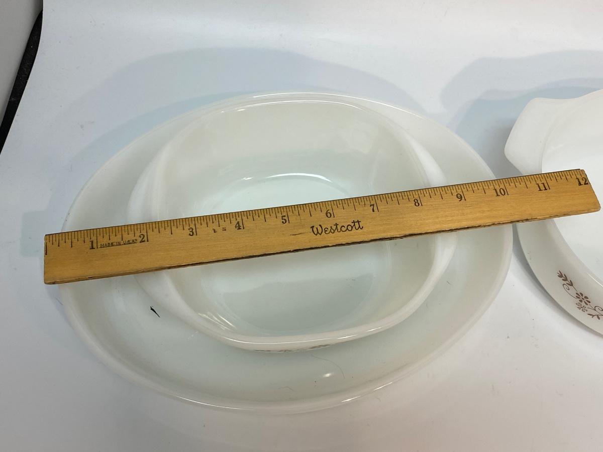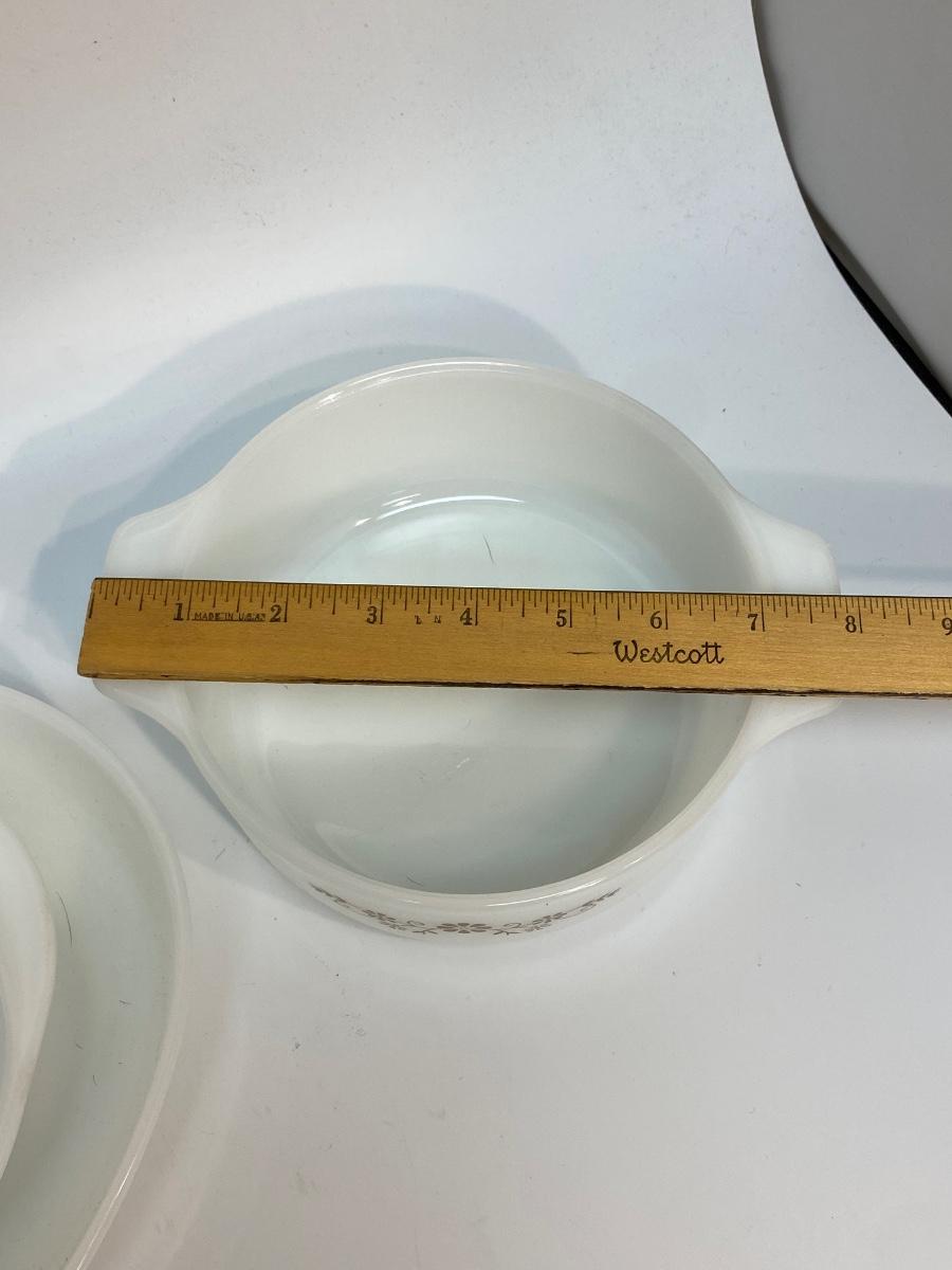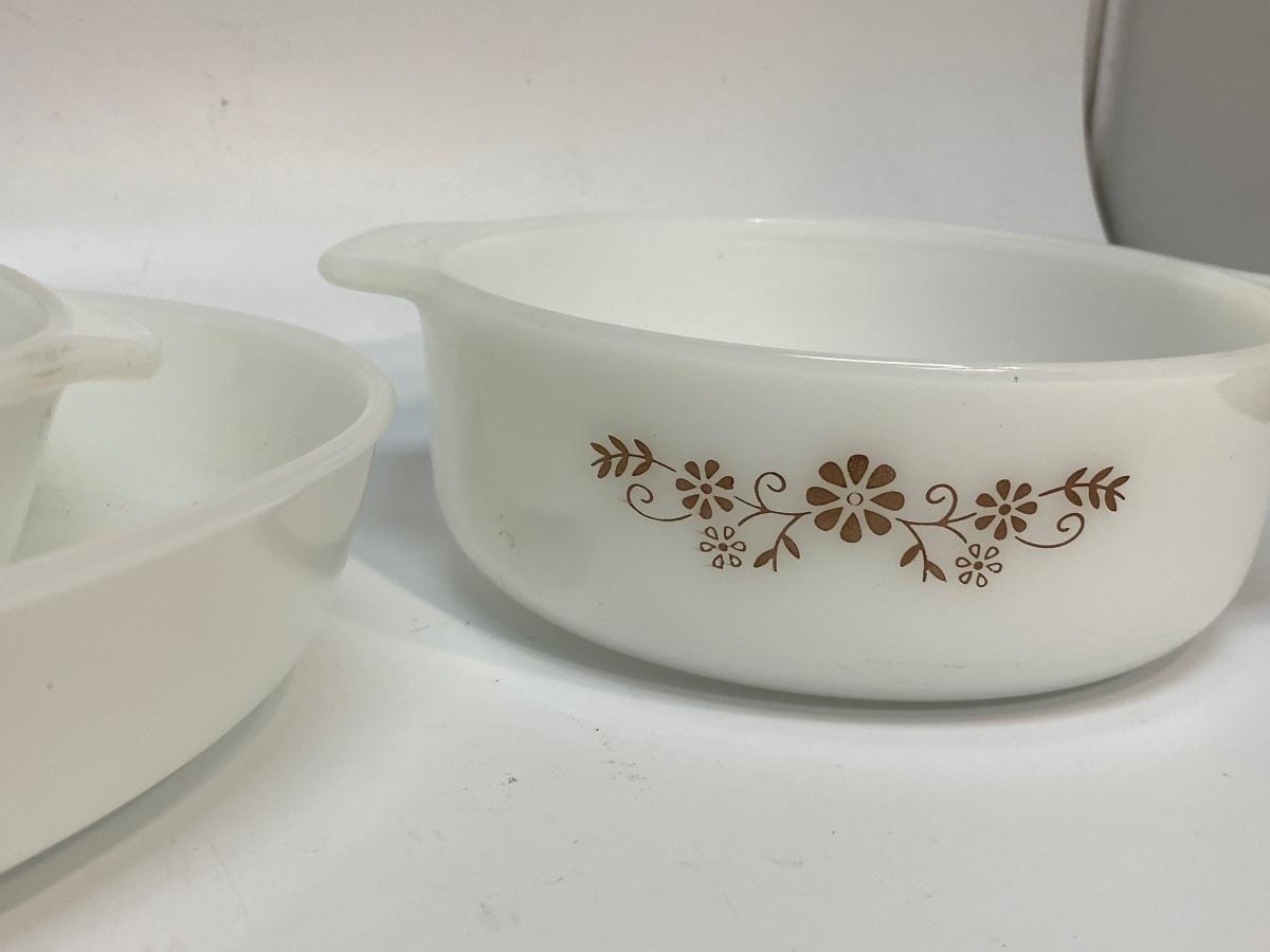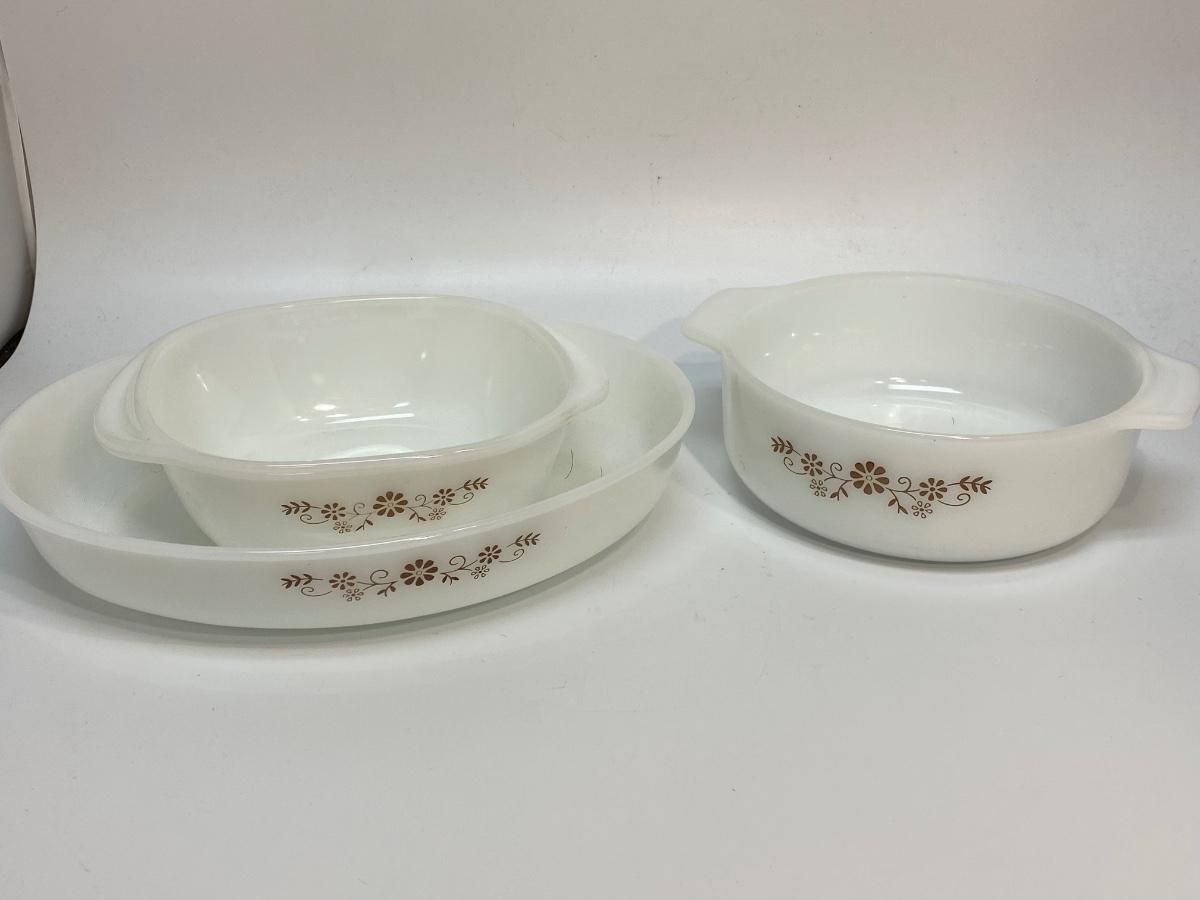 Three piece set of Dynaware Pyr-o-rey casserole dishes, Dynaware's version of Pyrex. White with brown flower pattern. In good condition. Shallow oval dish and two small handled dishes.