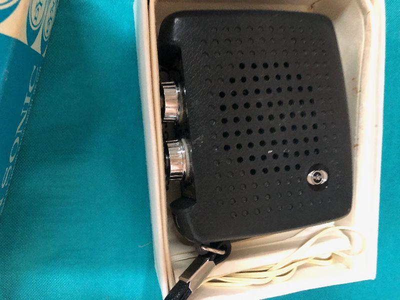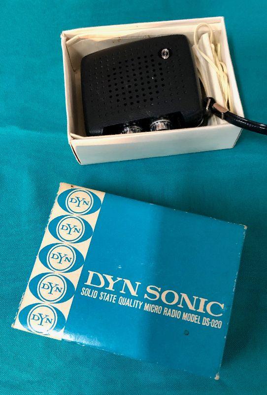 New in the box here is a collectible vintage DYN SONIC solid state transistor micro radio....