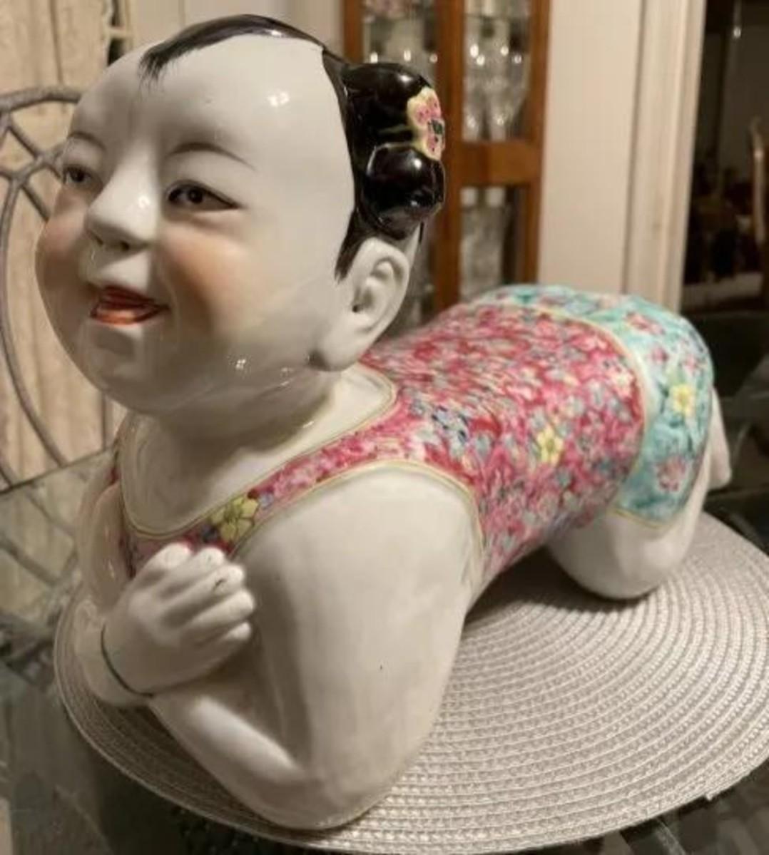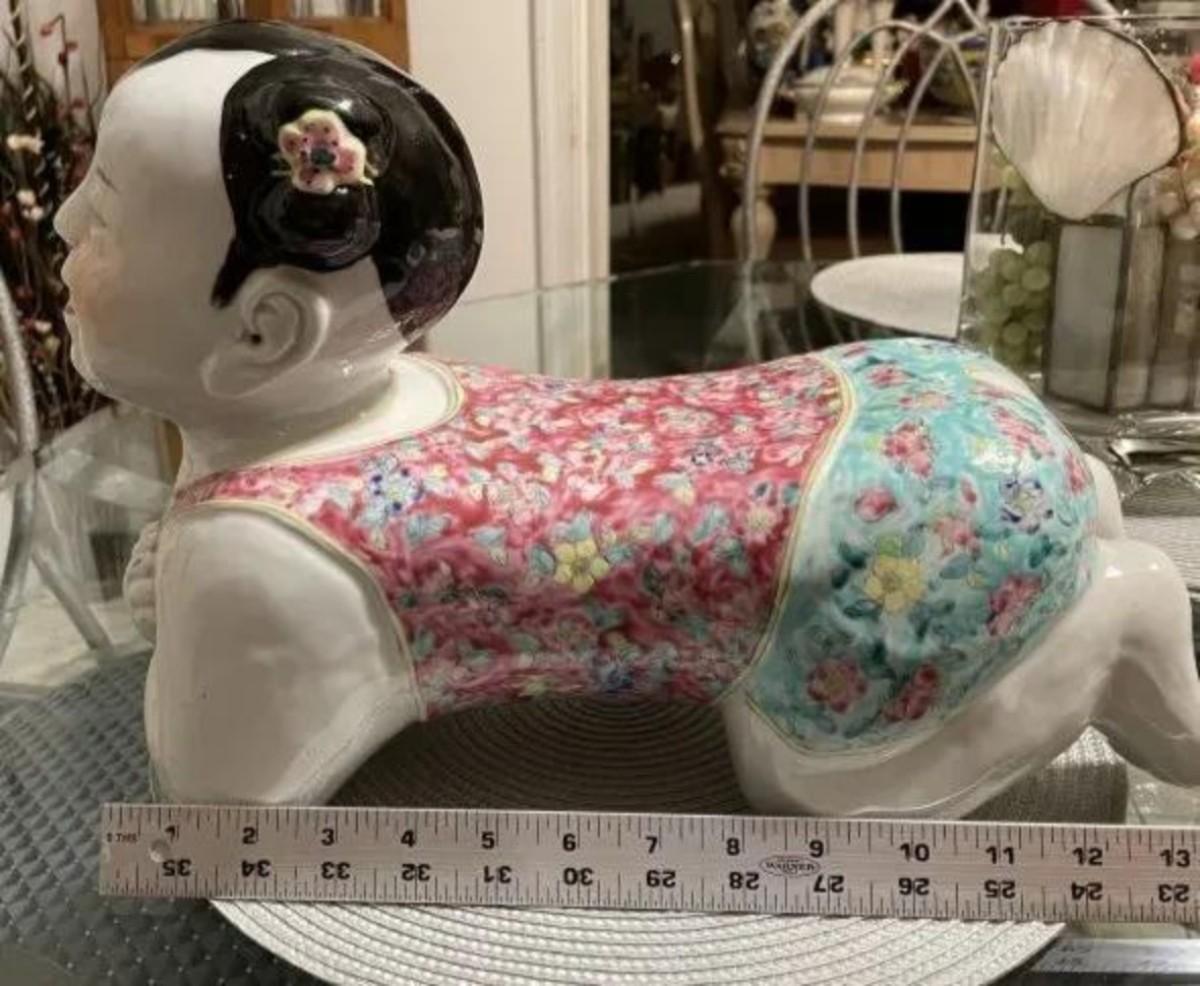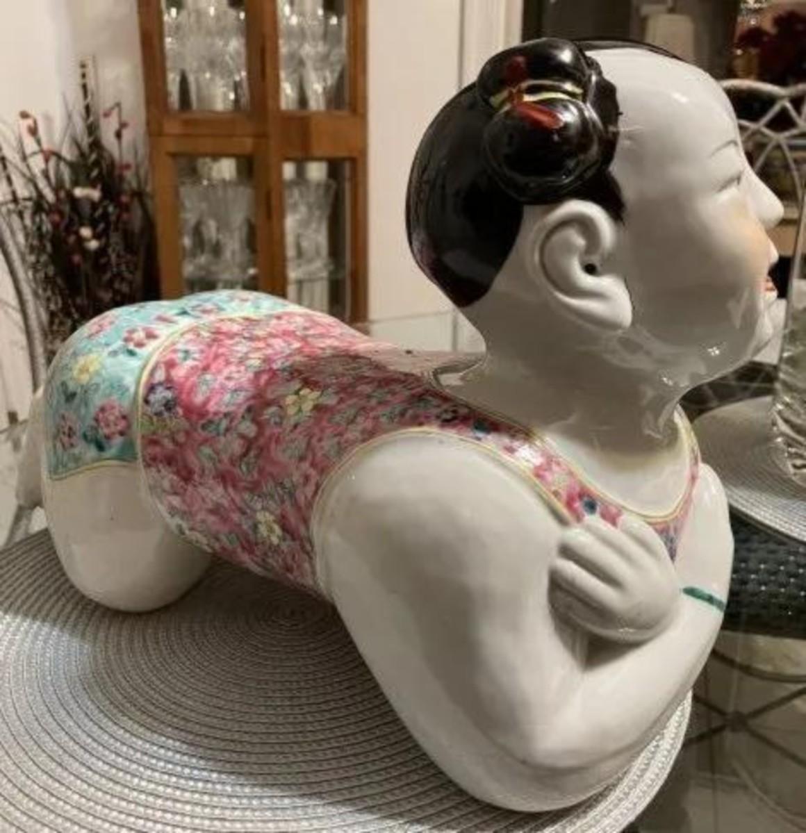 Vintage Earlier SIGNED BASE Chinese Famille Porcelain Baby Child/Girl Opium Pillow Art Statue Sculpture 14" Long as Pic'd. Heavy Piece. (Pickup Only in Berlin, NJ 08009)
