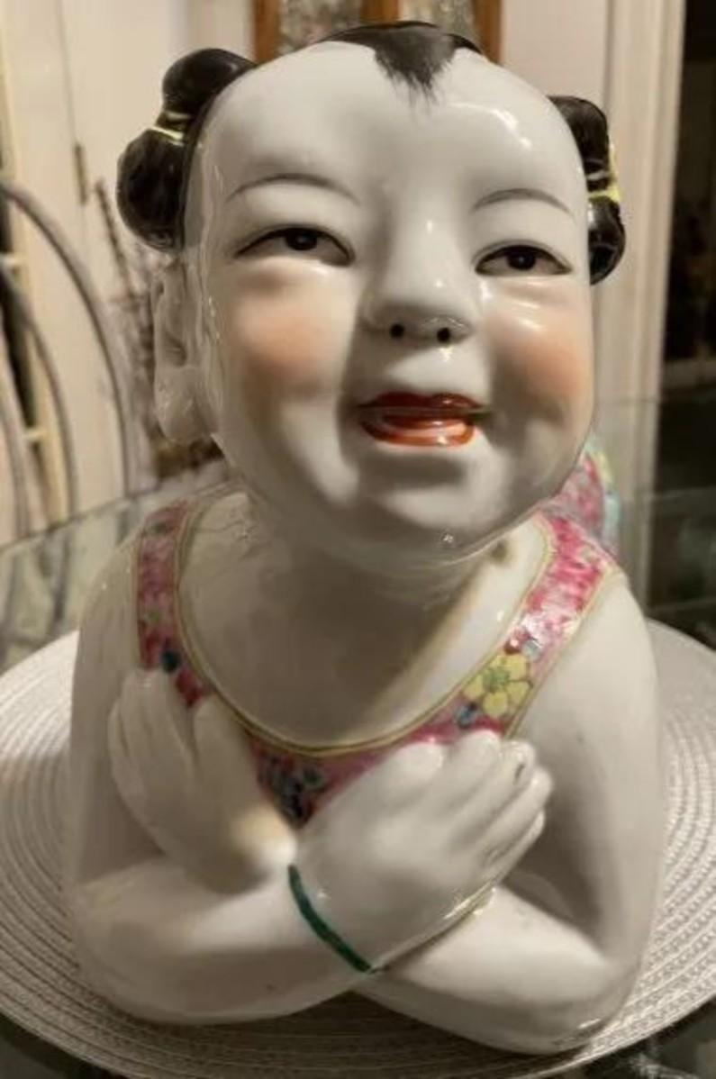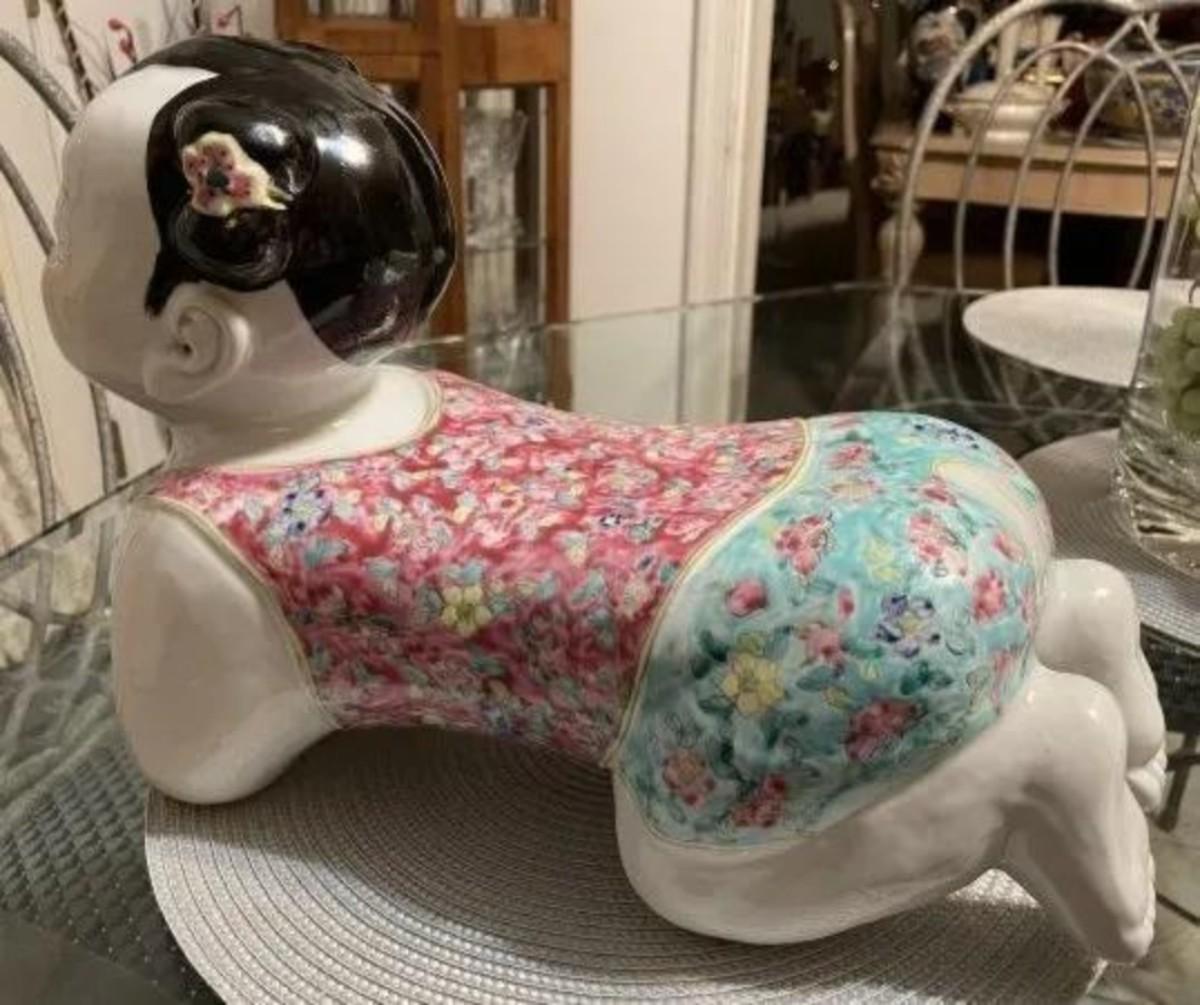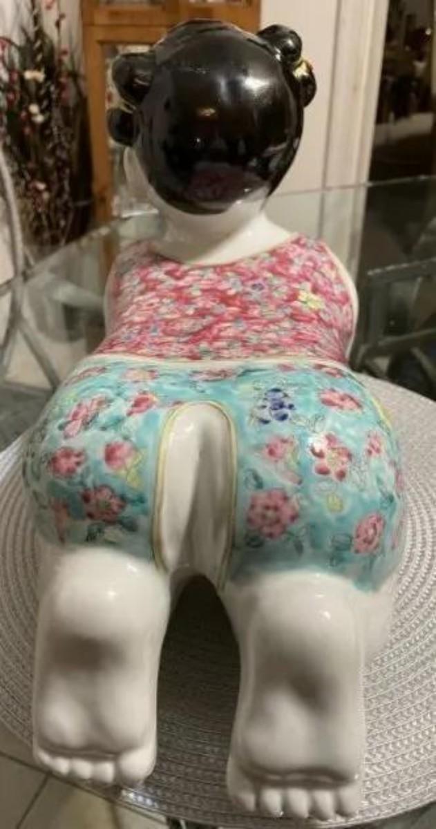 Vintage Earlier SIGNED BASE Chinese Famille Porcelain Baby Child/Girl Opium Pillow Art Statue Sculpture 14" Long as Pic'd. Heavy Piece. (Pickup Only in Berlin, NJ 08009)