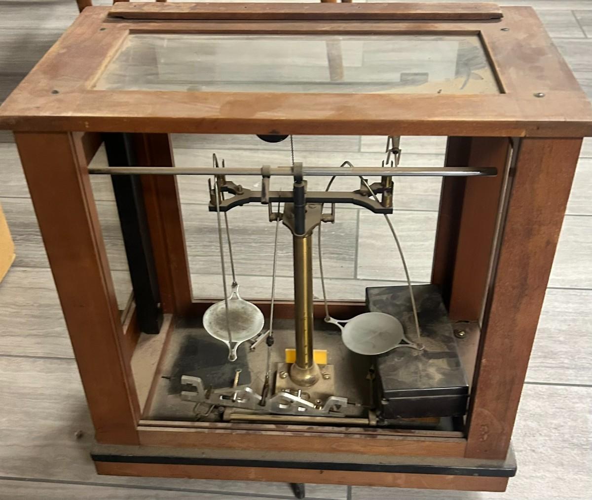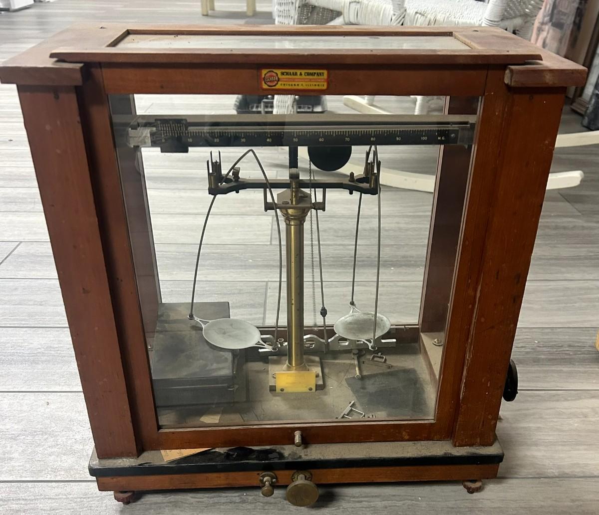 This vintage scale seems to have all of the pieces, just may need a little TLC from a collector or appreciates antique equipment.