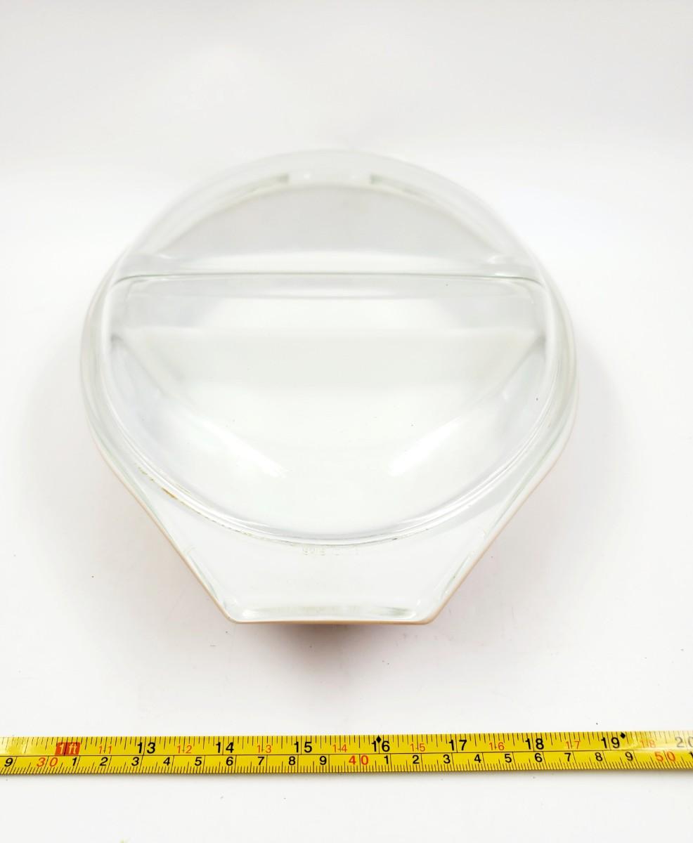 Early American pattern, divided Pyrex dish with lid, 1.5 qt good overall condition