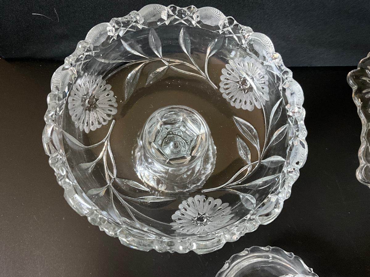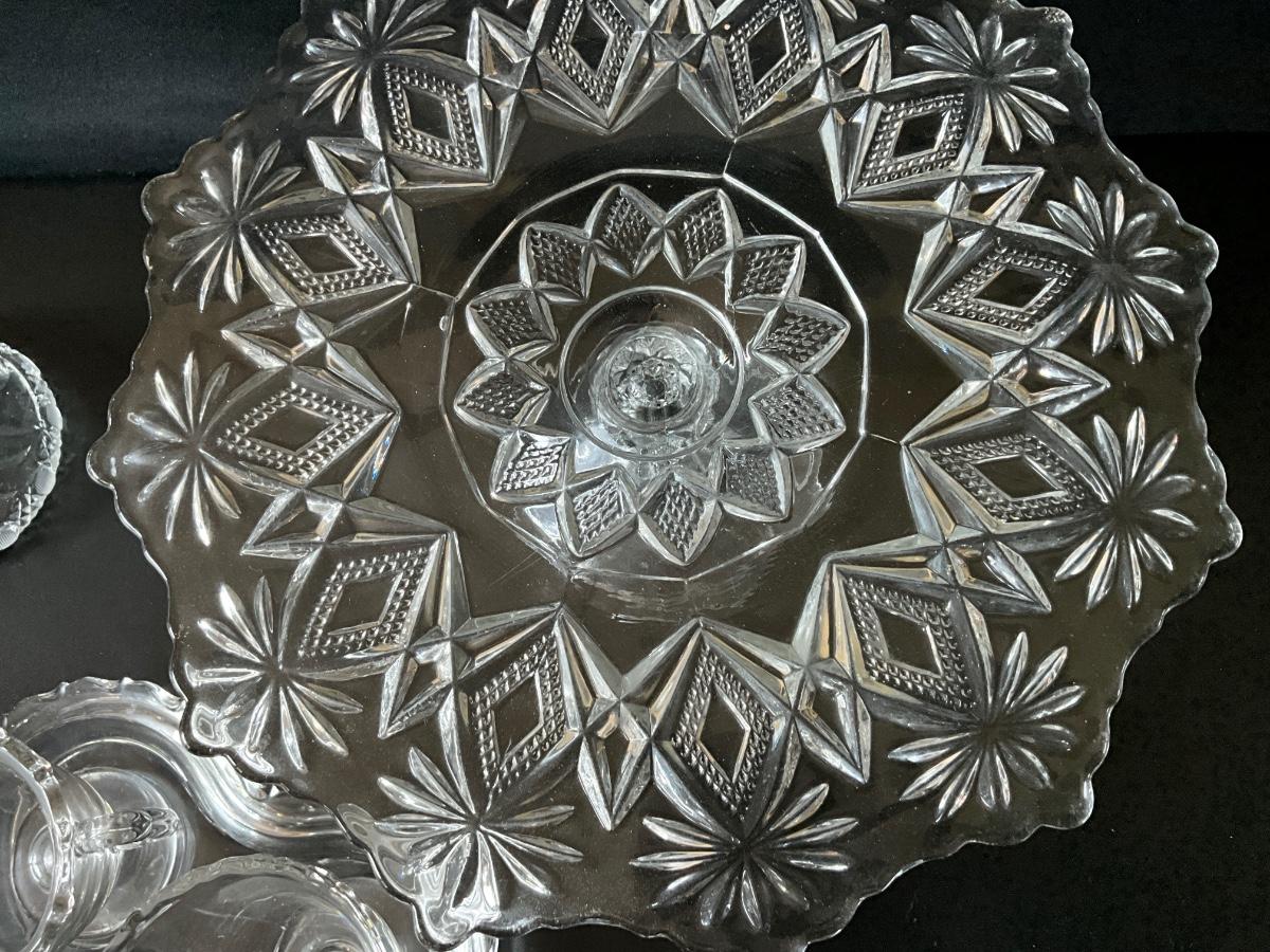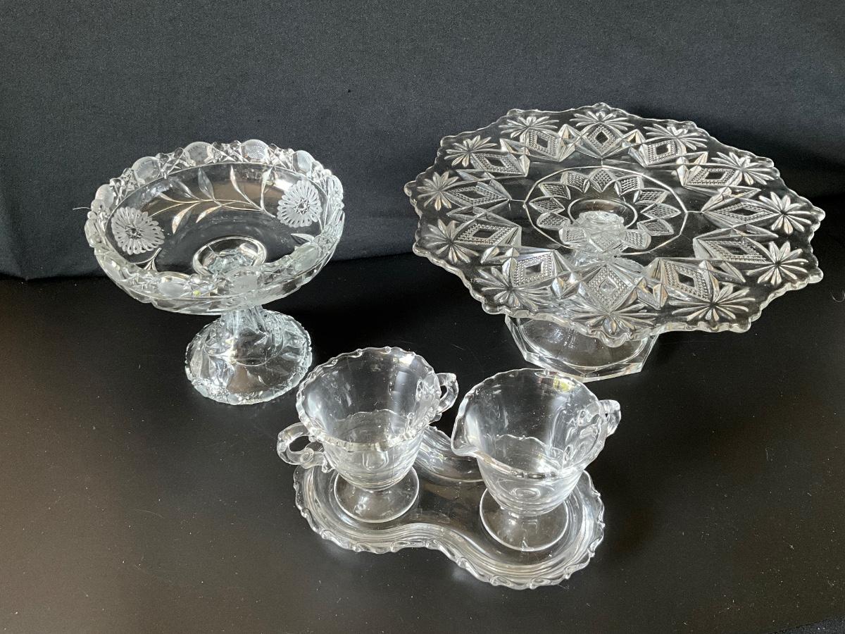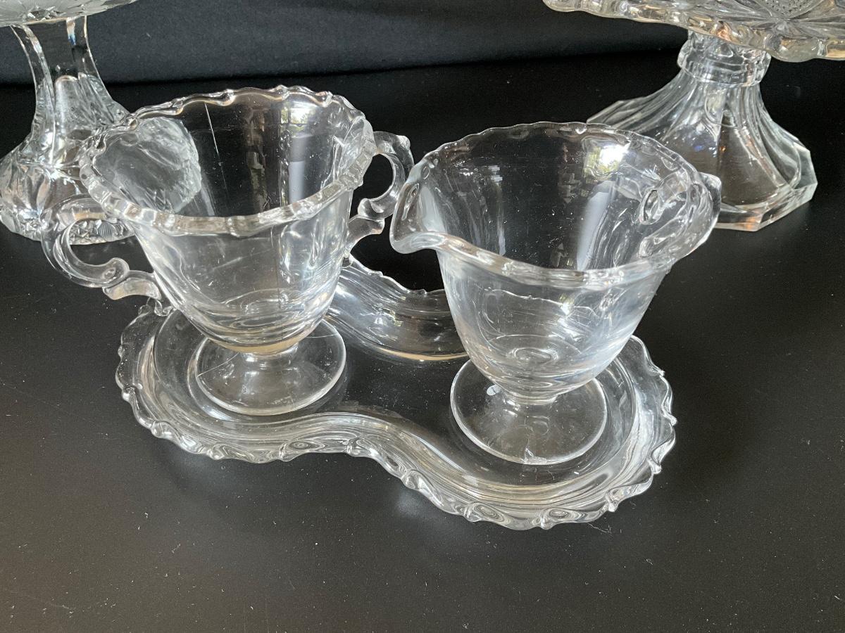 Vintage Early American pressed glass cake stand, Candy Dish, Candlewick Sugar/Creamer