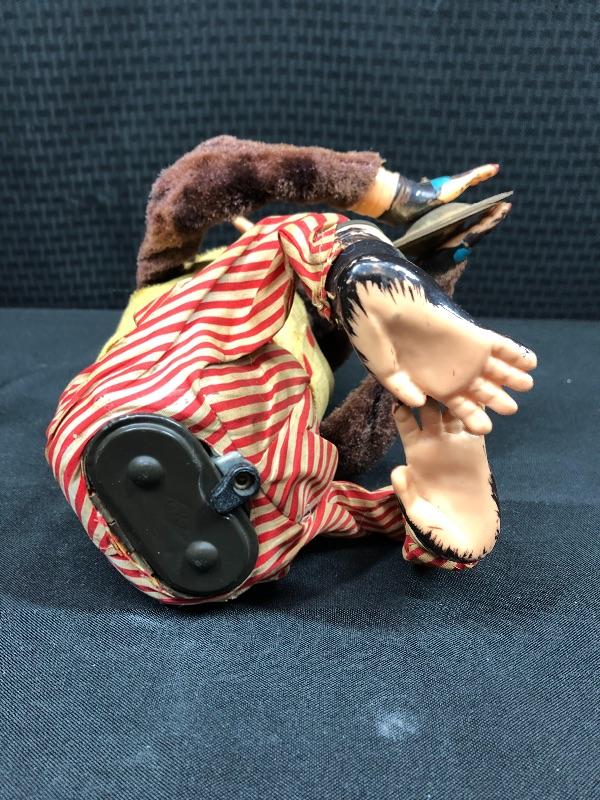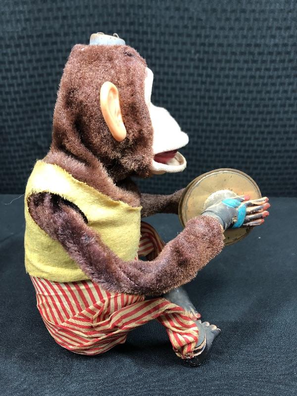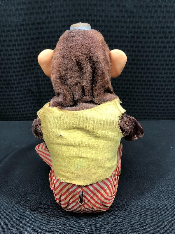 Vintage JOLLY CHIMP, mechanical cymbal playing monkey. He is a little worn which makes him a bit creepy looking. Did put a couple batteries in him but he did not work, not sure if it was bad batteries or just not working. Displays great under 12" size. If you push the top of his head his arms do move.
