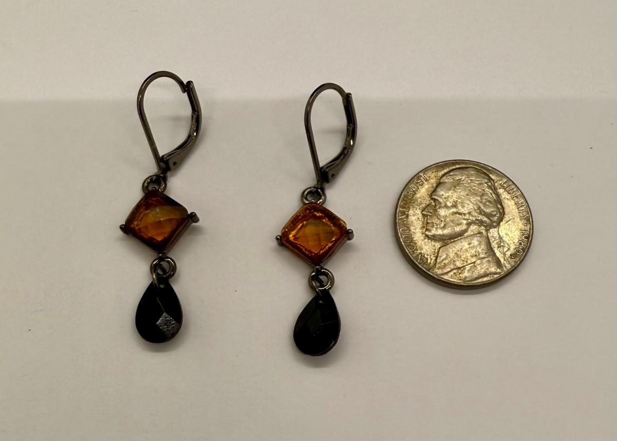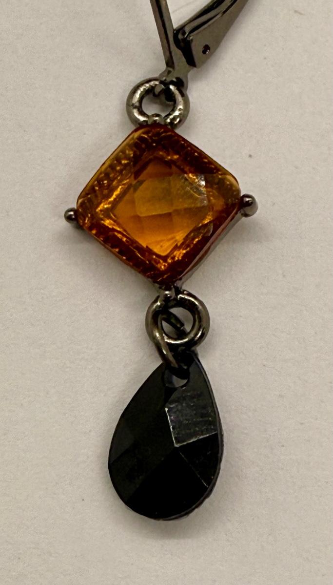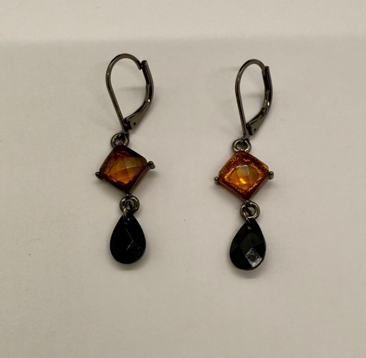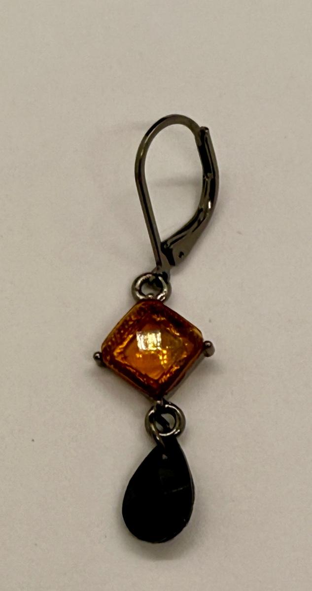 For pierced ears, has a diamond-shaped translucent amber stone above a dark teardrop. Good condition.