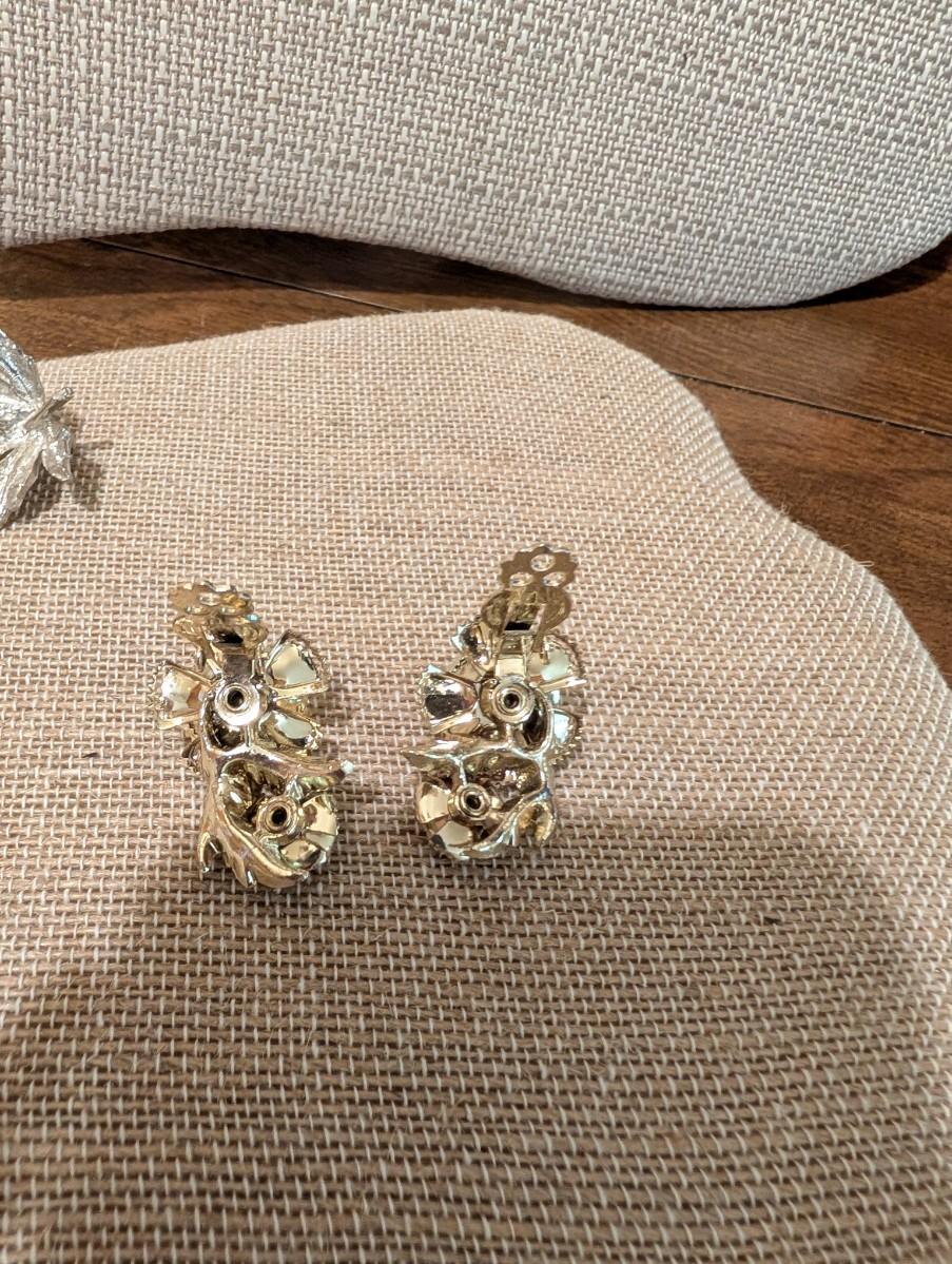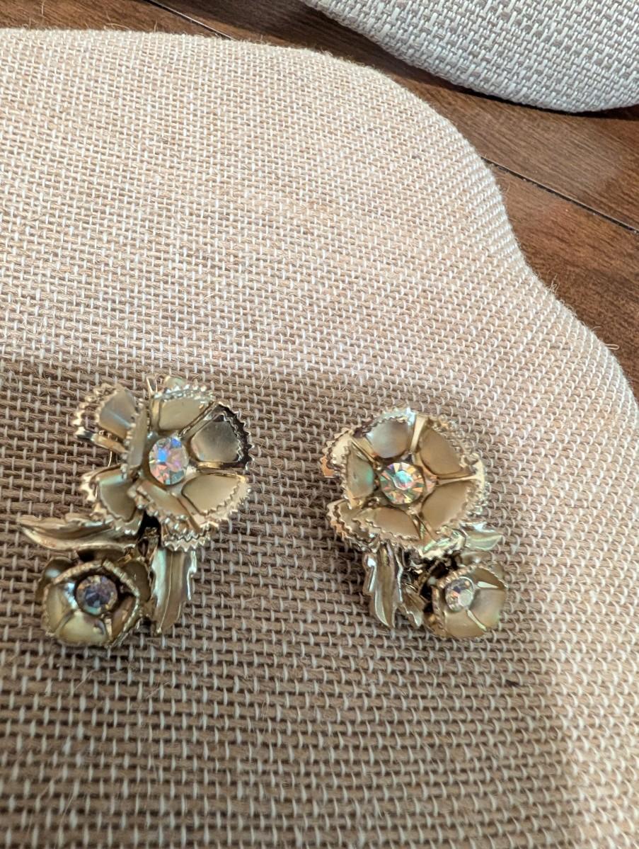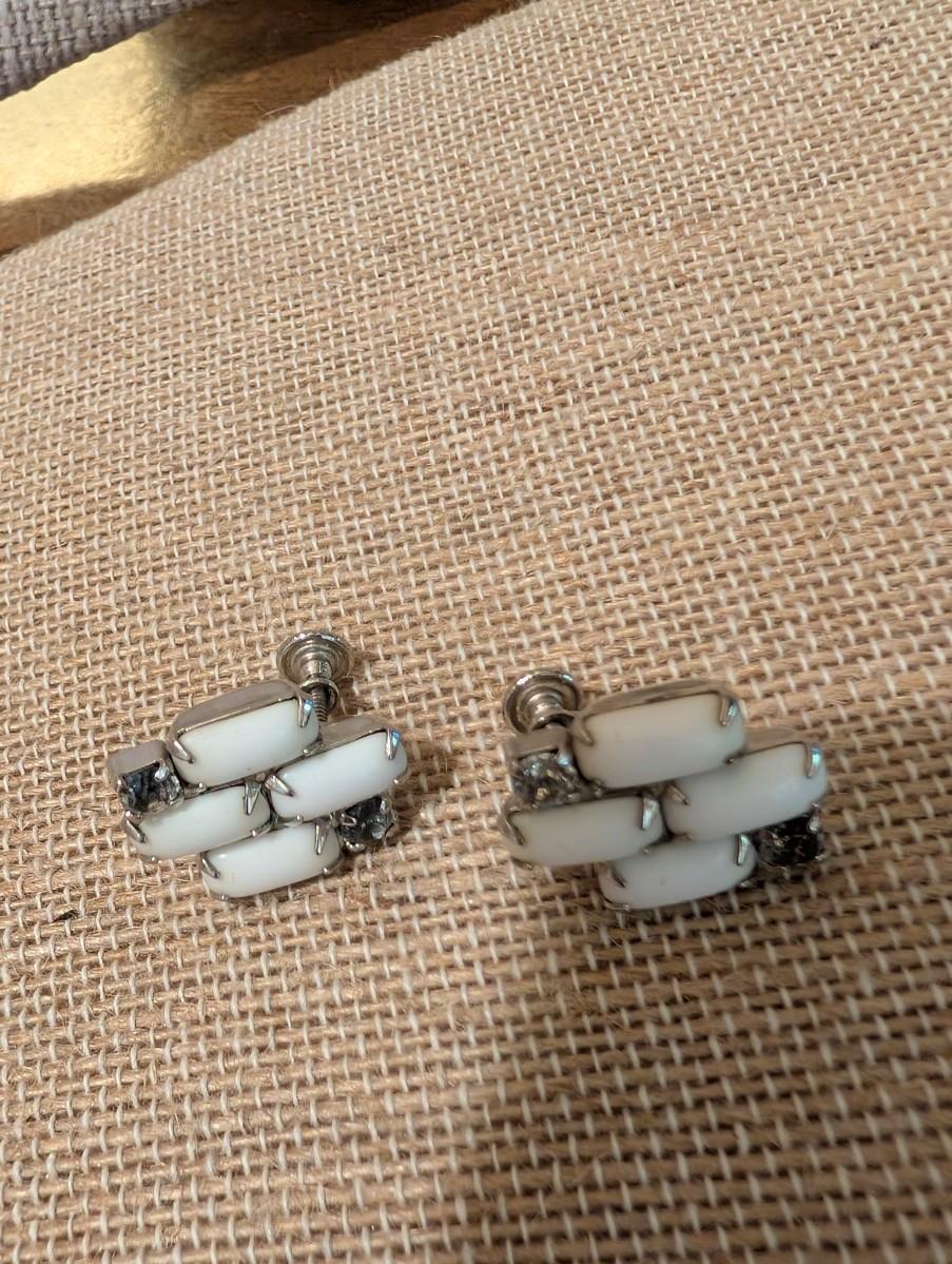 White milk glass in rhinestone screw on earrings, vintage rhinestone gold tone flower clip-on earrings, gold tone clip-on earrings, silver in color clip-on maker Mart Art C