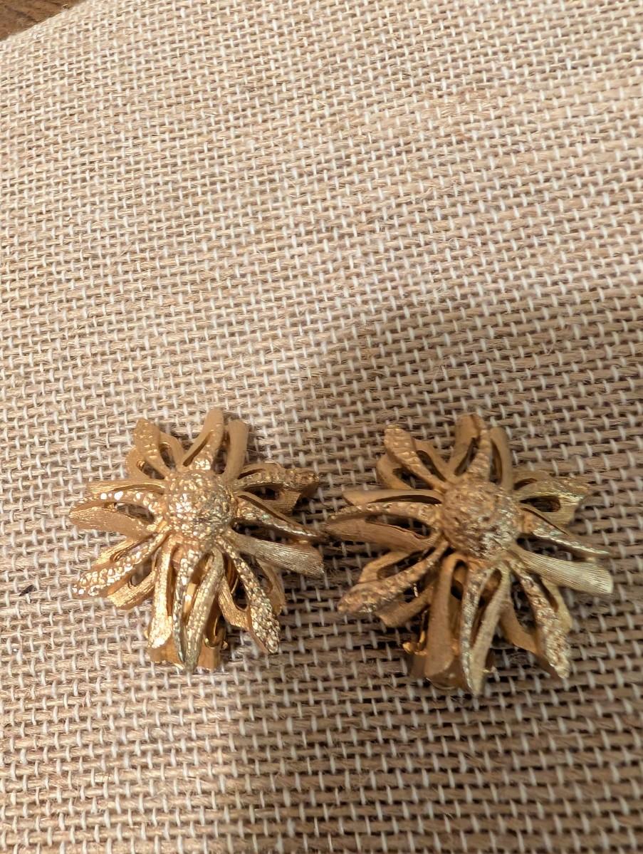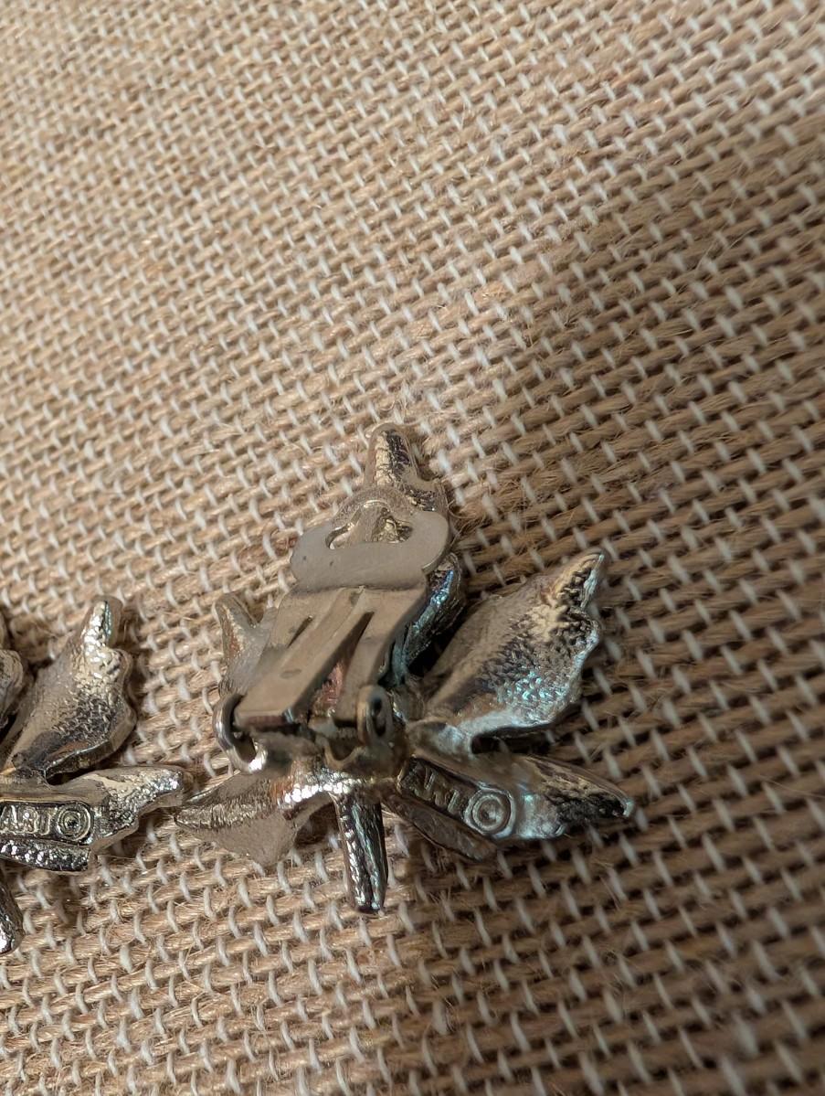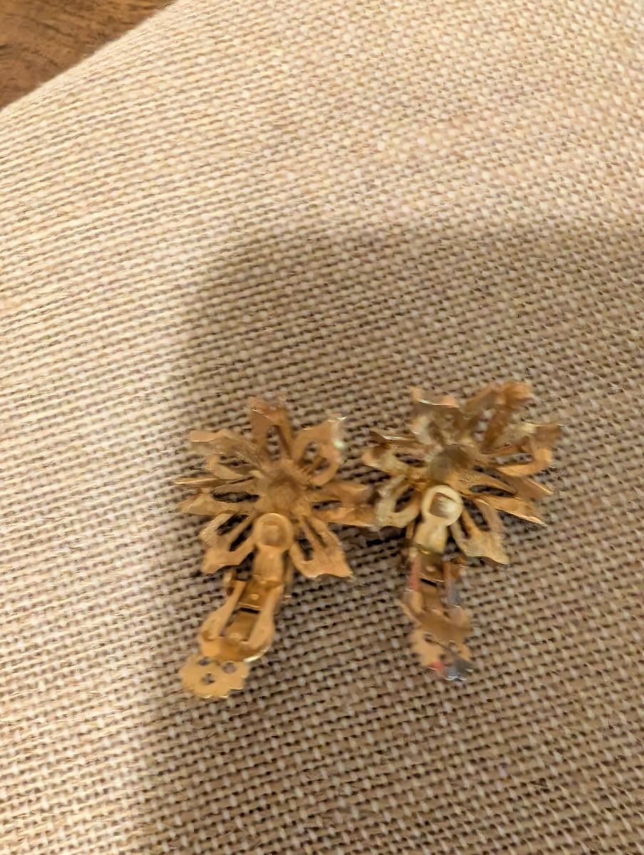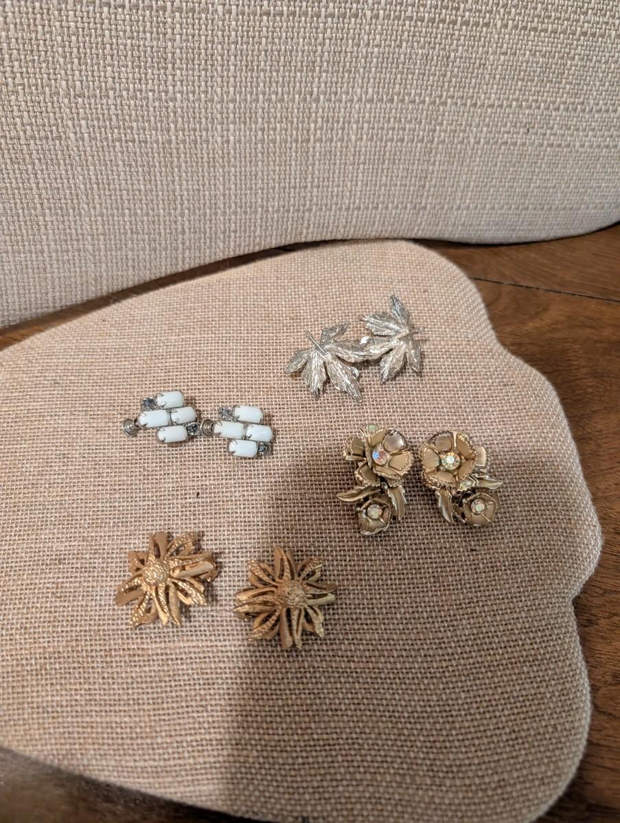 White milk glass in rhinestone screw on earrings, vintage rhinestone gold tone flower clip-on earrings, gold tone clip-on earrings, silver in color clip-on maker Mart Art C