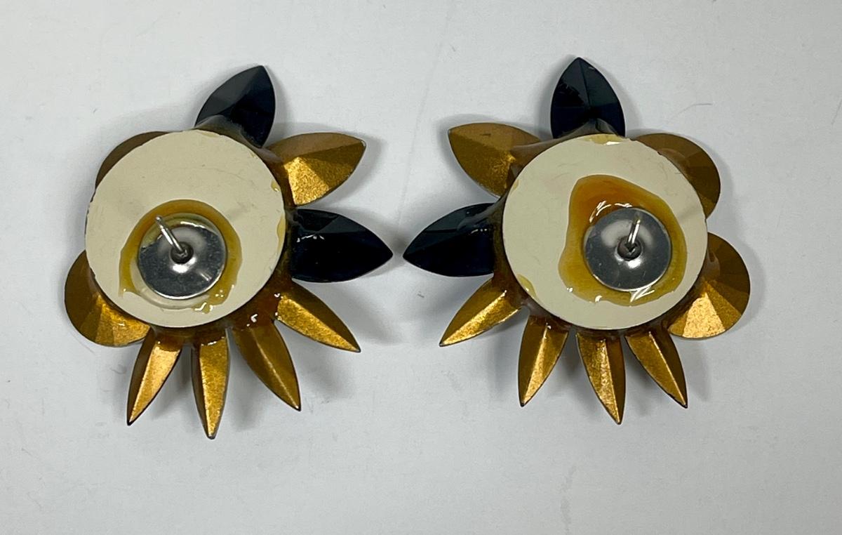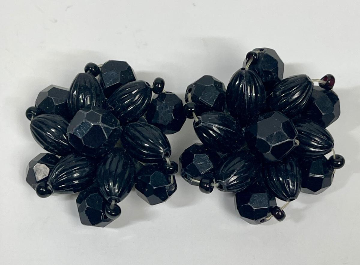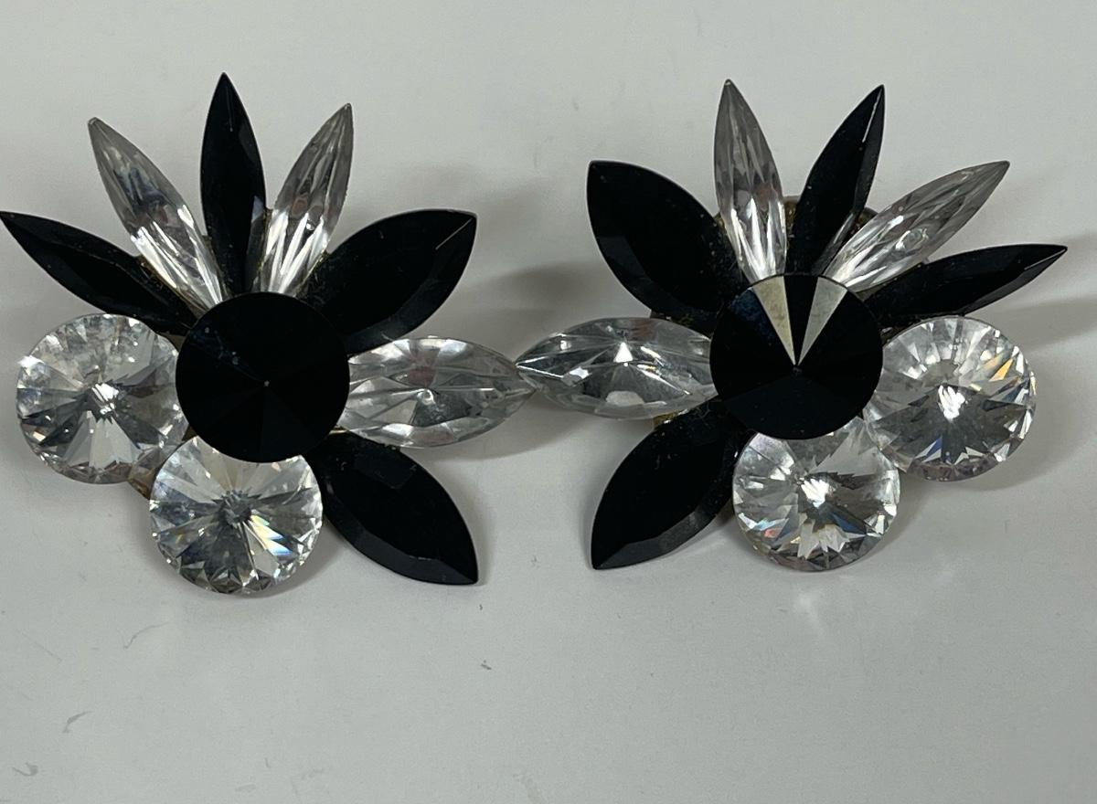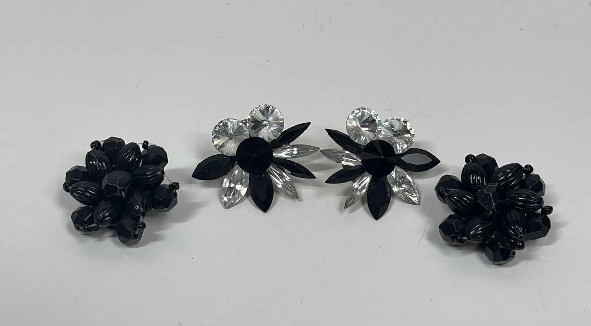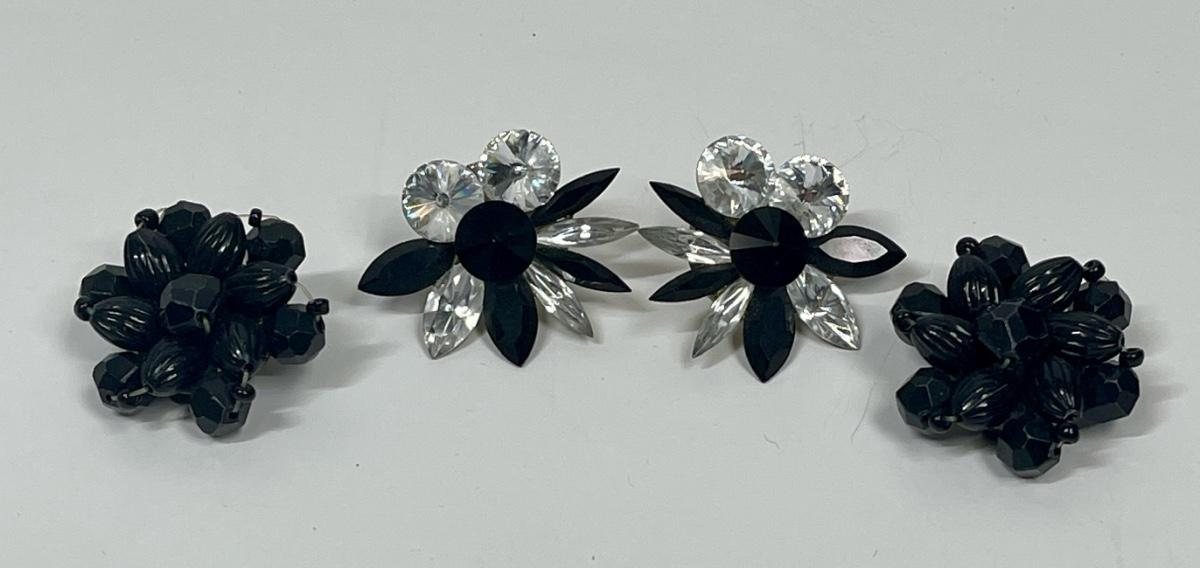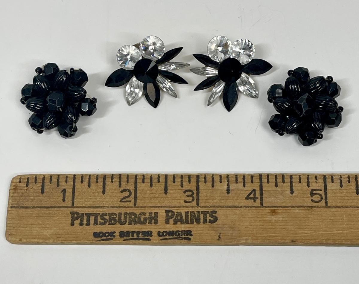 One pair is a clip on dark flower blossom, the other pierced ear pair combines black and rhinestone flowers petals with 2 round rhinestones. In very good vintage condition