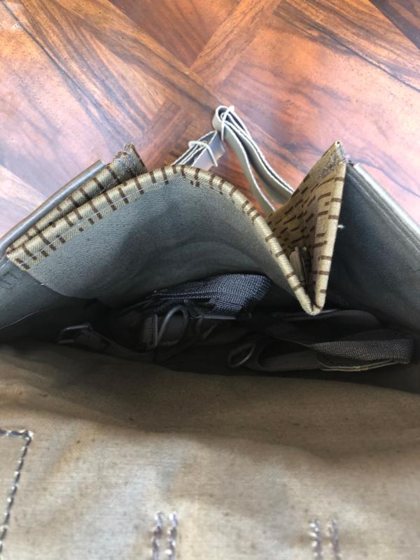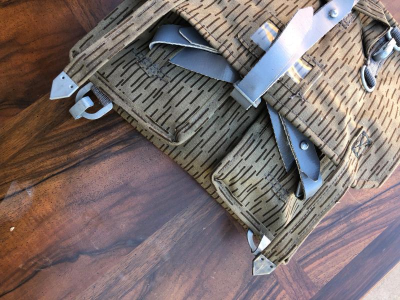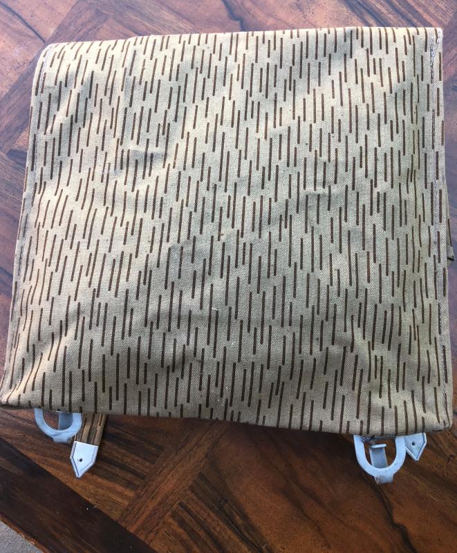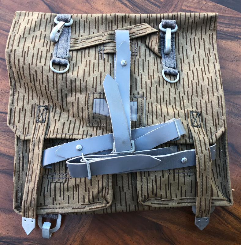 Vintage German Army 1960's Day pack, complete un-used with straps. This East German rain pattern (aka Strichmuster or "line pattern") backpack really packs a punch. It comes with heavy duty grey backpack straps, a handle on top as well as a top strap, and side straps. The backpack straps themselves come with a clip which hangs beneath the pack in the rear and two on the chest for additional load out. Another cool feature is inside the pack there is a waterproof rubberized vinyl liner to keep your gear dry. New condition. Measures 12" x 11".