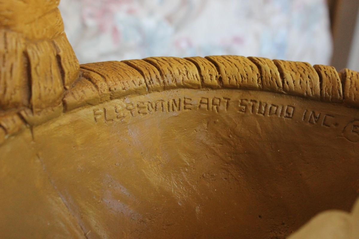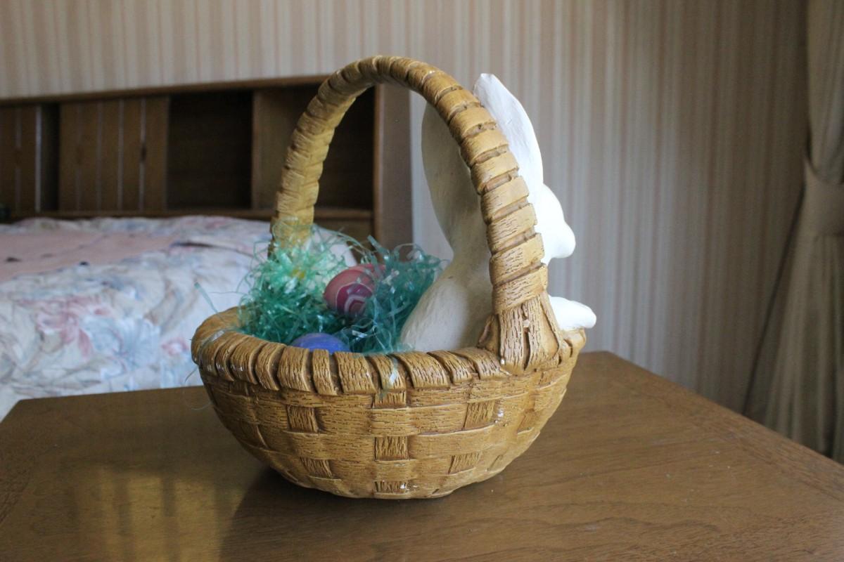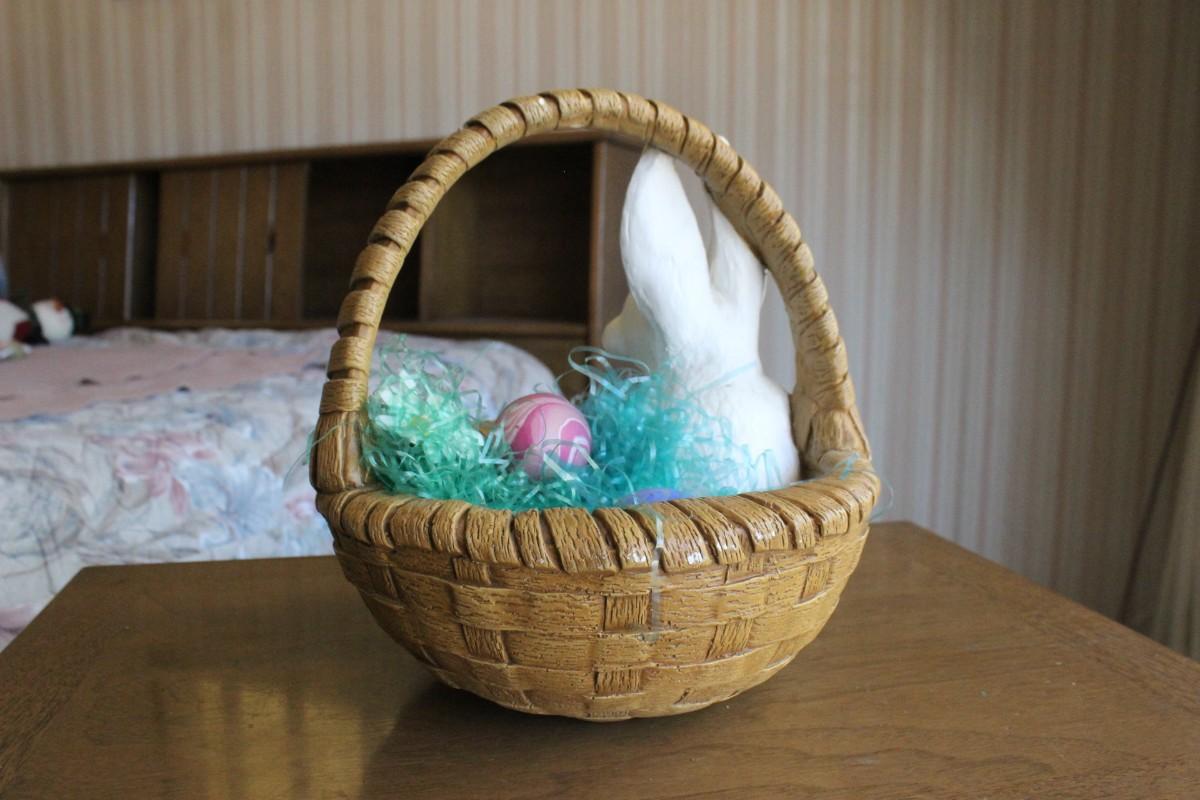 Vintage Easter Bunny in Basket Handmade Pottery, there is no significant chips or cracks to the piece and is in good condition. The basket is signed by the art studio that made it was well as the date that it was created.