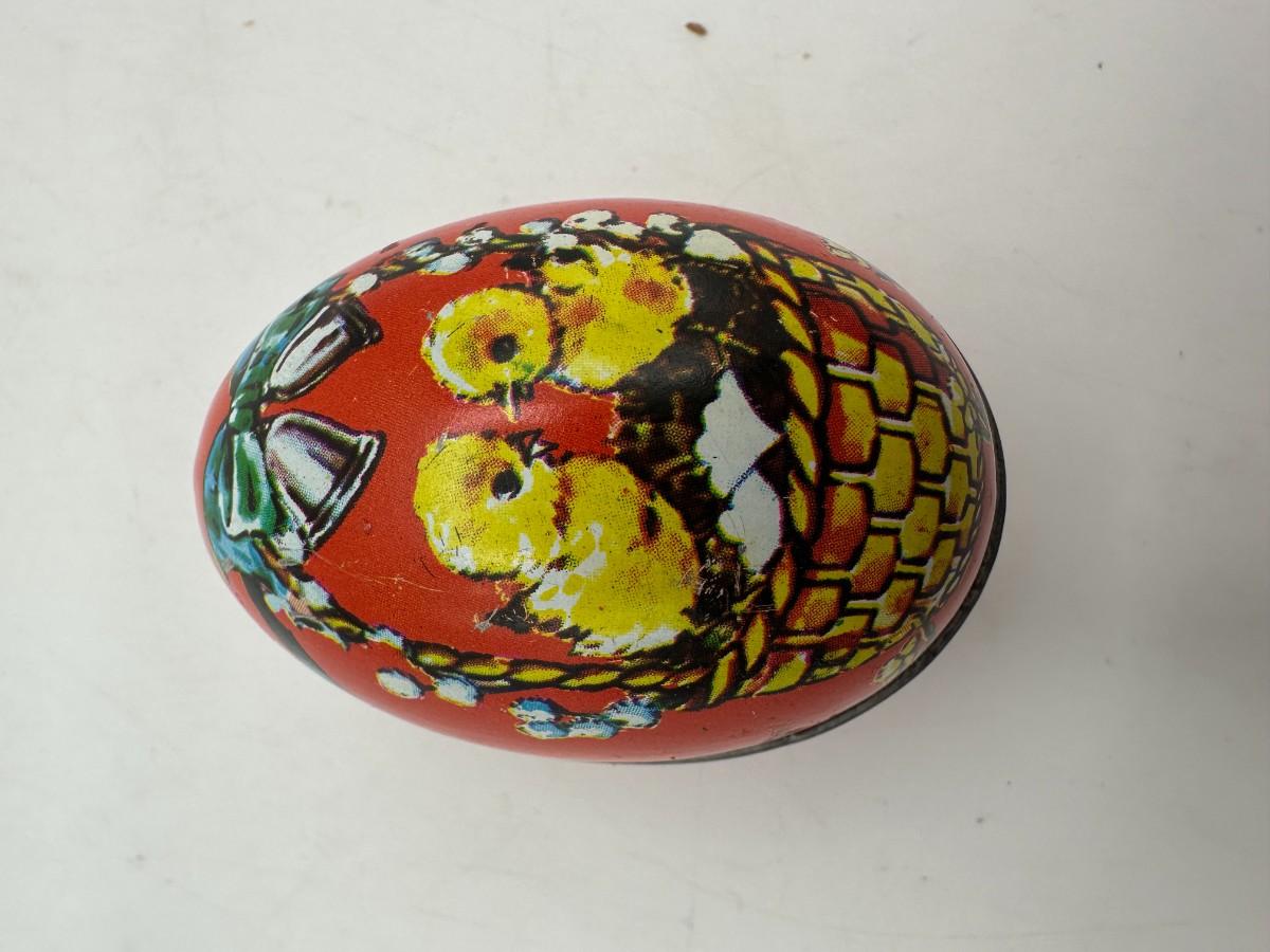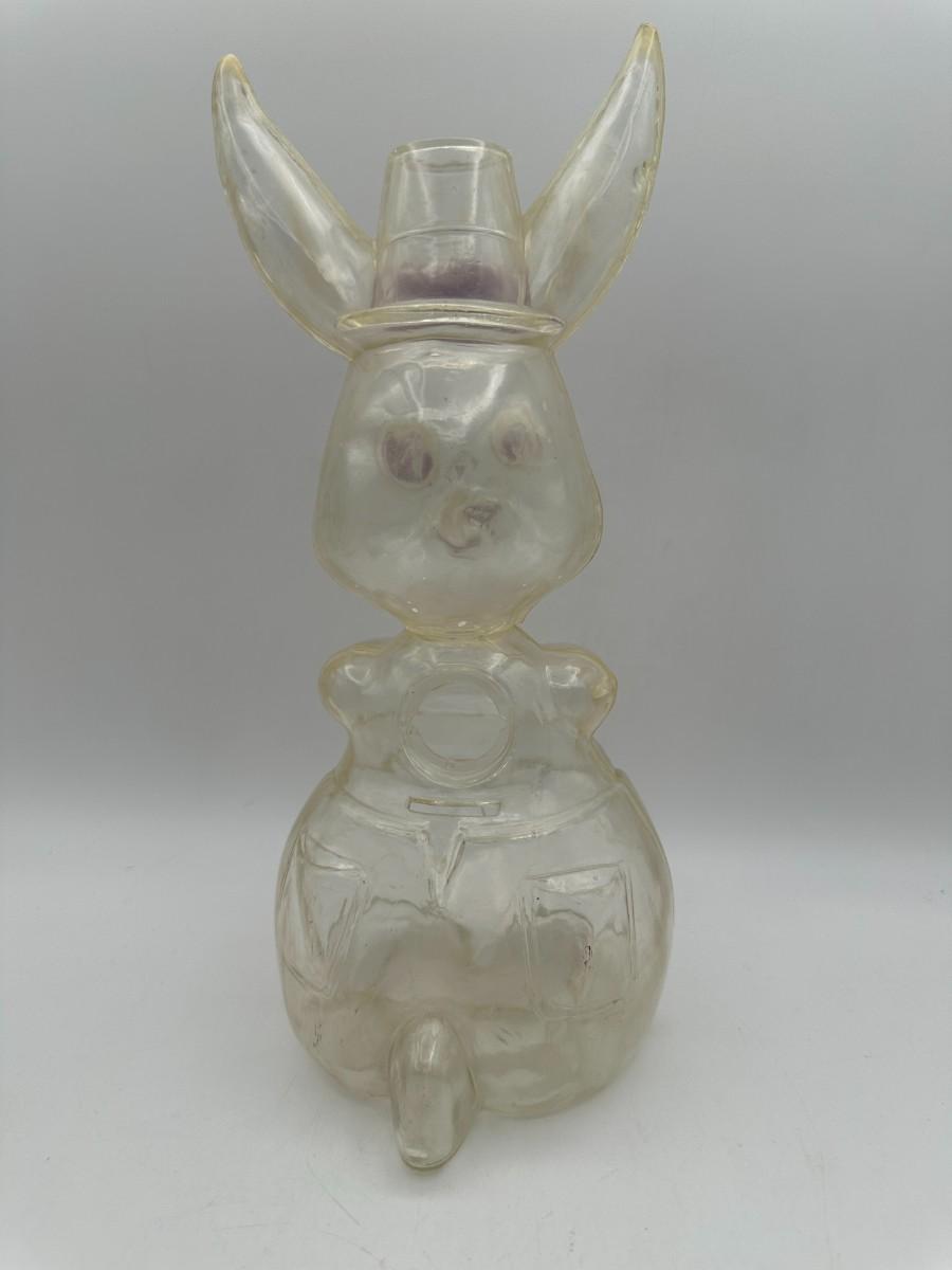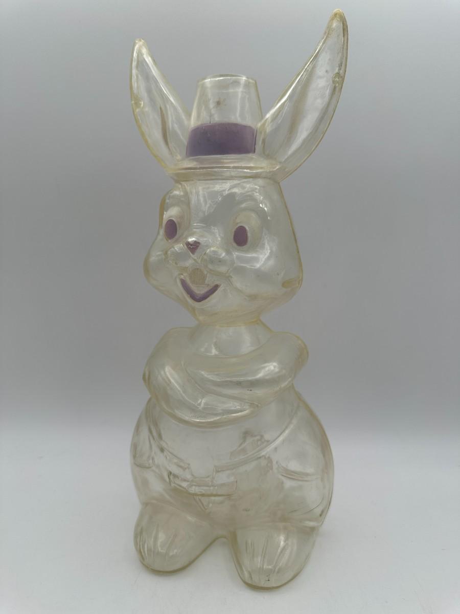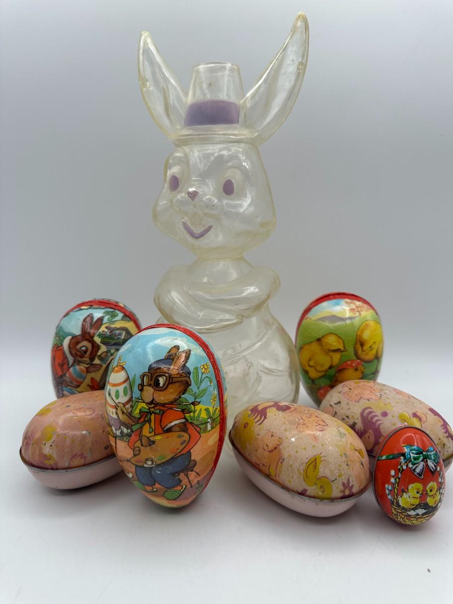 Includes clear plastic bunny bank that is missing stopper and has signs of age. Eggs are made out of paper machete and tin. Predates automatic sprinklers and easier to close than those plastic ones! Vintage, used condition.