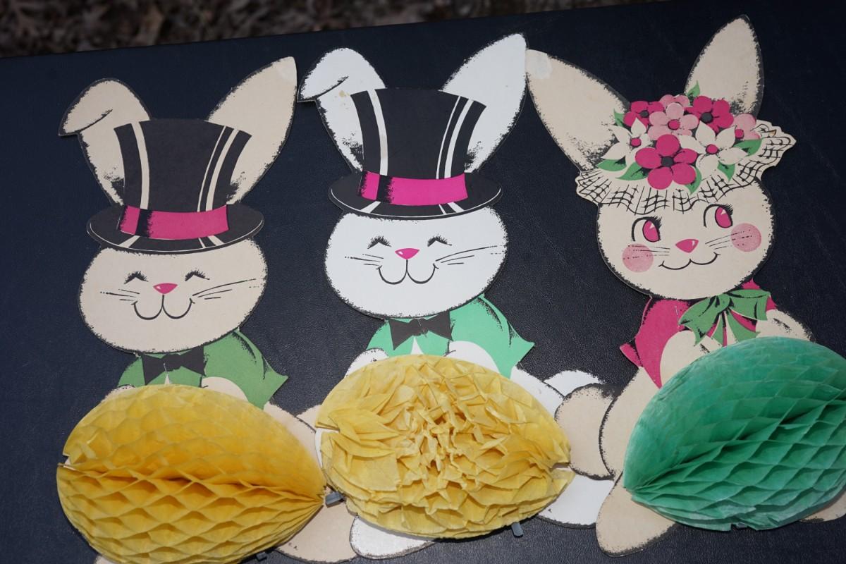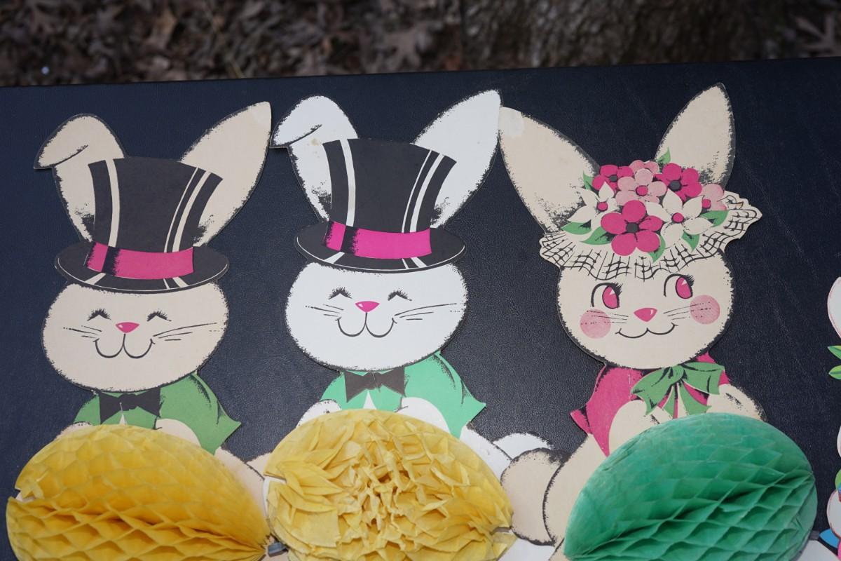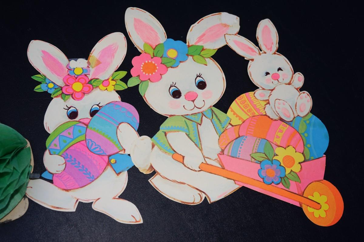 VINTAGE EASTER PAPER DECORATION CUT OUTS OF RABBITS W/ THE FOLD OUT PAPER EGGS