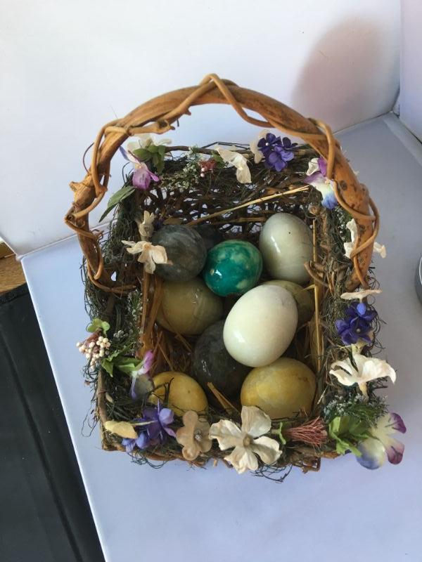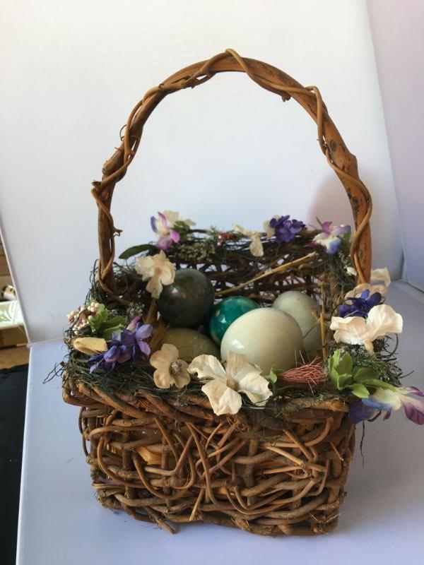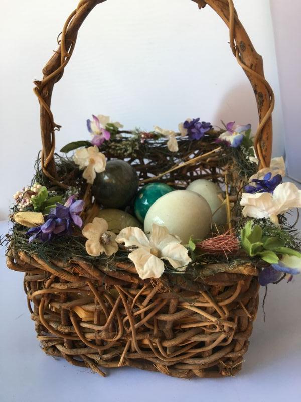 Vintage Easter Wicker Basket with Ceramic Eggs