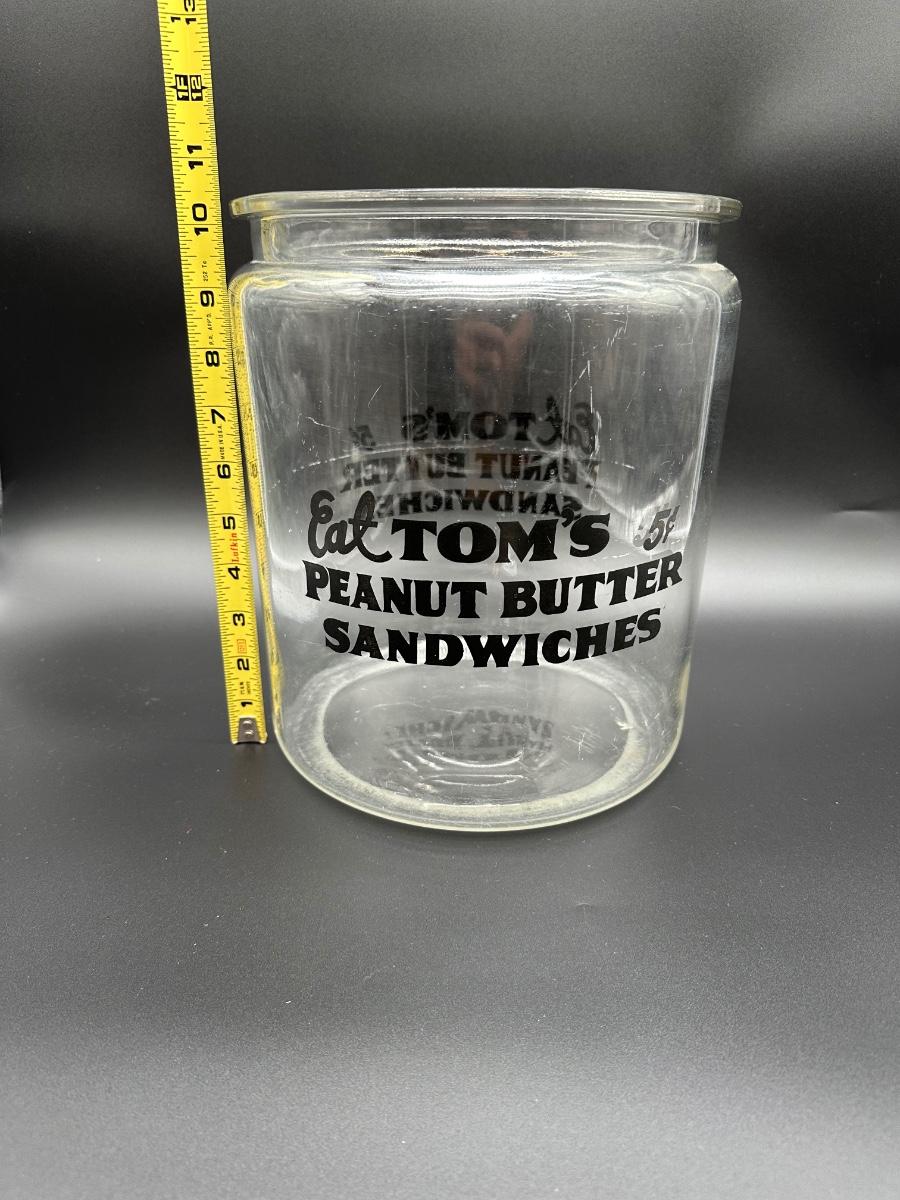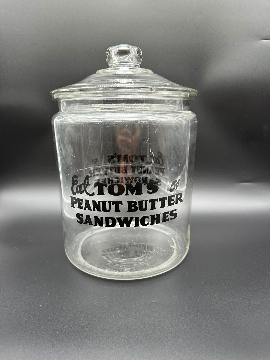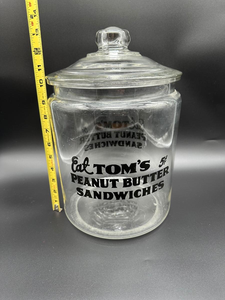 Vintage Eat Tom’s Peanut Butter Sandwiches Glass Countertop Display Jar w/ Lid