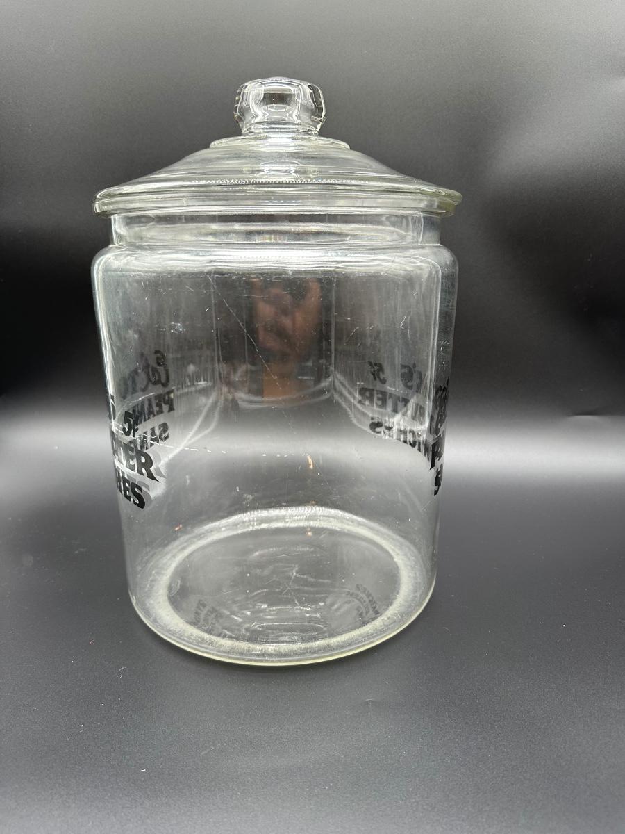 Vintage clear glass advertising jar for Eat Tom’s Peanut Butter Sandwiches (5¢). Large countertop display style with original black lettering and matching glass lid. Heavy, thick glass with great old advertising presence. Perfect for kitchen décor, general store display, or vintage advertising collection.