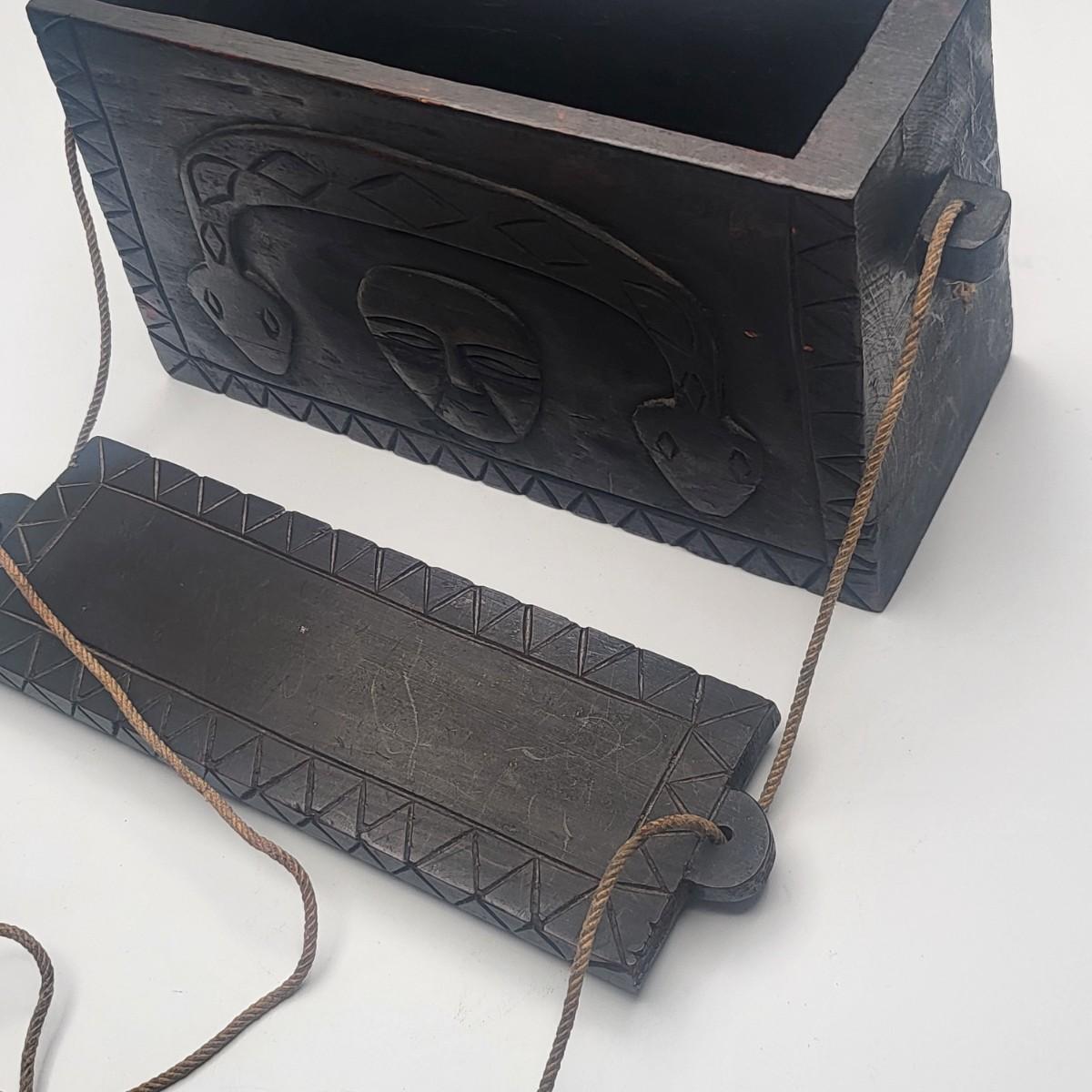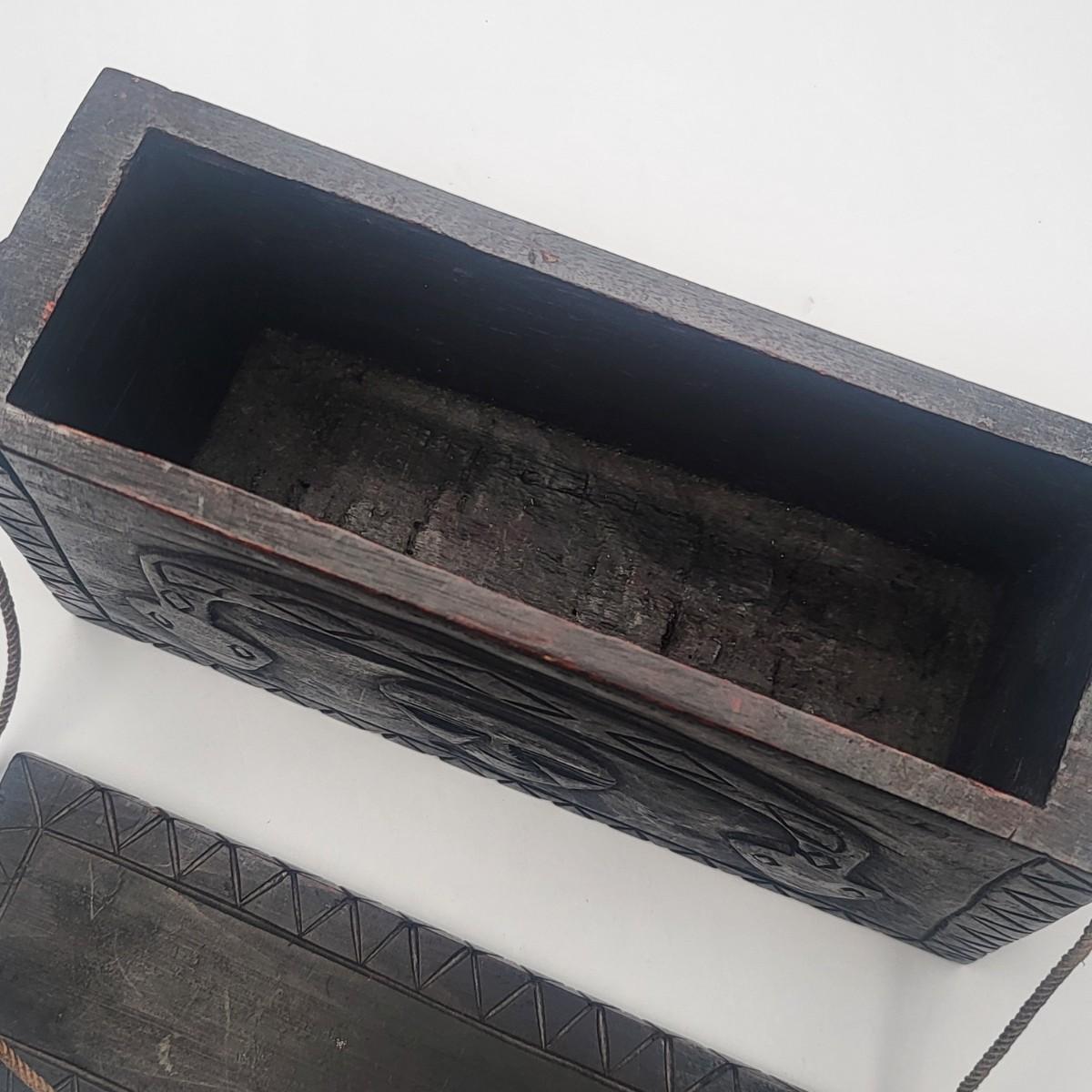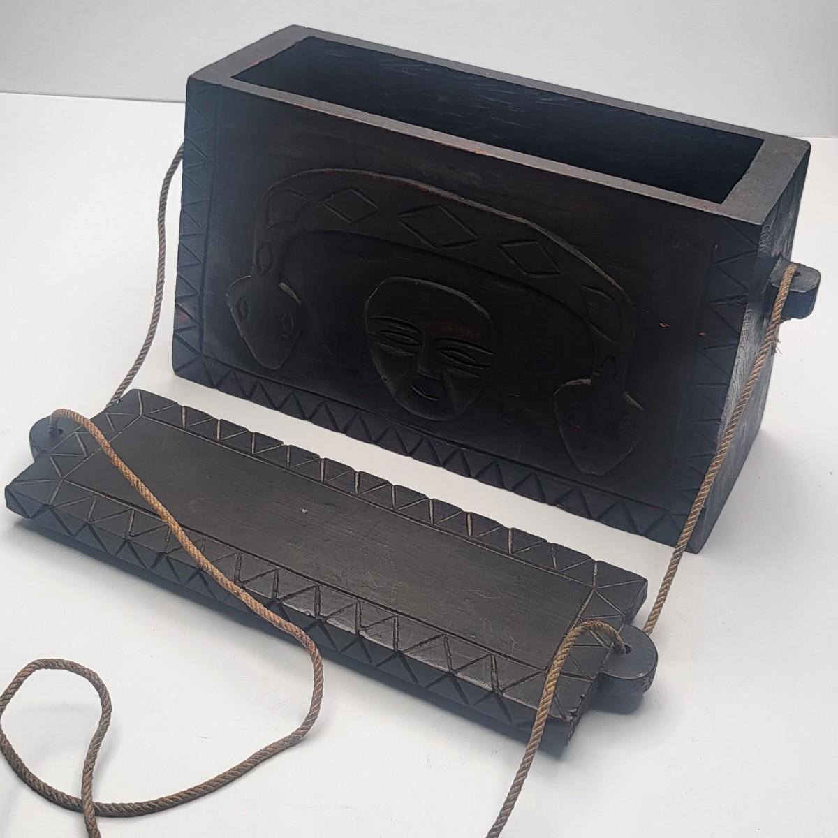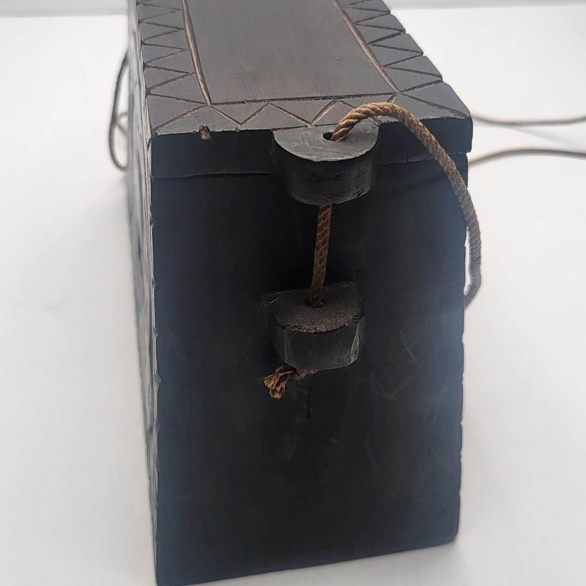 Ebony wooden carved box purse. 19" rope strap goes through the lid to secure it and is long enough to wear on shoulder. Seibu, Made in Taiwan. 8.5" x 5" x 2.75".