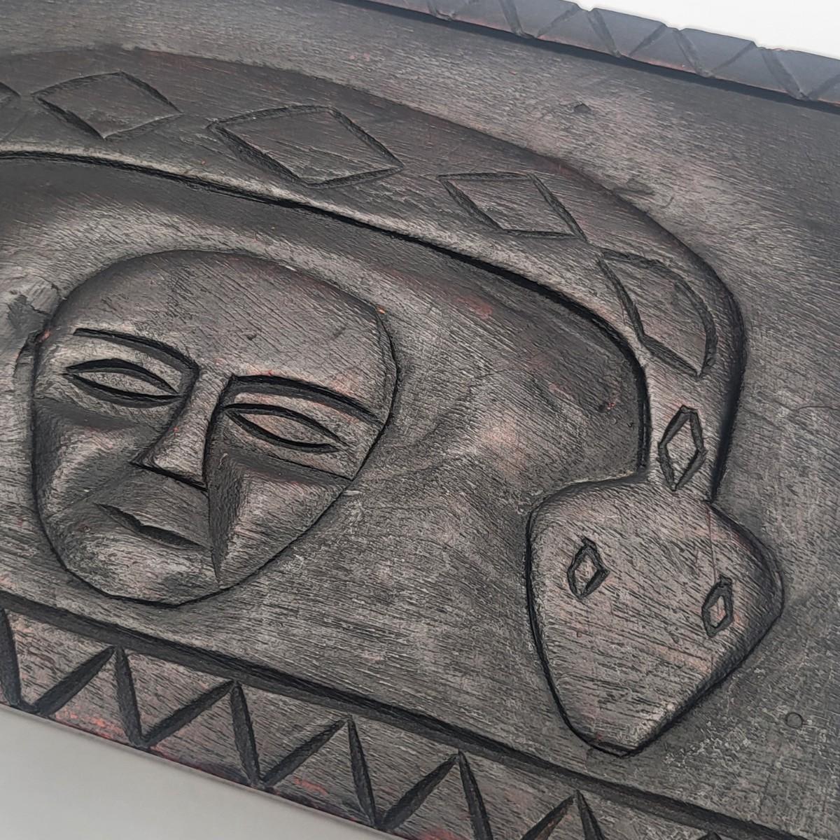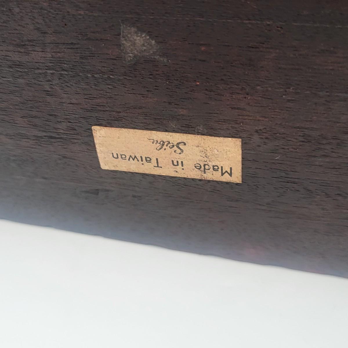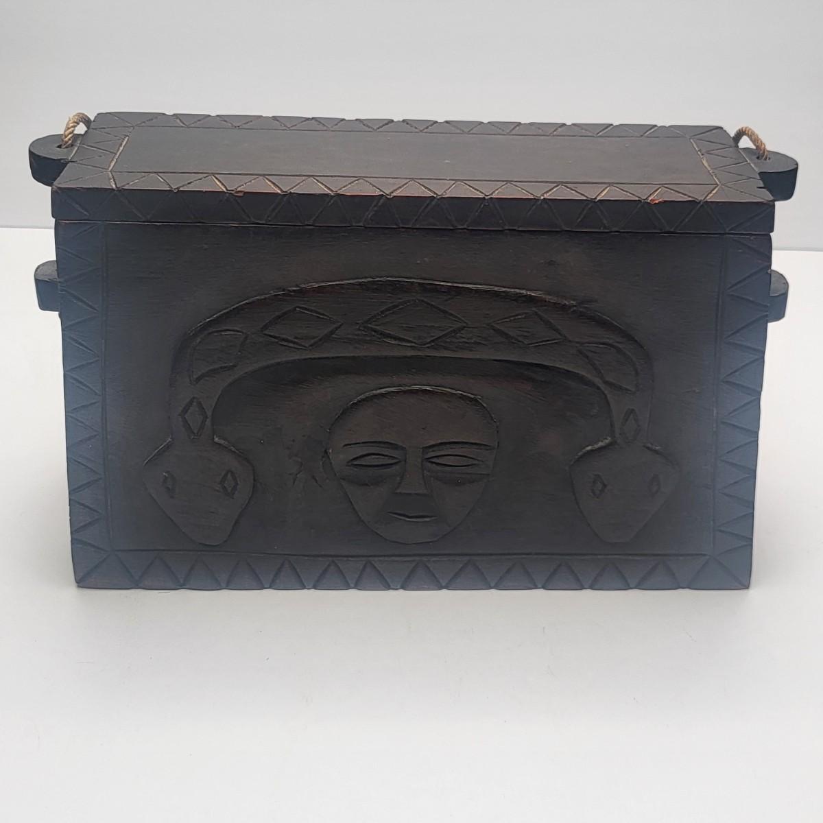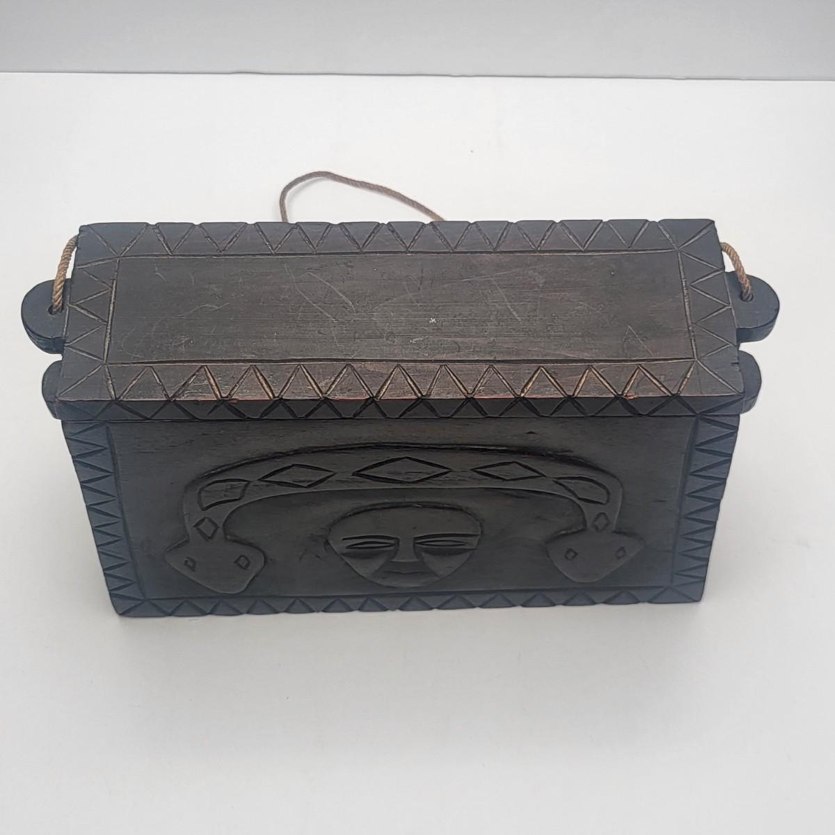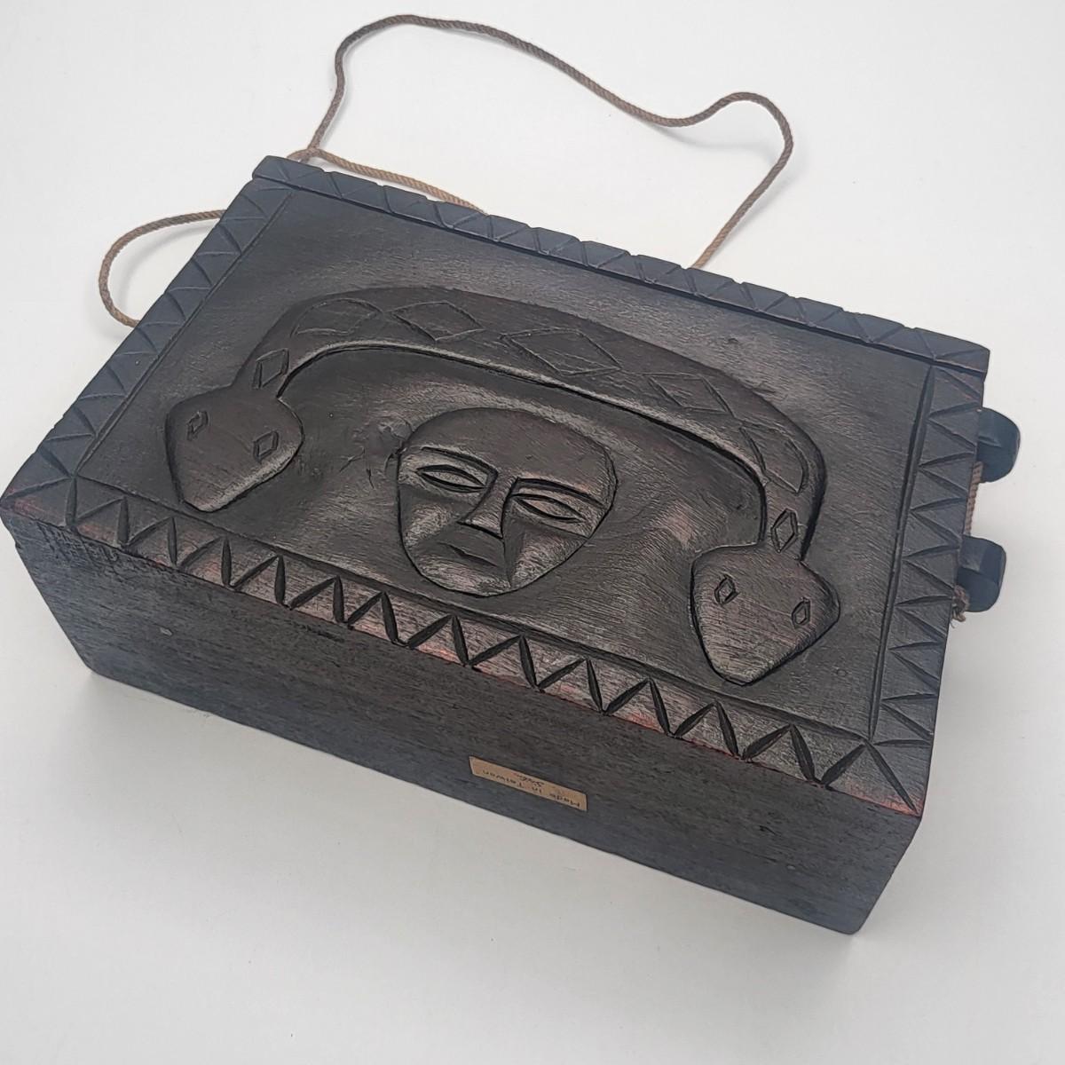 Ebony wooden carved box purse. 19" rope strap goes through the lid to secure it and is long enough to wear on shoulder. Seibu, Made in Taiwan. 8.5" x 5" x 2.75".