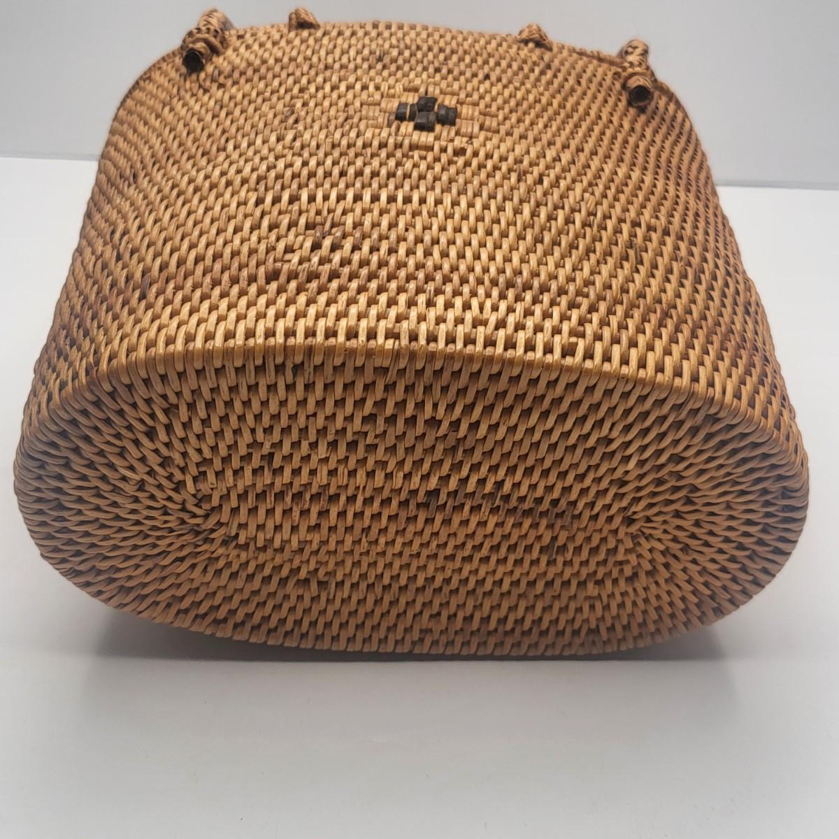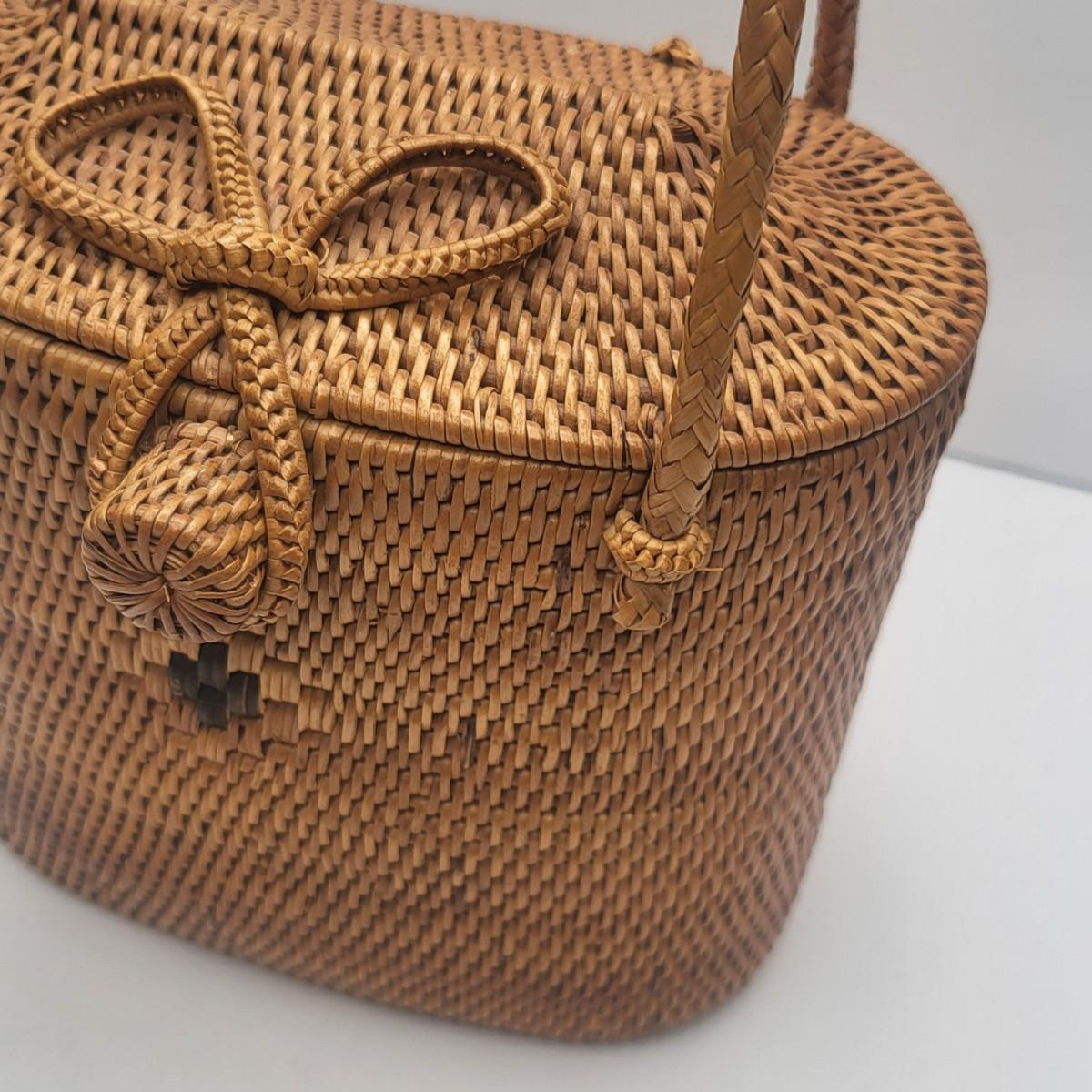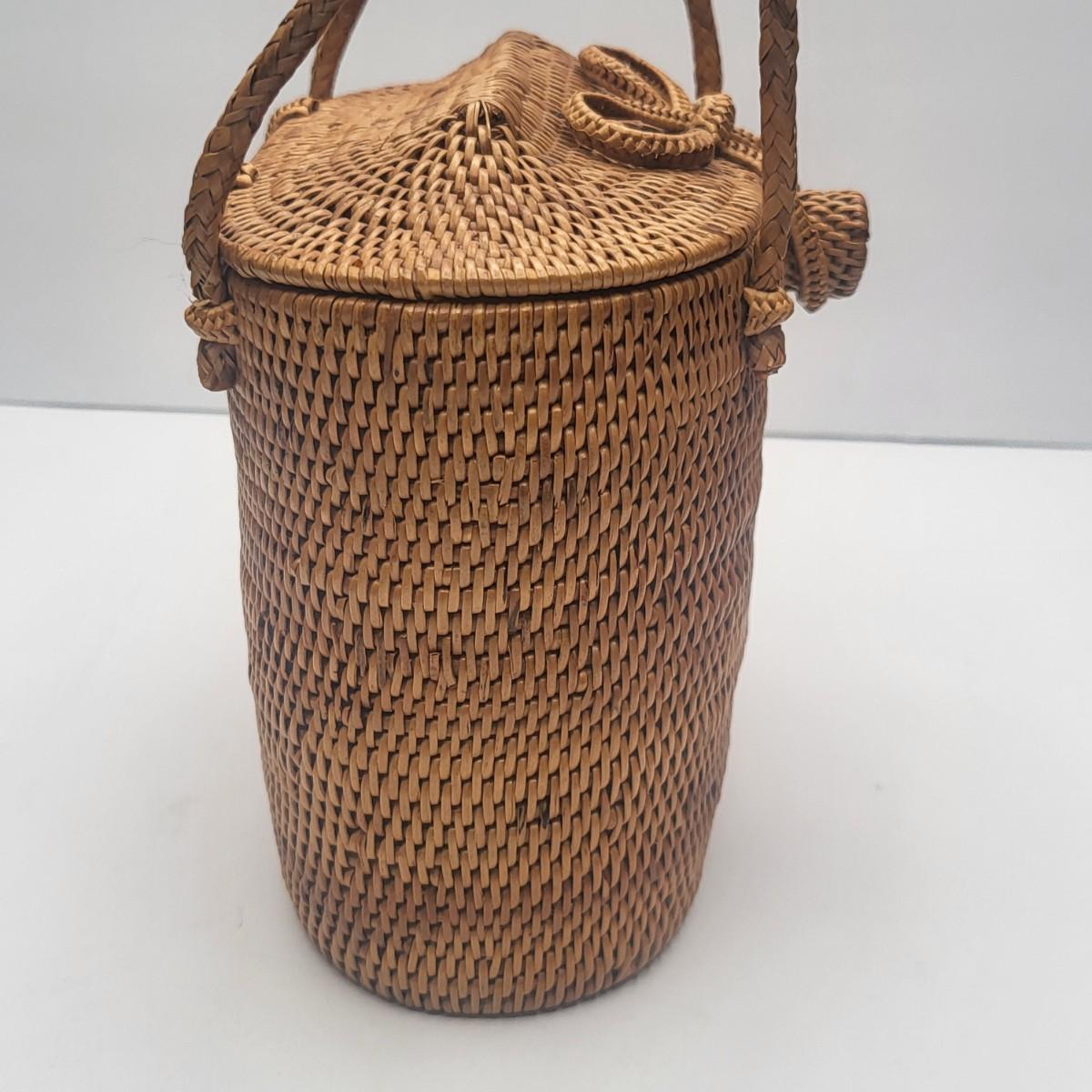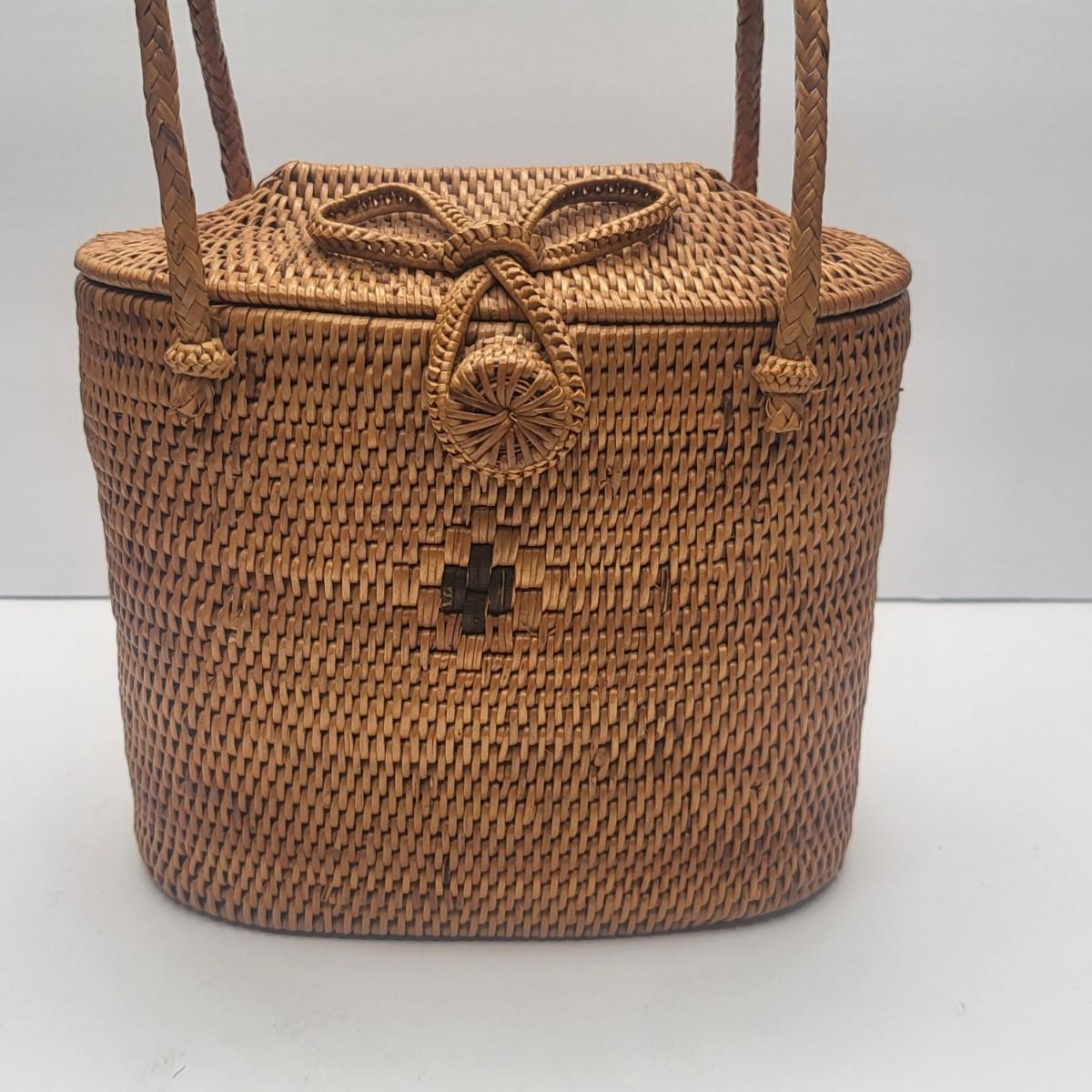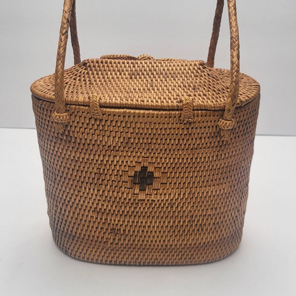 Handcrafted, light brown Rattan weaved Nantucket purse. 6" x 6" x 4". Braided hand strap 6".