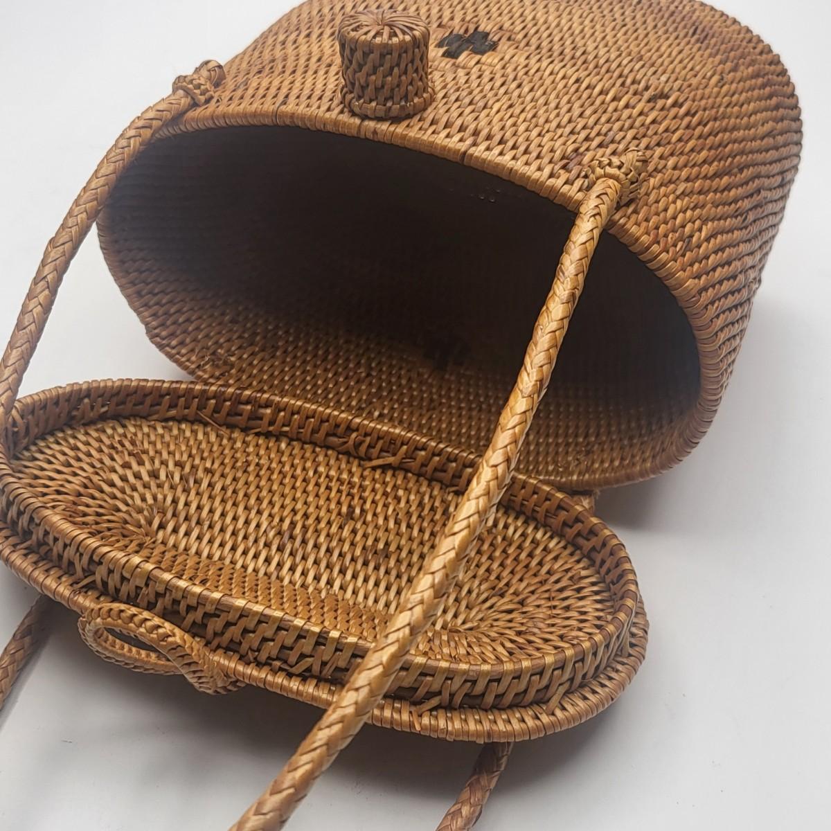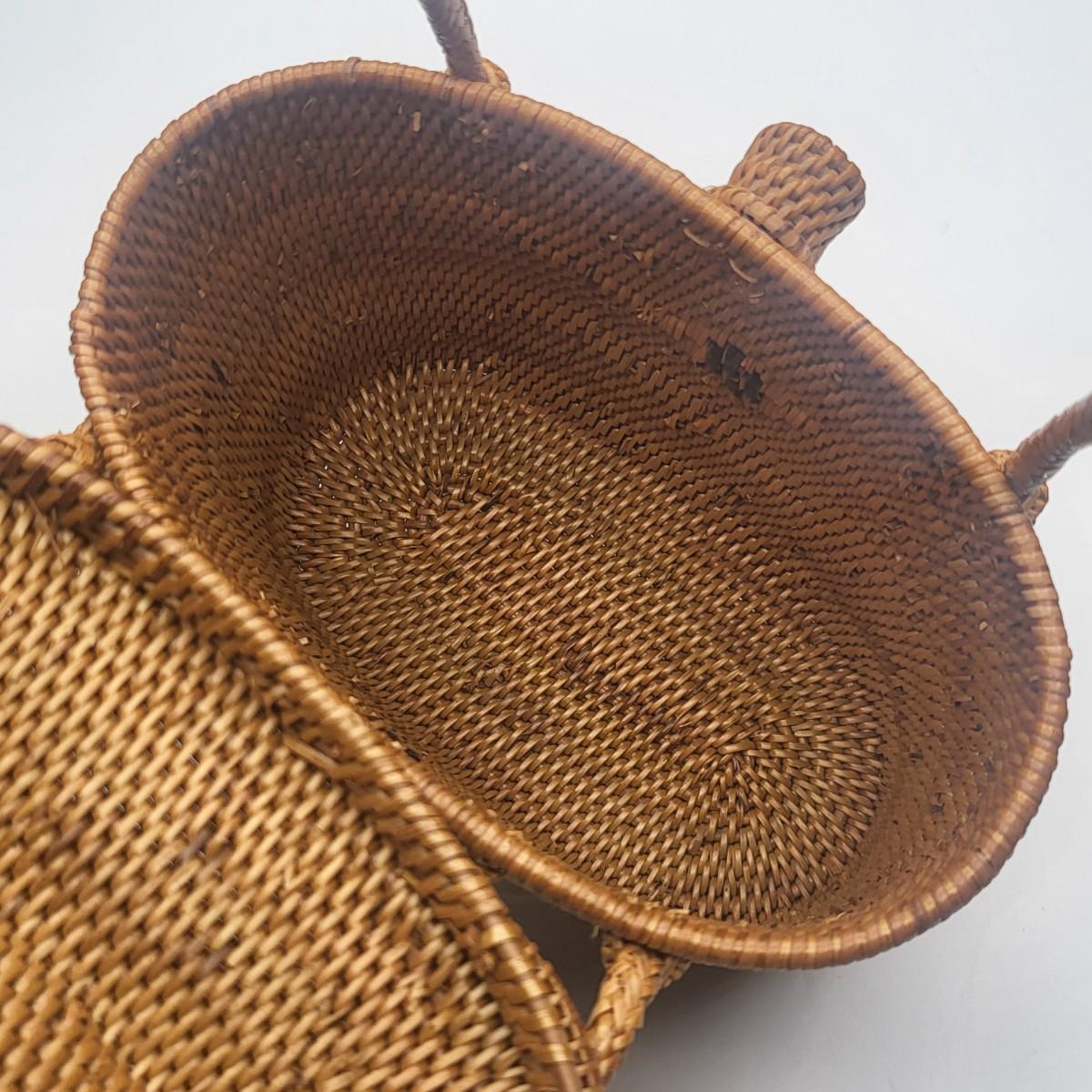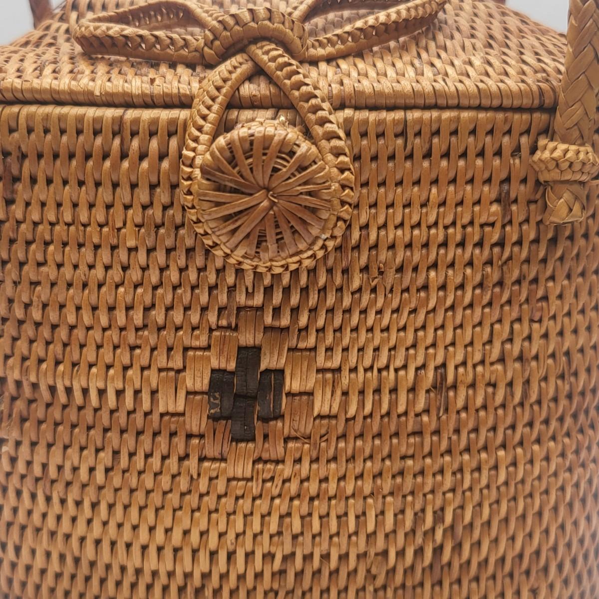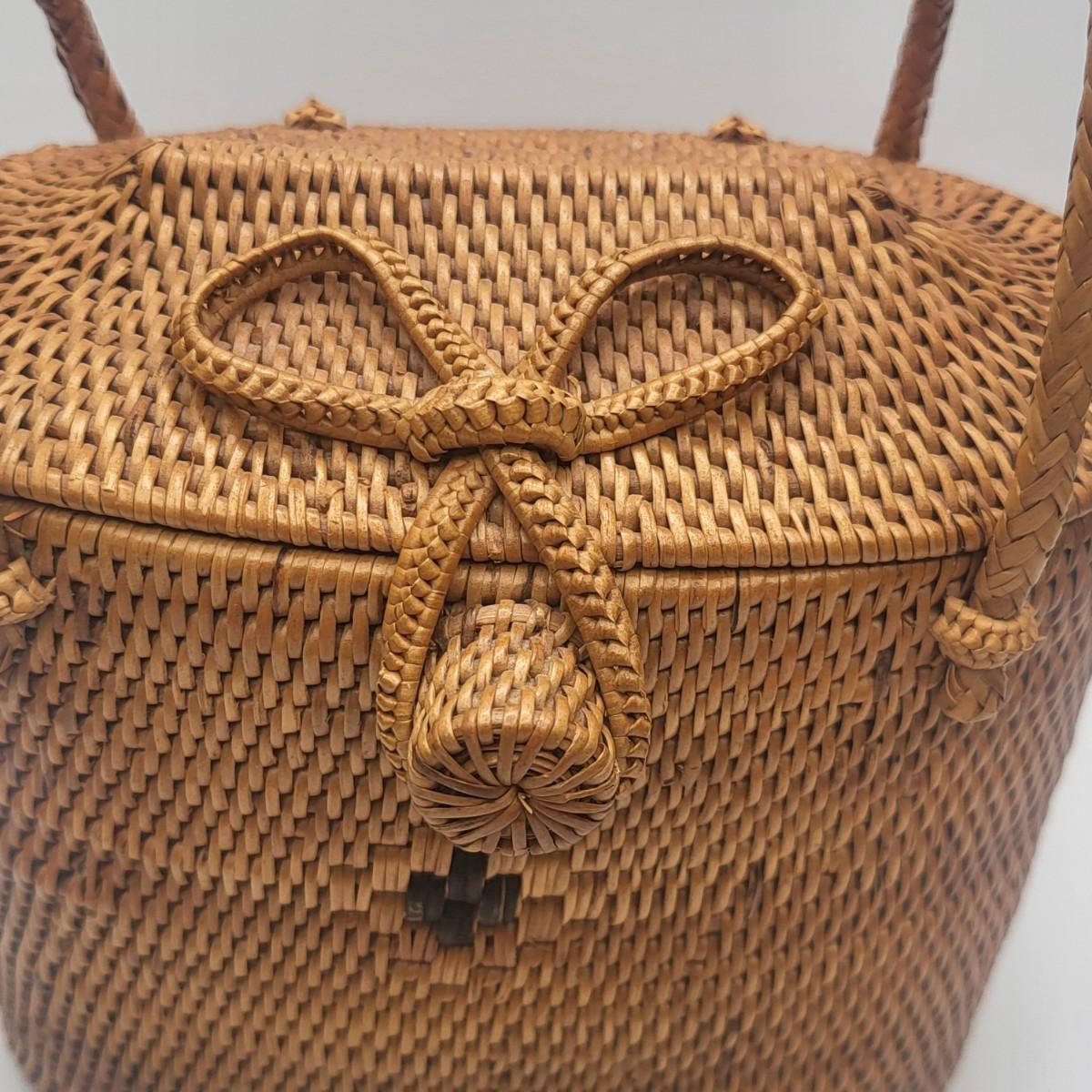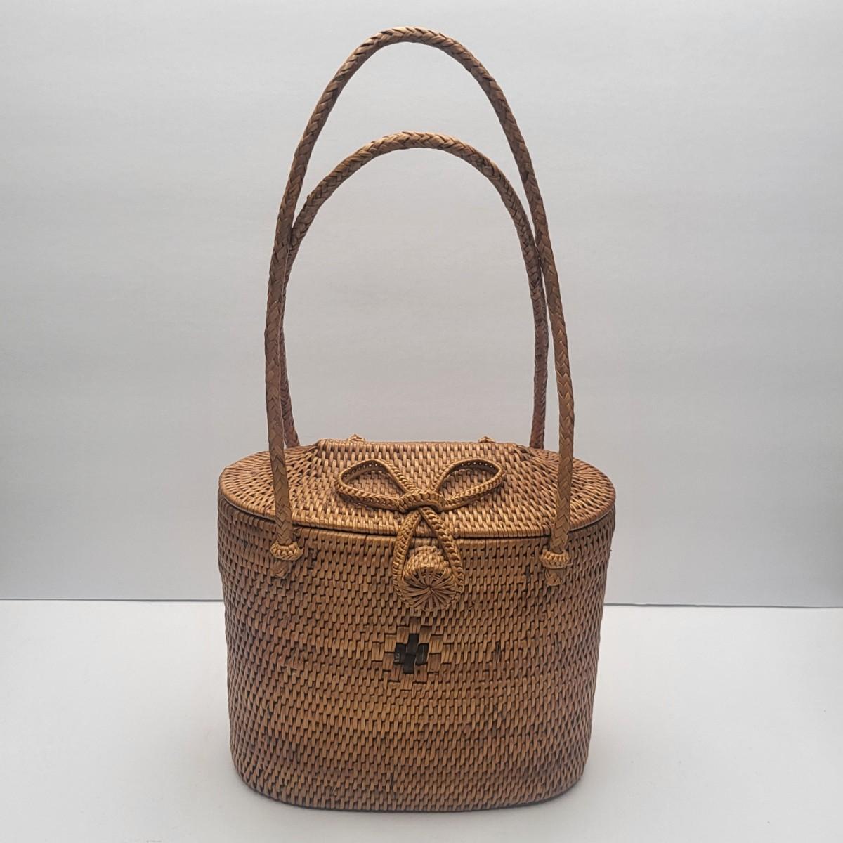 Handcrafted, light brown Rattan weaved Nantucket purse. 6" x 6" x 4". Braided hand strap 6".