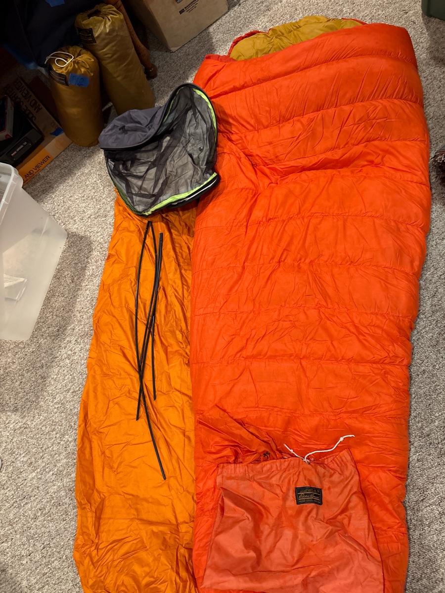 Extremely warm, sleeping bag with Bivy shelter, which goes around the sleeping bag and has a mosquito netting. Last pictures shows what Bivy tent looks like, not actual tent.