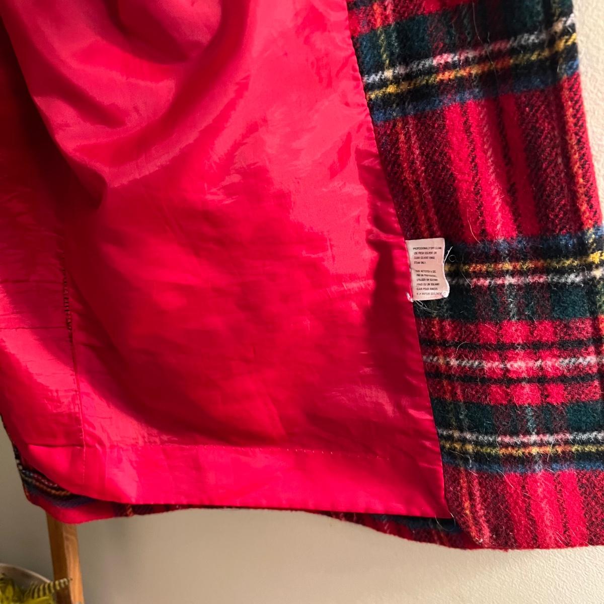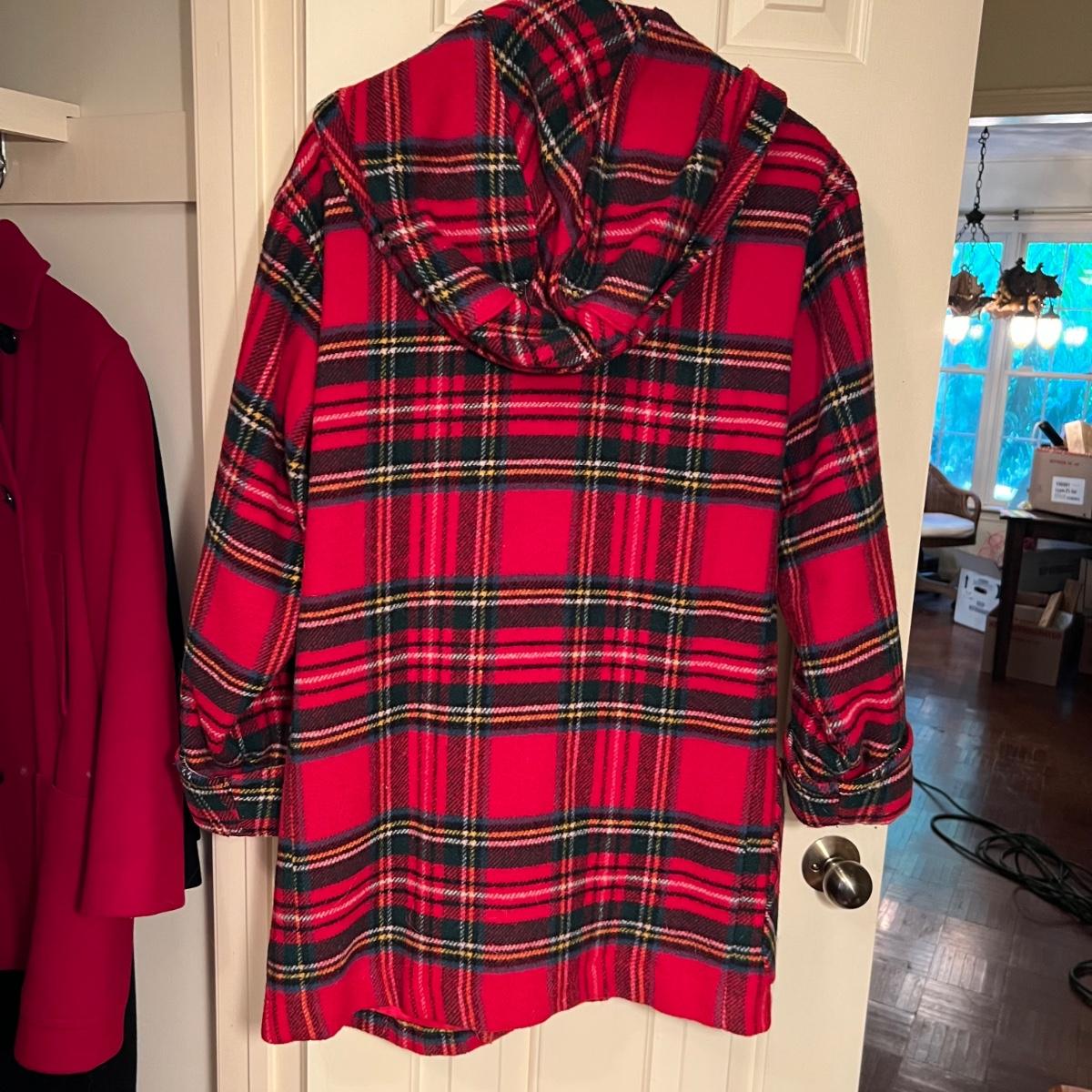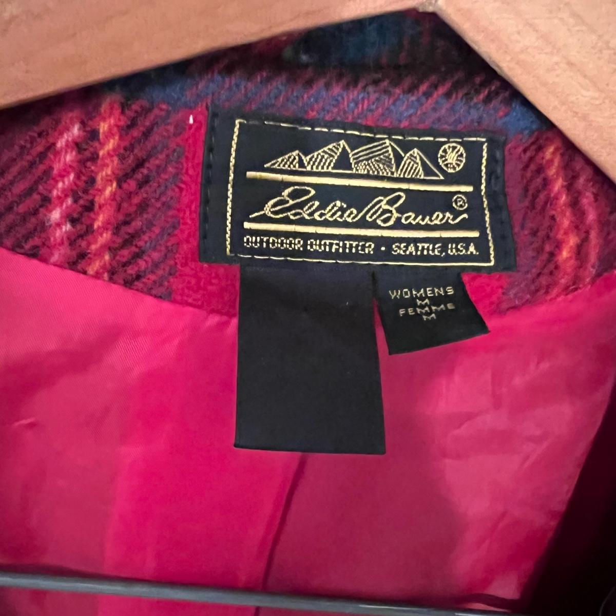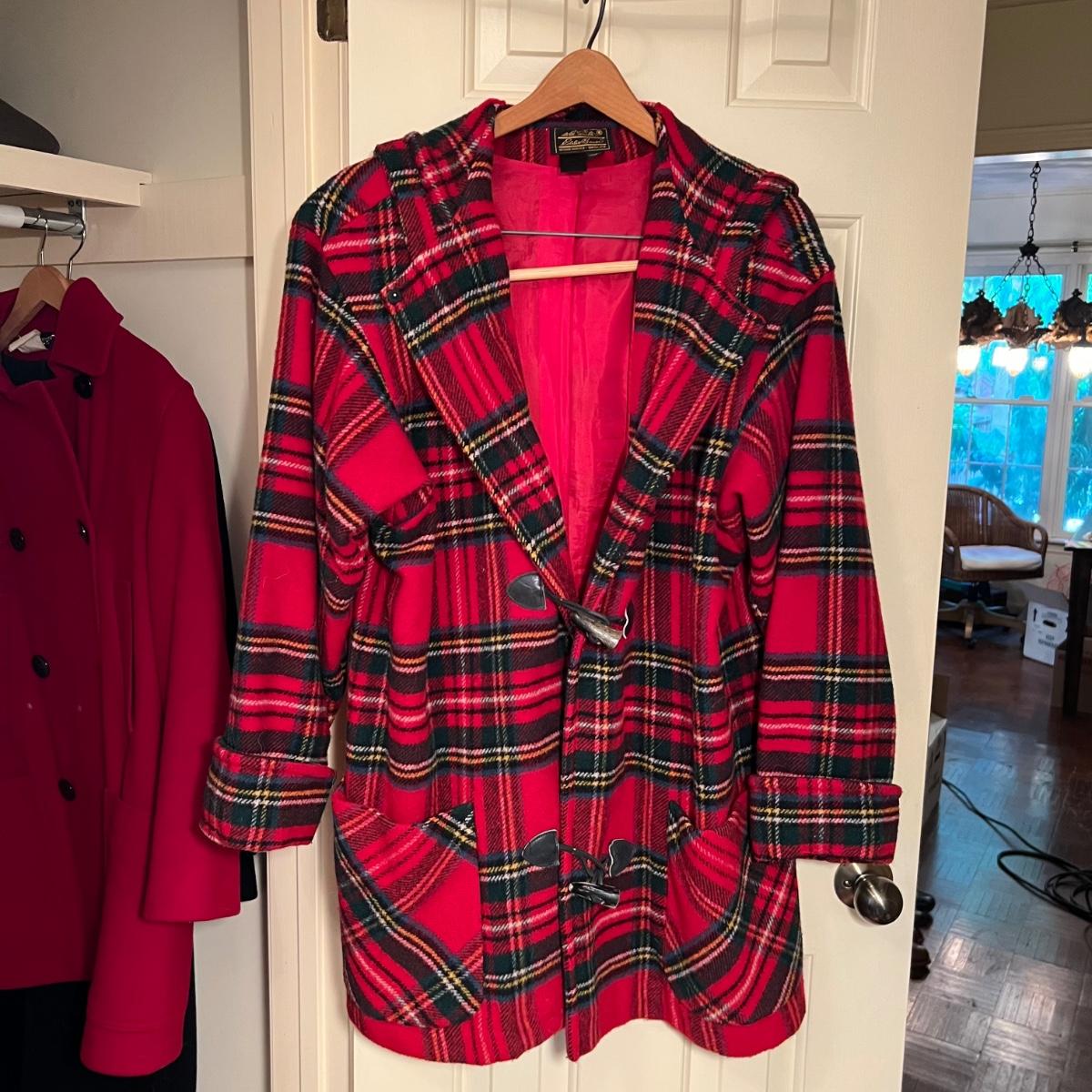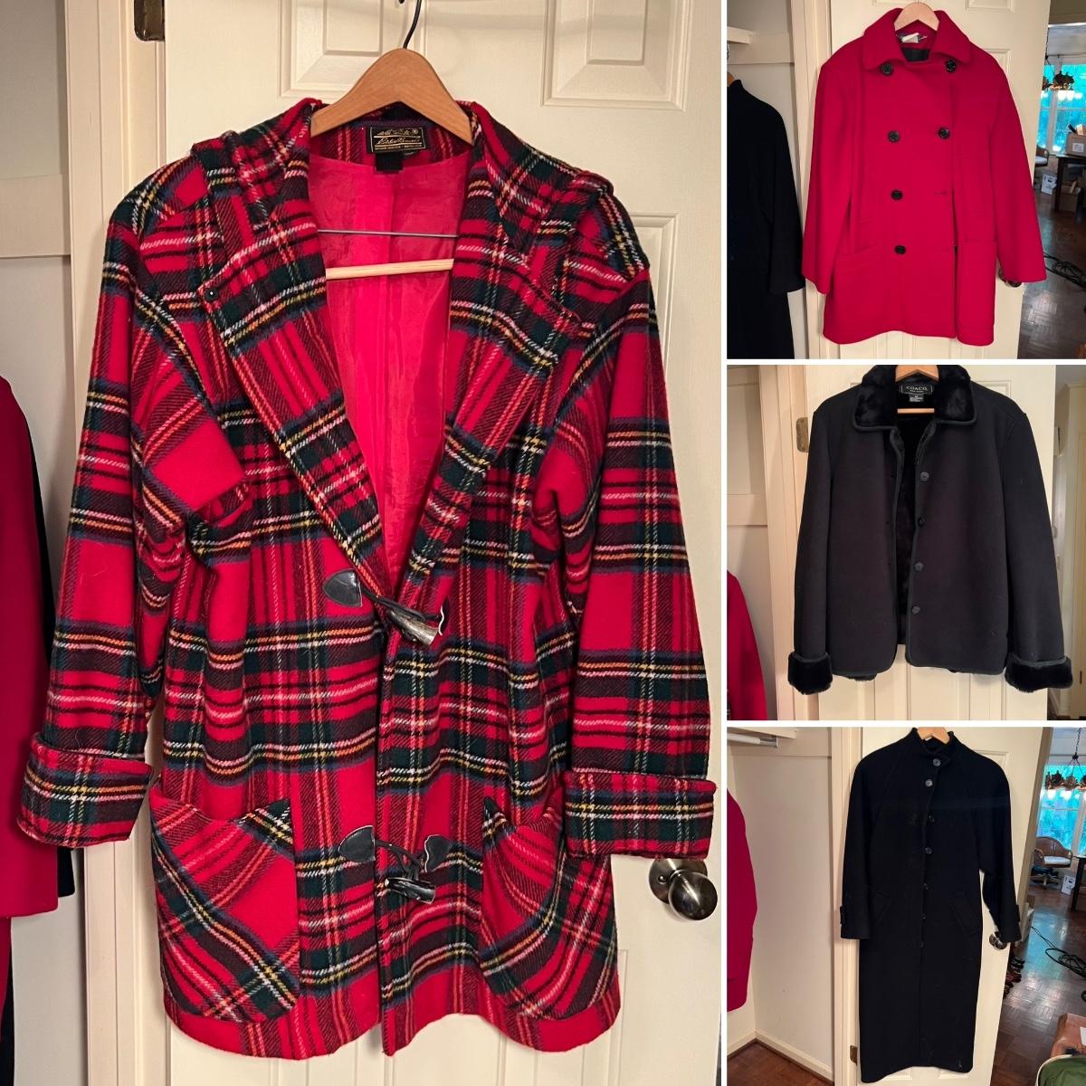 Three wool coats and a black vest features one Eddie Bauer tartan toggle coat. The label for the red jacket is faded, but it appears to be wool. See photos for sizes & brands.