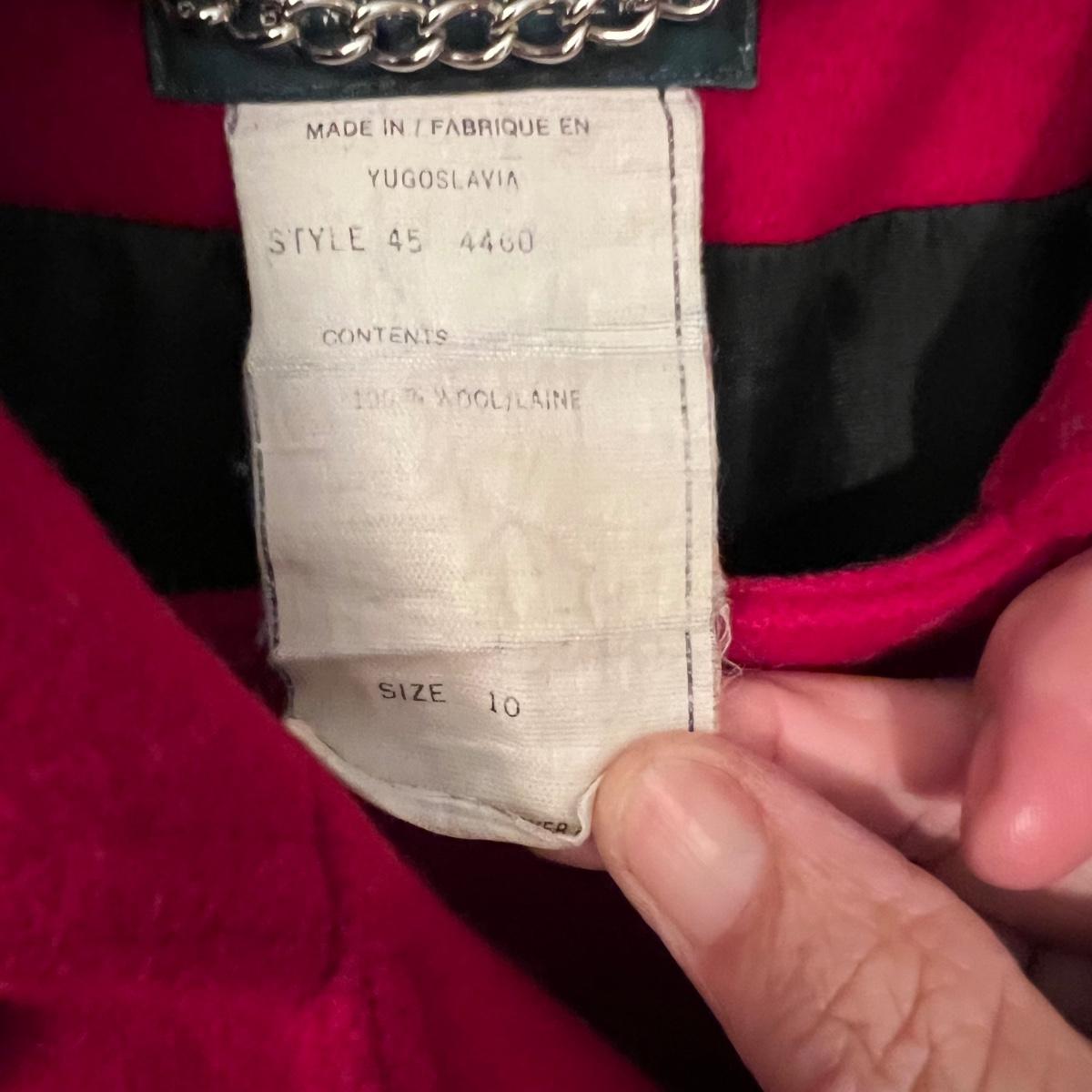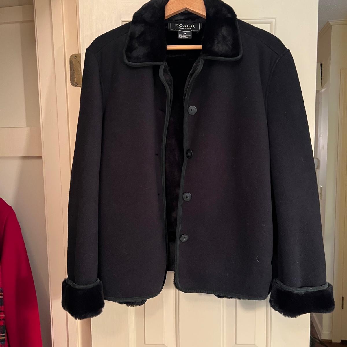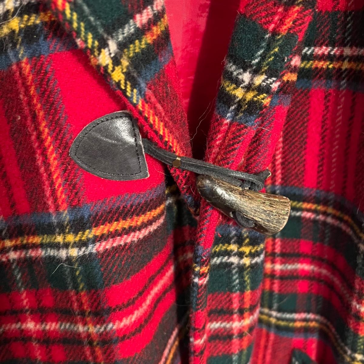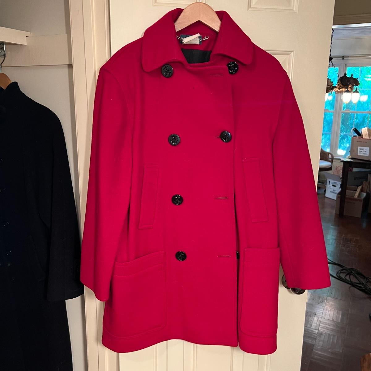 Three wool coats and a black vest features one Eddie Bauer tartan toggle coat. The label for the red jacket is faded, but it appears to be wool. See photos for sizes & brands.