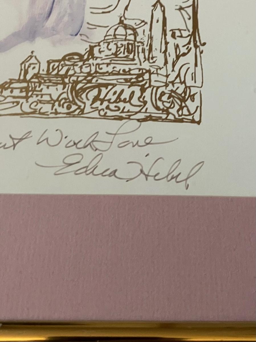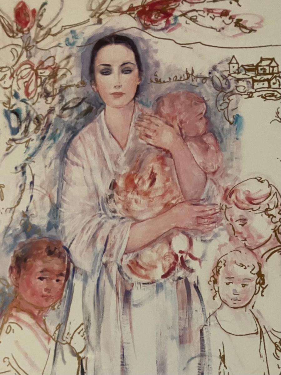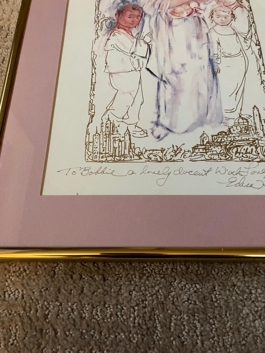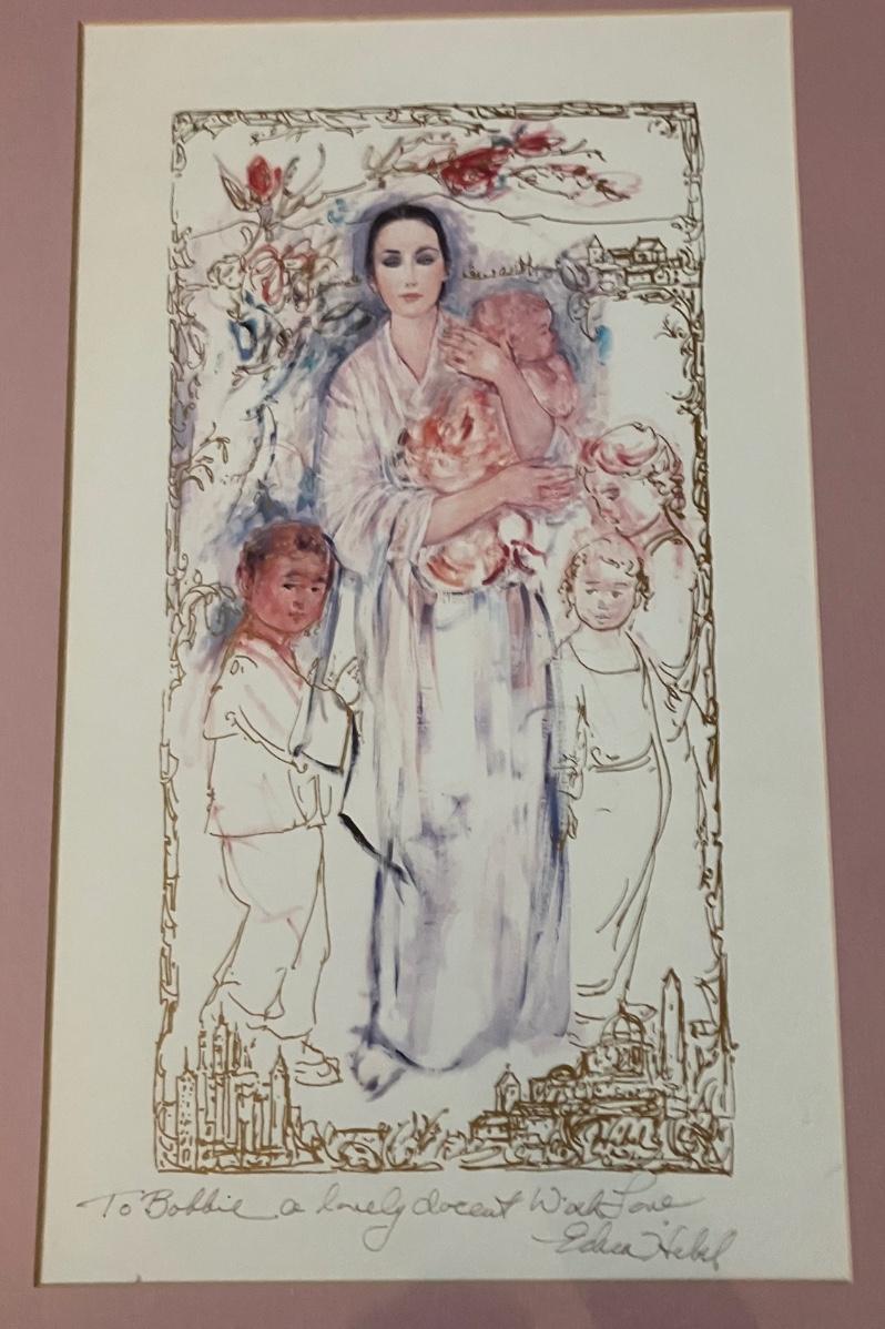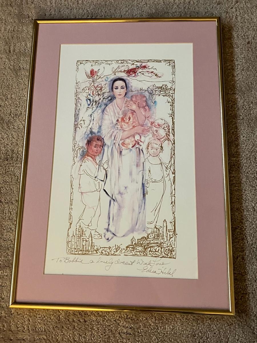 Stunning vintage lithograph by renowned American artist Edna Hibel (1917–2014), hand-signed and personally inscribed "To Bobbie a lovely friend with love, Edna Hibel." This ethereal piece features a graceful Madonna-like figure cradling two children in flowing robes, surrounded by delicate floral motifs and a whimsical architectural backdrop in soft pastel pinks, blues, and golds—classic Hibel style evoking peace and innocence.
