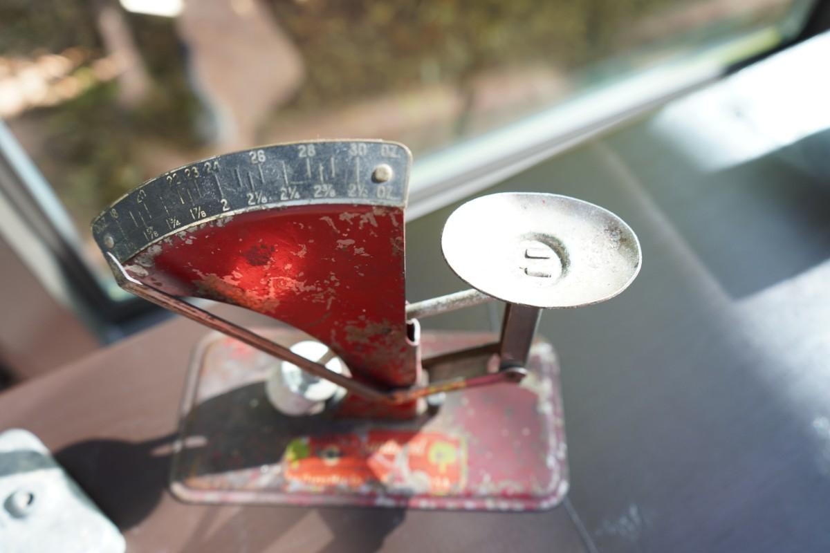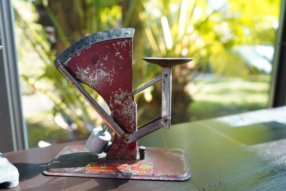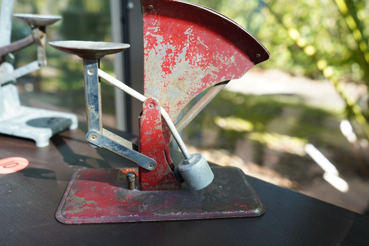 Farmhouse collectible, vintage egg scales. Oakes Manufacturing Co scale - 6.5 W x 3.25 D x 6.5 H. Zenith - 6.5 W x 2.75 D x 8.25 H.