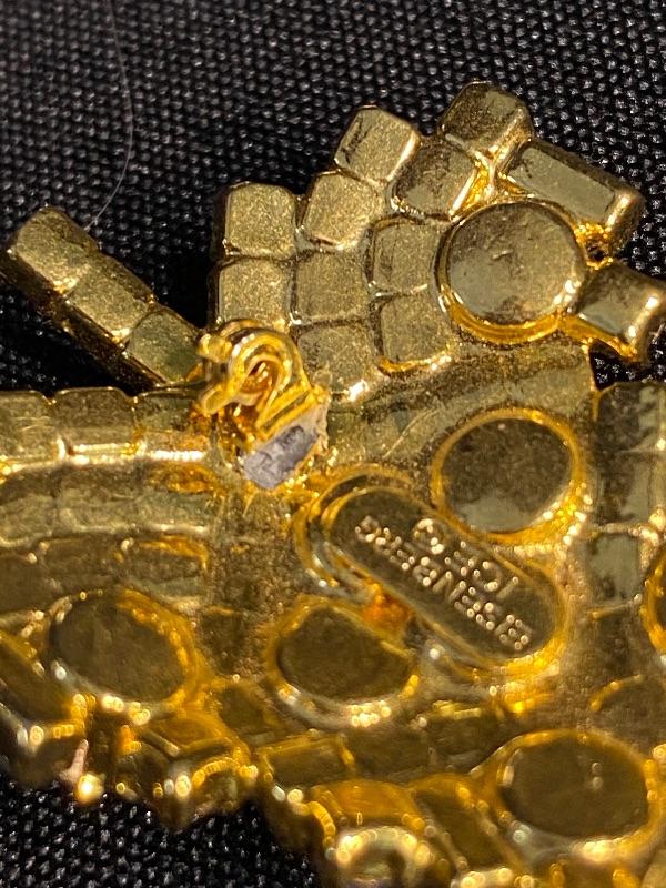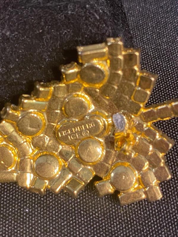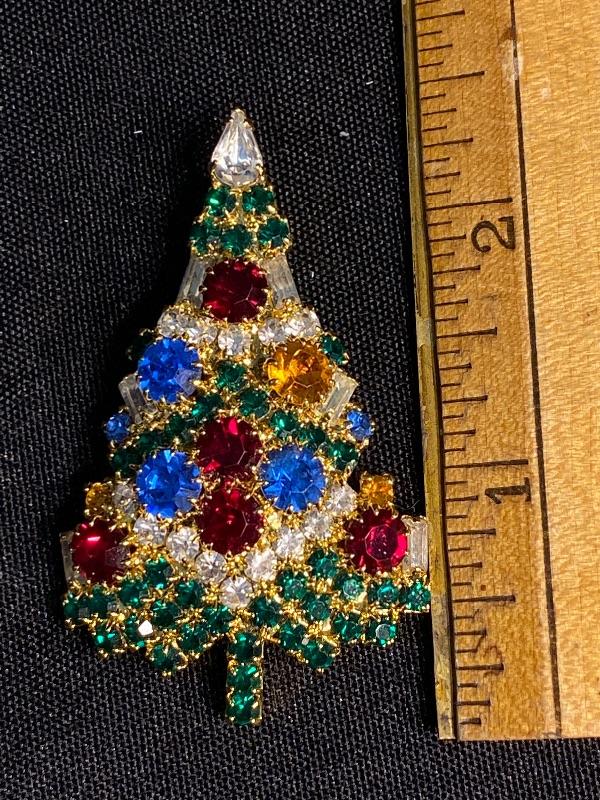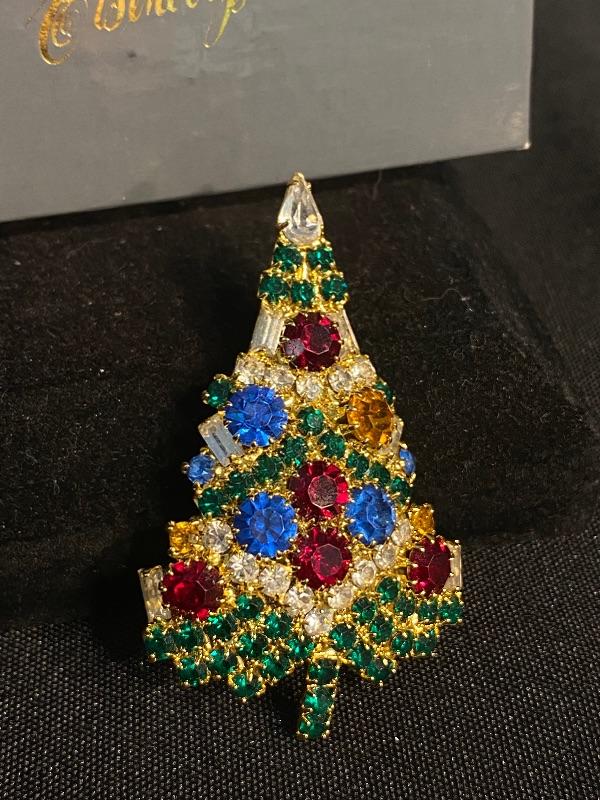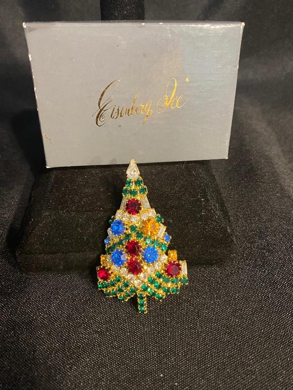 Colorful Eisenberg Ice vintage Christmas tree brooch. Goldtone setting. Comes in the original Eisenberg box. Does need repair, the lock part for the pin is almost completely off. Tried to get a good photo. It may be possible to fix with just a little super glue or maybe repurposed. No missing stones.