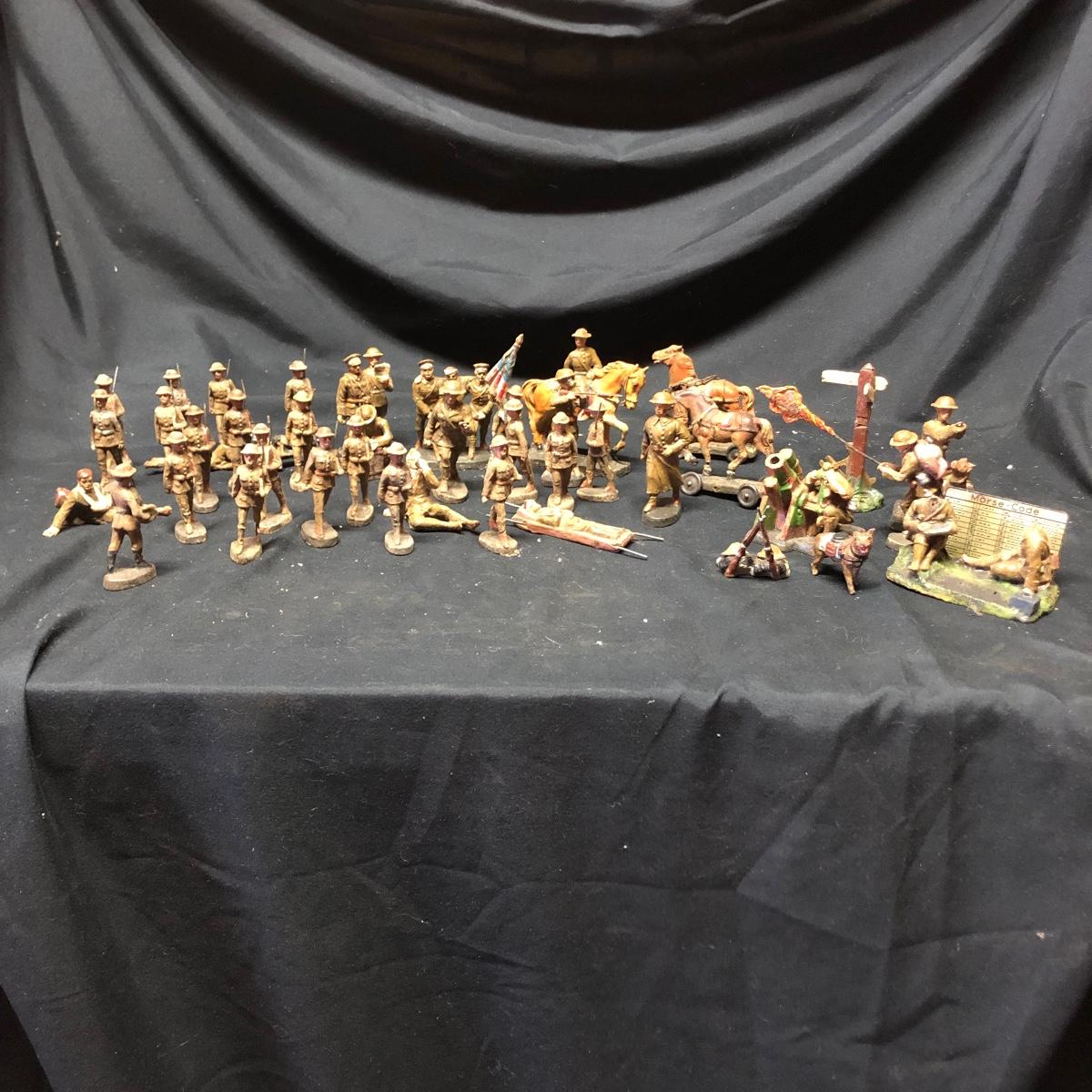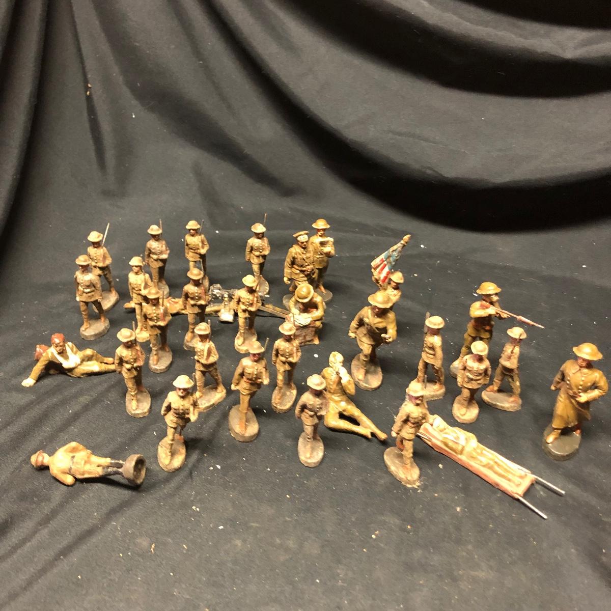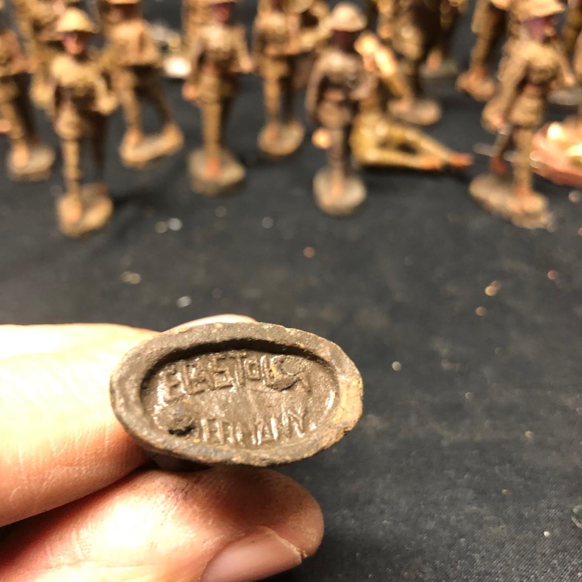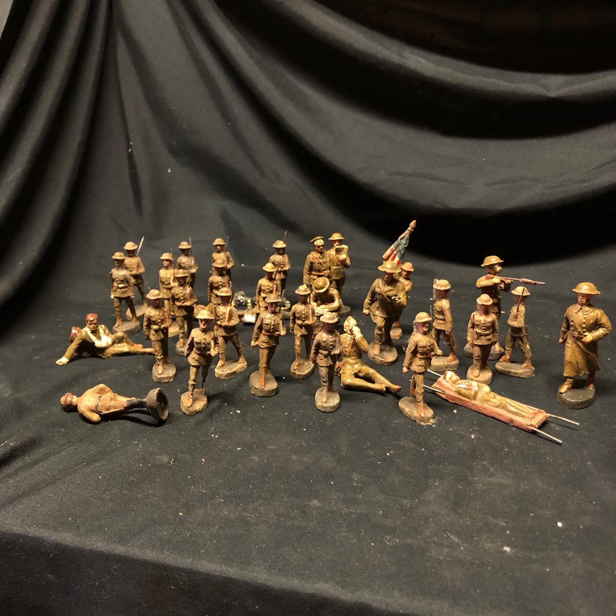 Lot contains over twenty five individual soldiers, horses, flame thrower, canon, dogs, injured men and more. Most pieces are marked Elastolin. Tallest piece measures 4” tall.