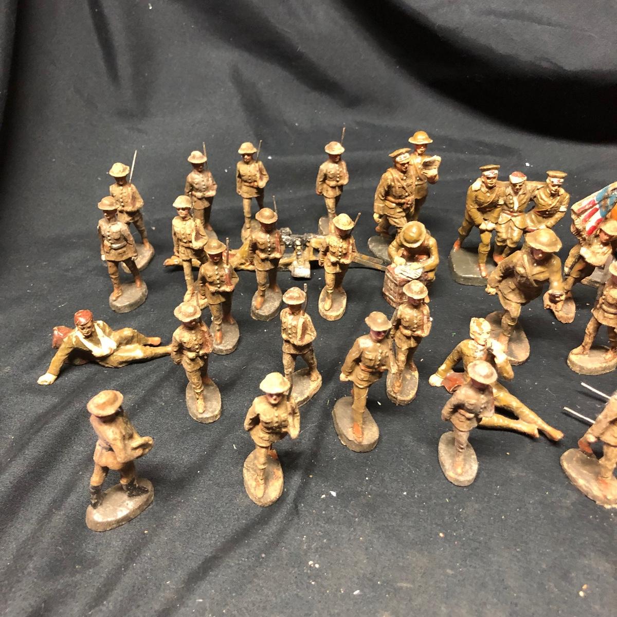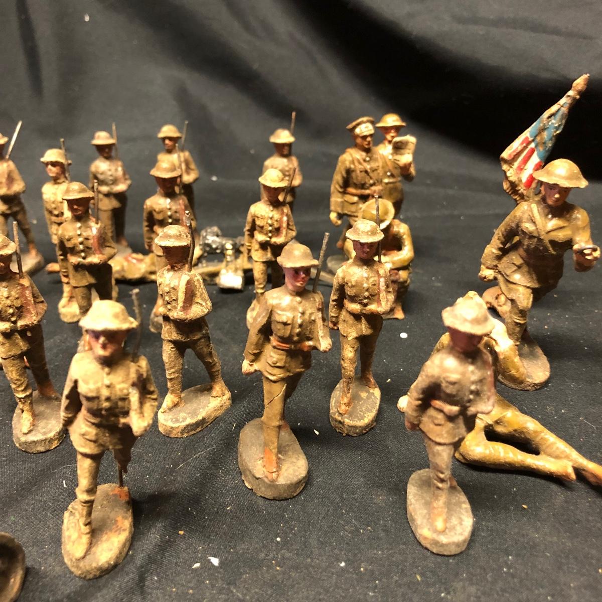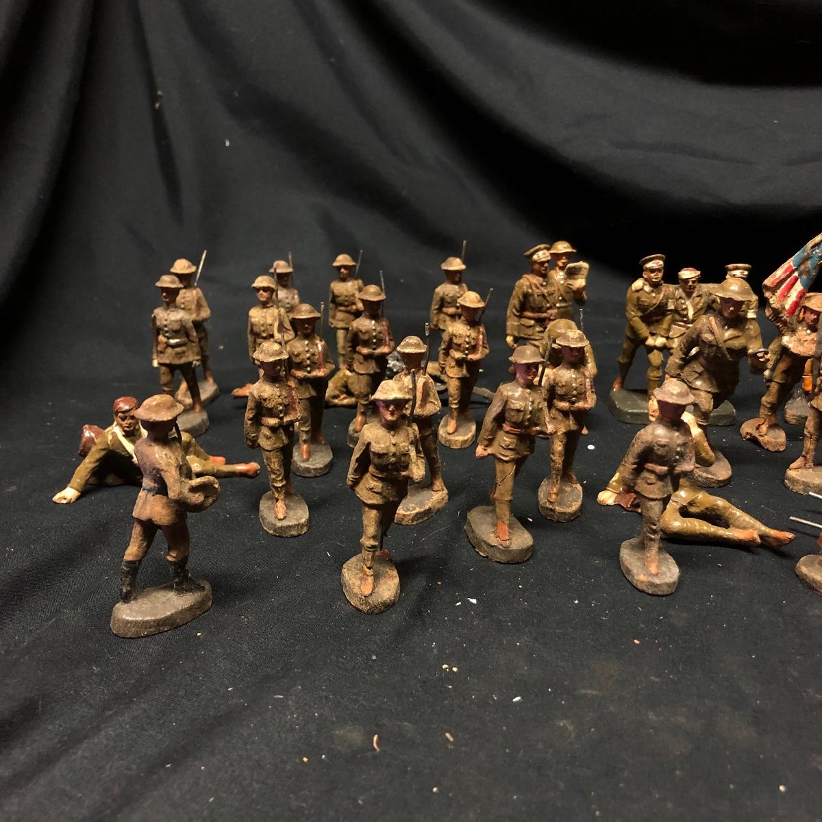 Lot contains over twenty five individual soldiers, horses, flame thrower, canon, dogs, injured men and more. Most pieces are marked Elastolin. Tallest piece measures 4” tall.