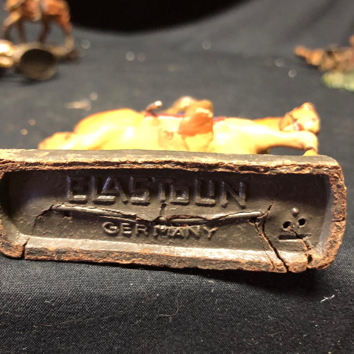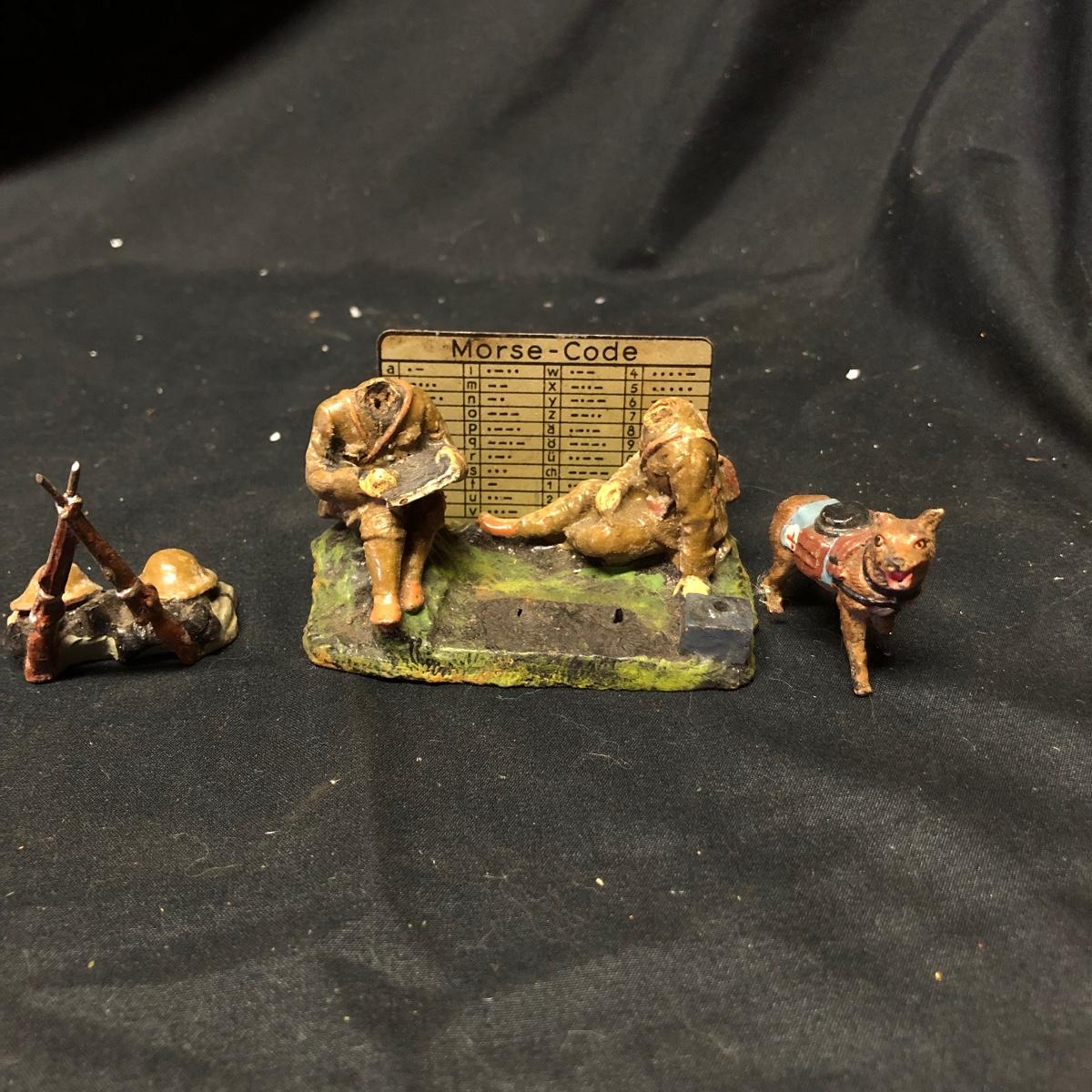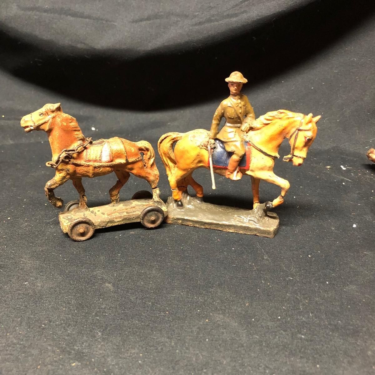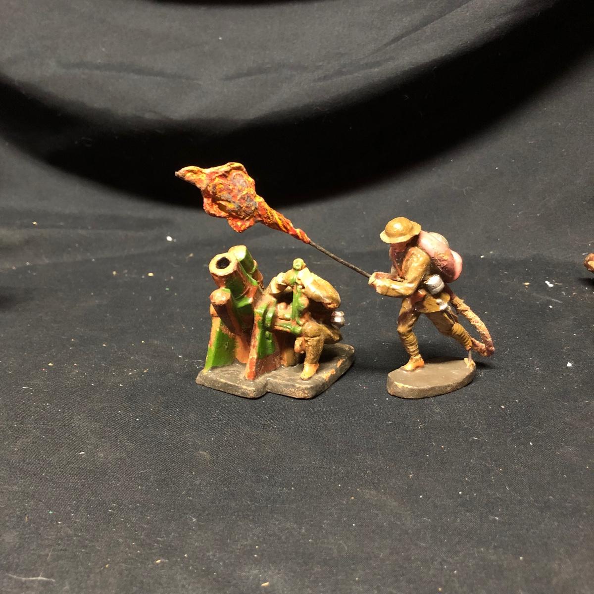 Lot contains over twenty five individual soldiers, horses, flame thrower, canon, dogs, injured men and more. Most pieces are marked Elastolin. Tallest piece measures 4” tall.