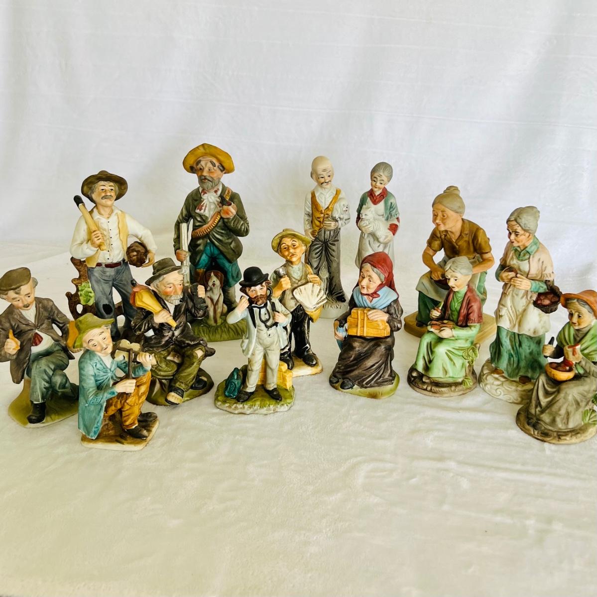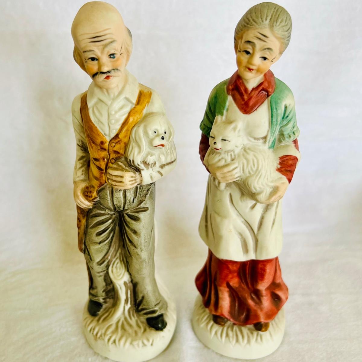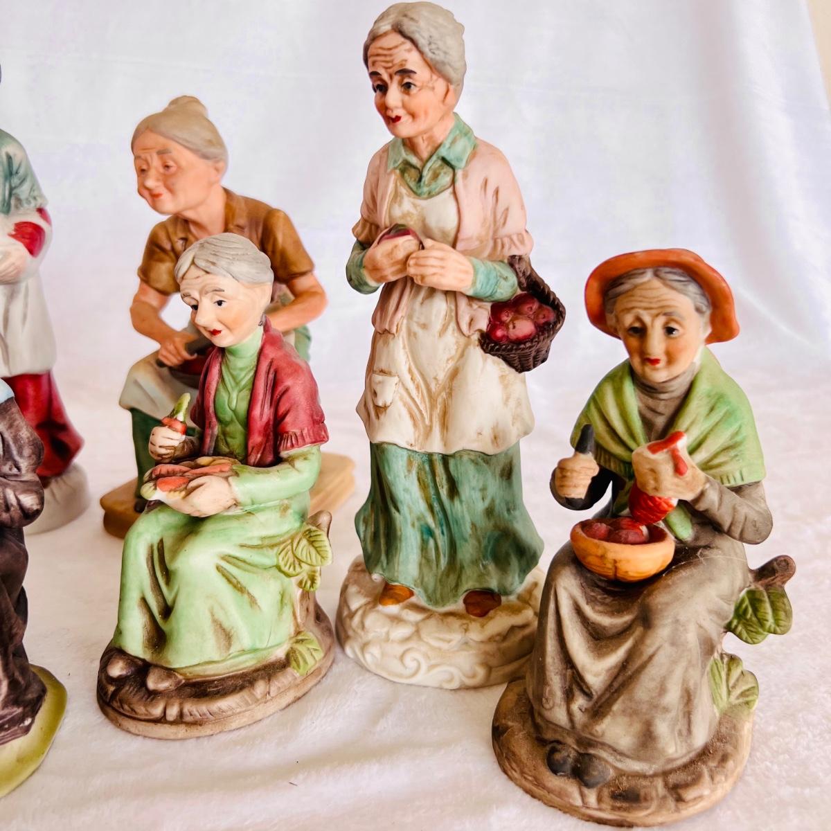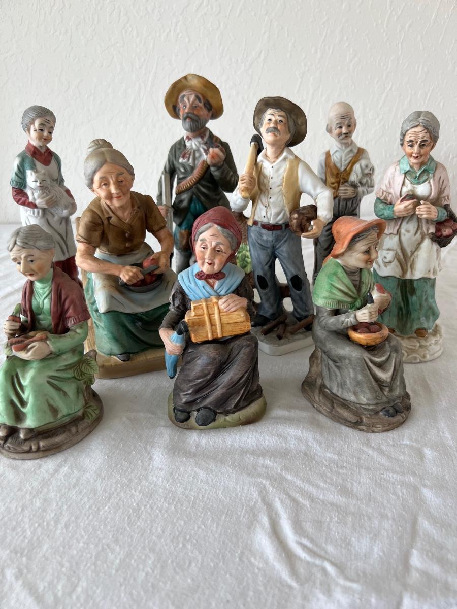 Vintage porcelain figurines of elderly men and women. figurines that are approximately 6” tall to 12” tall. No boxes. (LR-JM)
