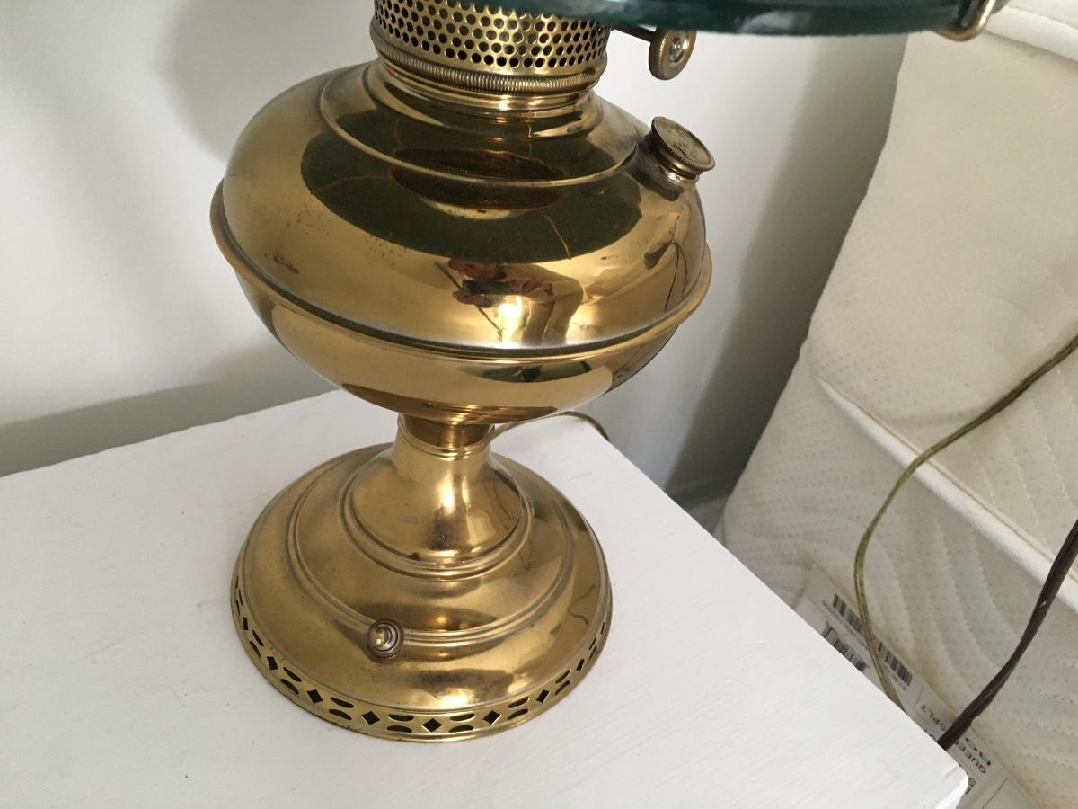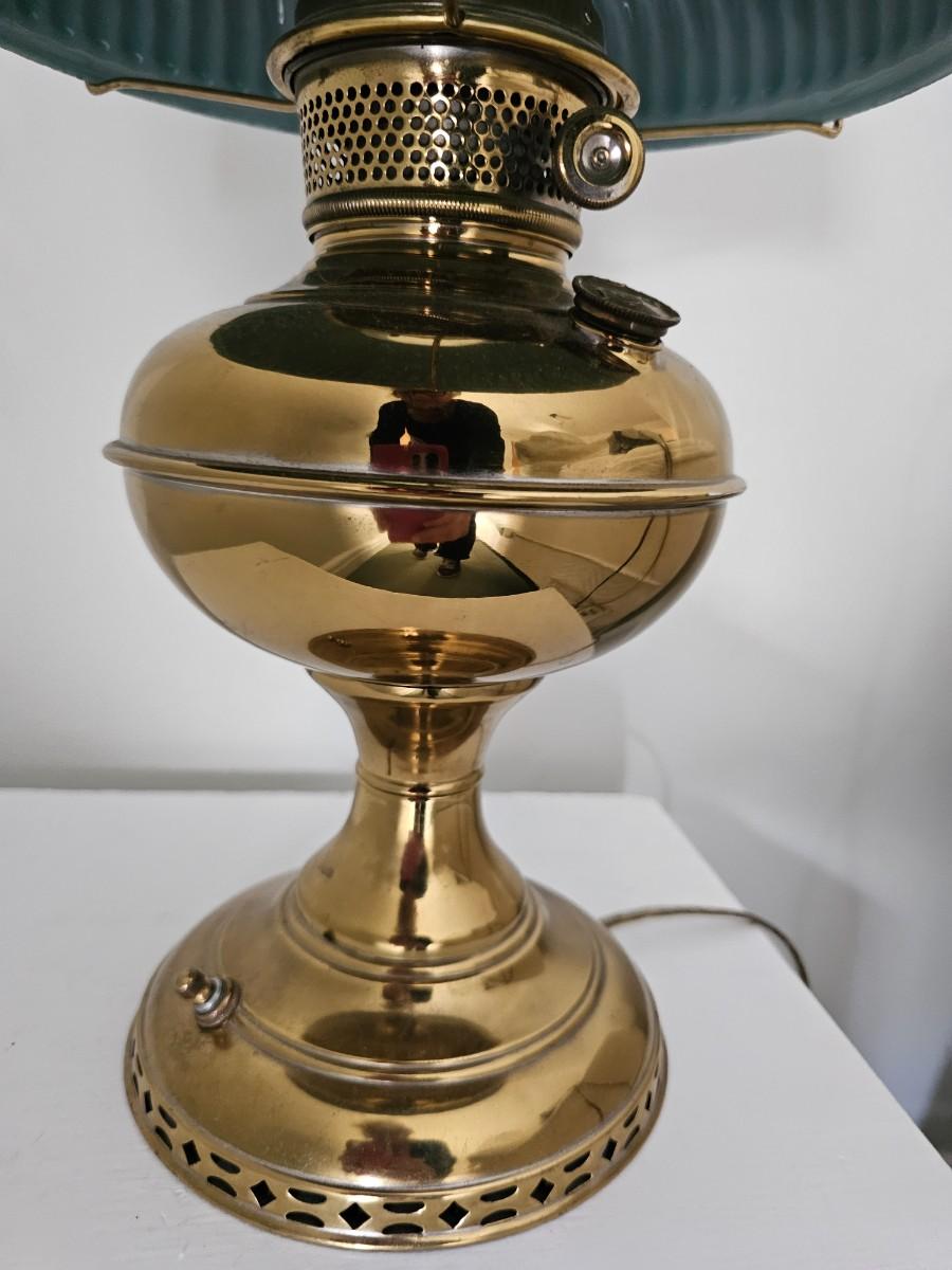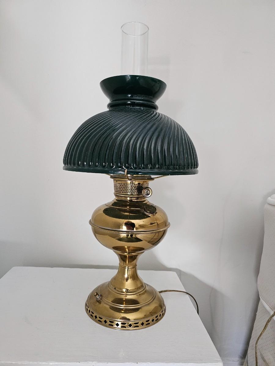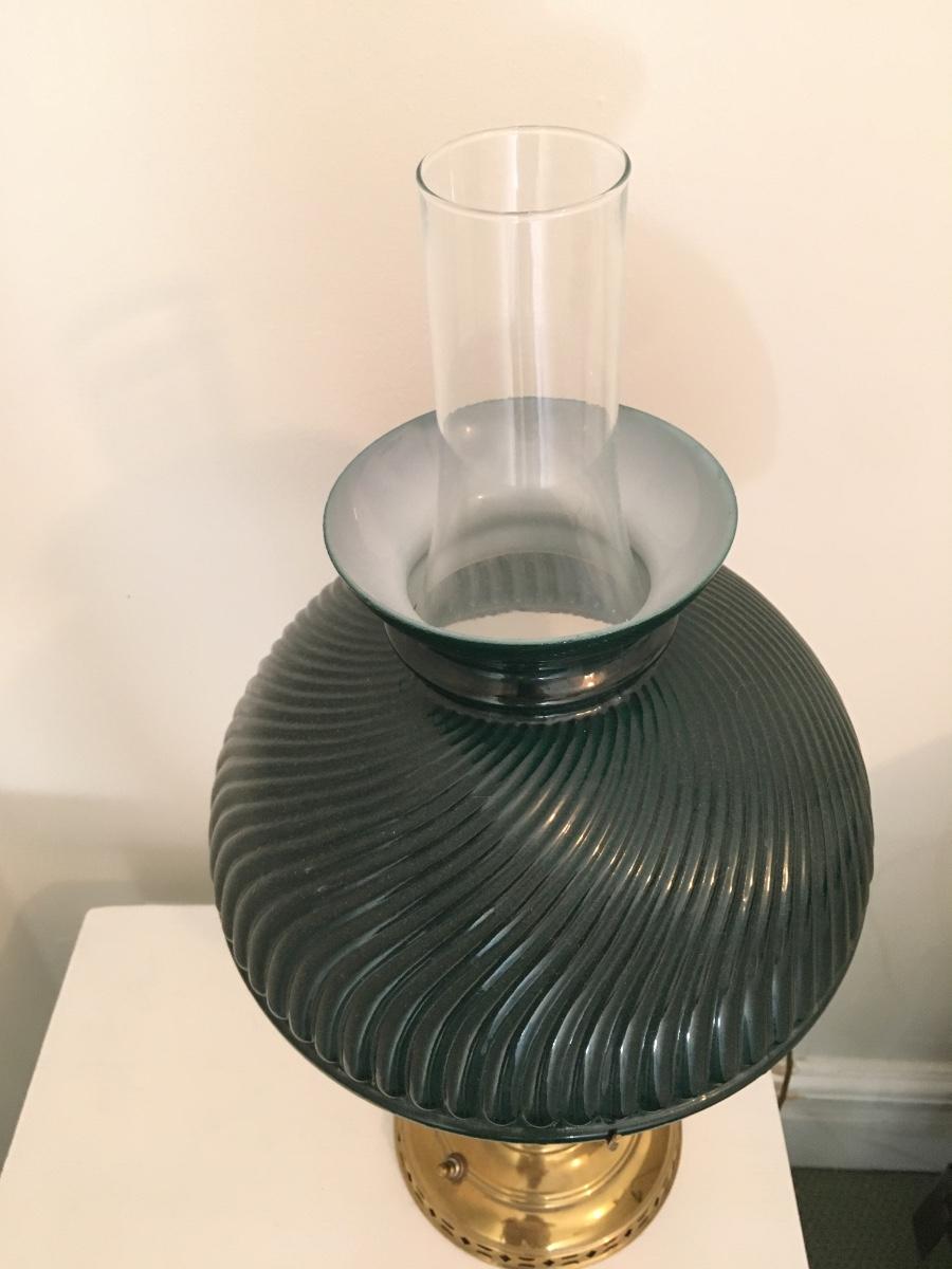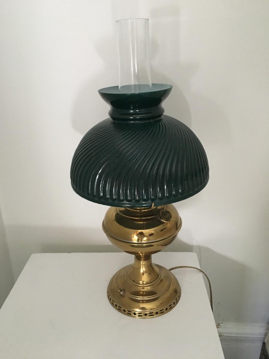 Emerald glass shade, light switch on base. Some signs of wear on brass commensurae with age, but no damage on lamp.