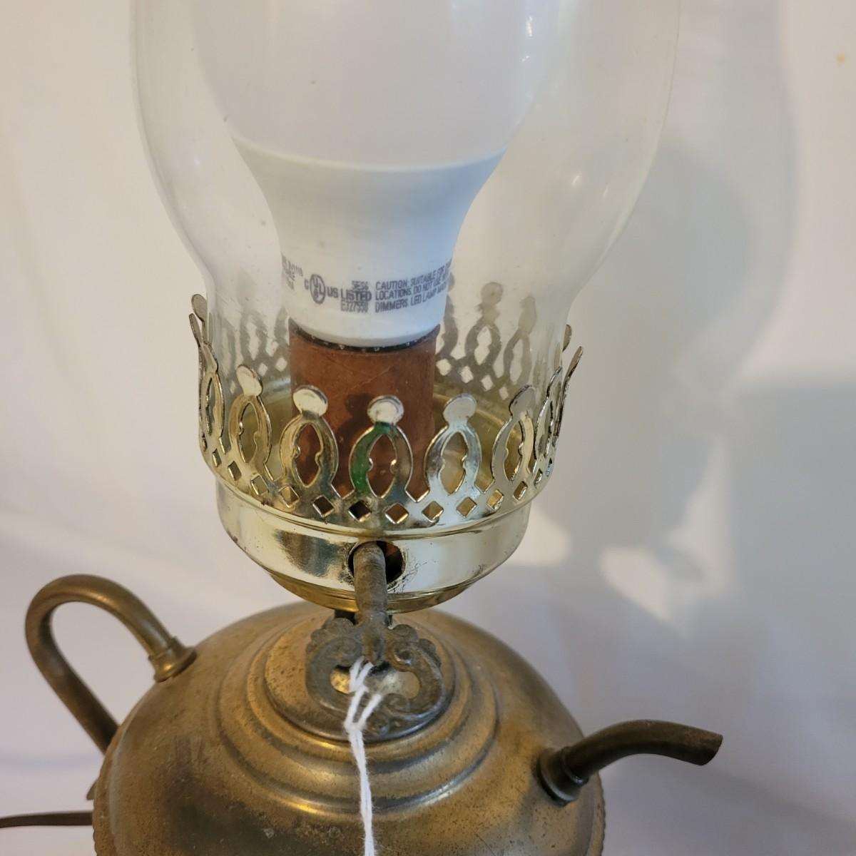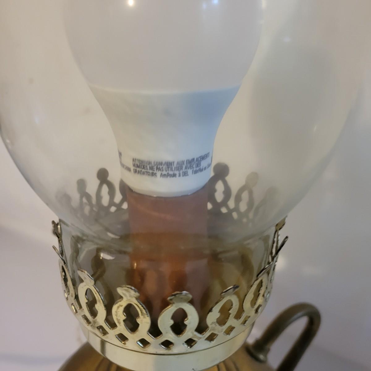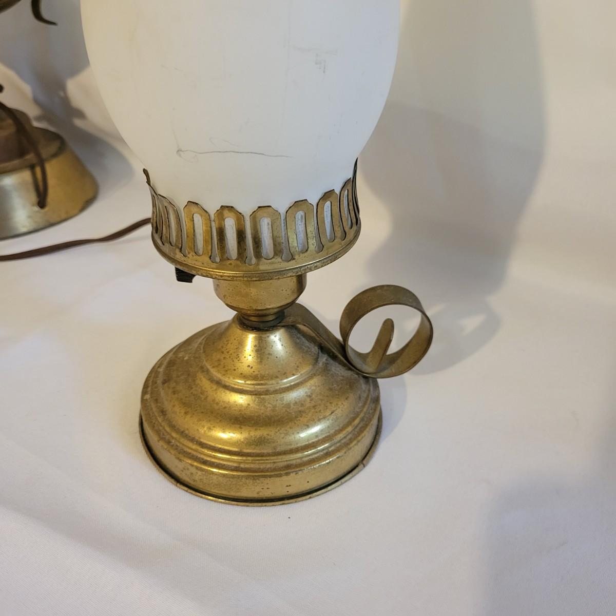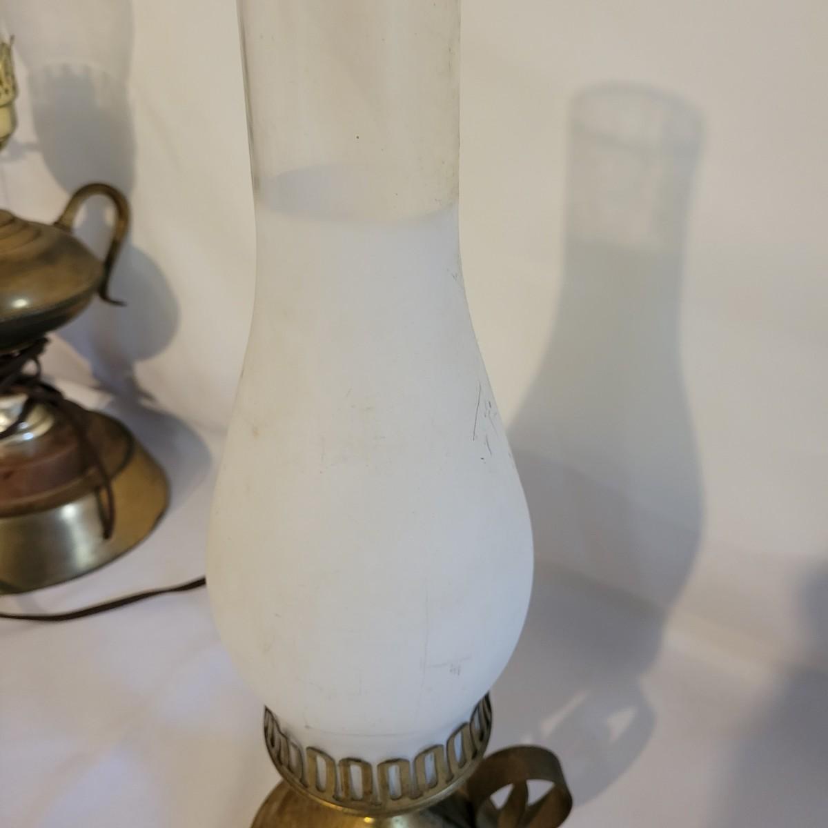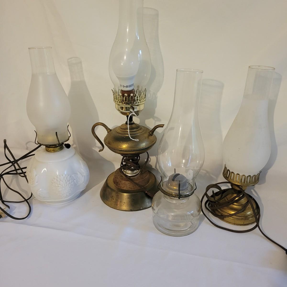 An assortment of 4 vintage hurricane lamps in good condition. 3 are electric and one is oil. One lamp appears to be milk glass and has a frosted globe. The largest lamp has a metal and brass base and a clear globe. This lamp's key to power on is somewhat loose, as is the bulb socket The last electric lamp has a metal base and a frosted globe. The final lamp, the oil lamp, is a clear glass and globe with a metal wick holder. The adjustment stem is bent and the wick has been used up. Largest lamp measures approximately 7" x 19". Shipping available. Shipping can be costly please call UPS store at 828-252-6930 for quote.