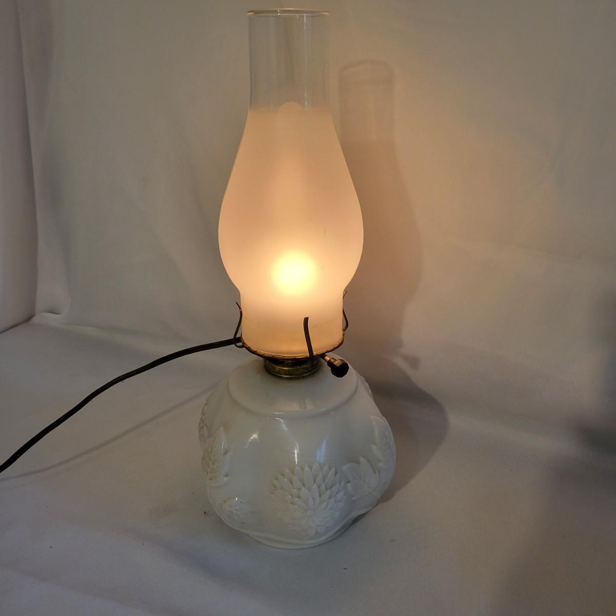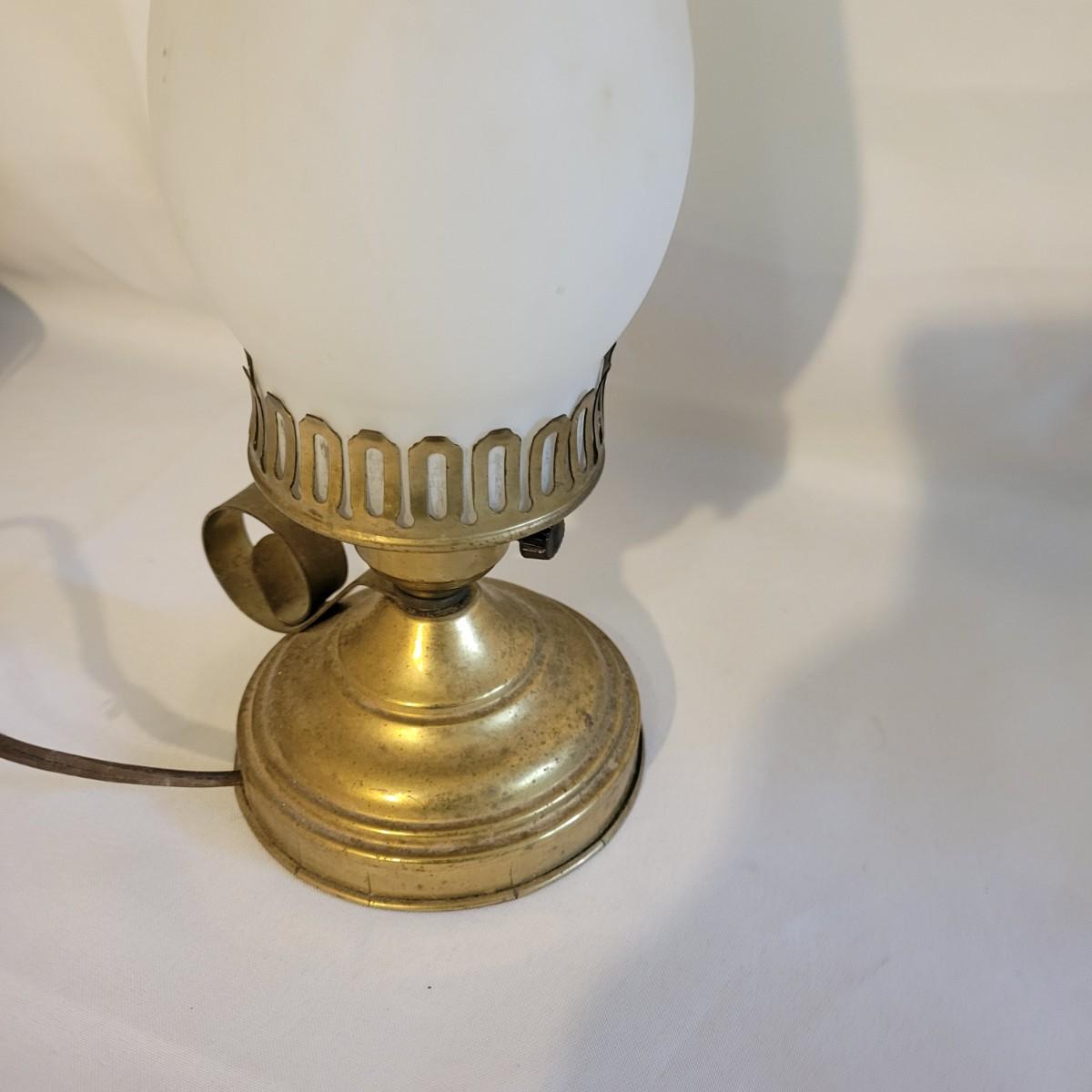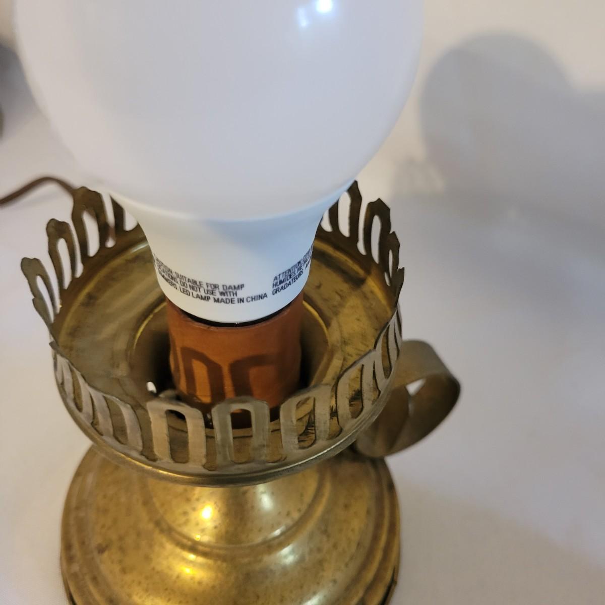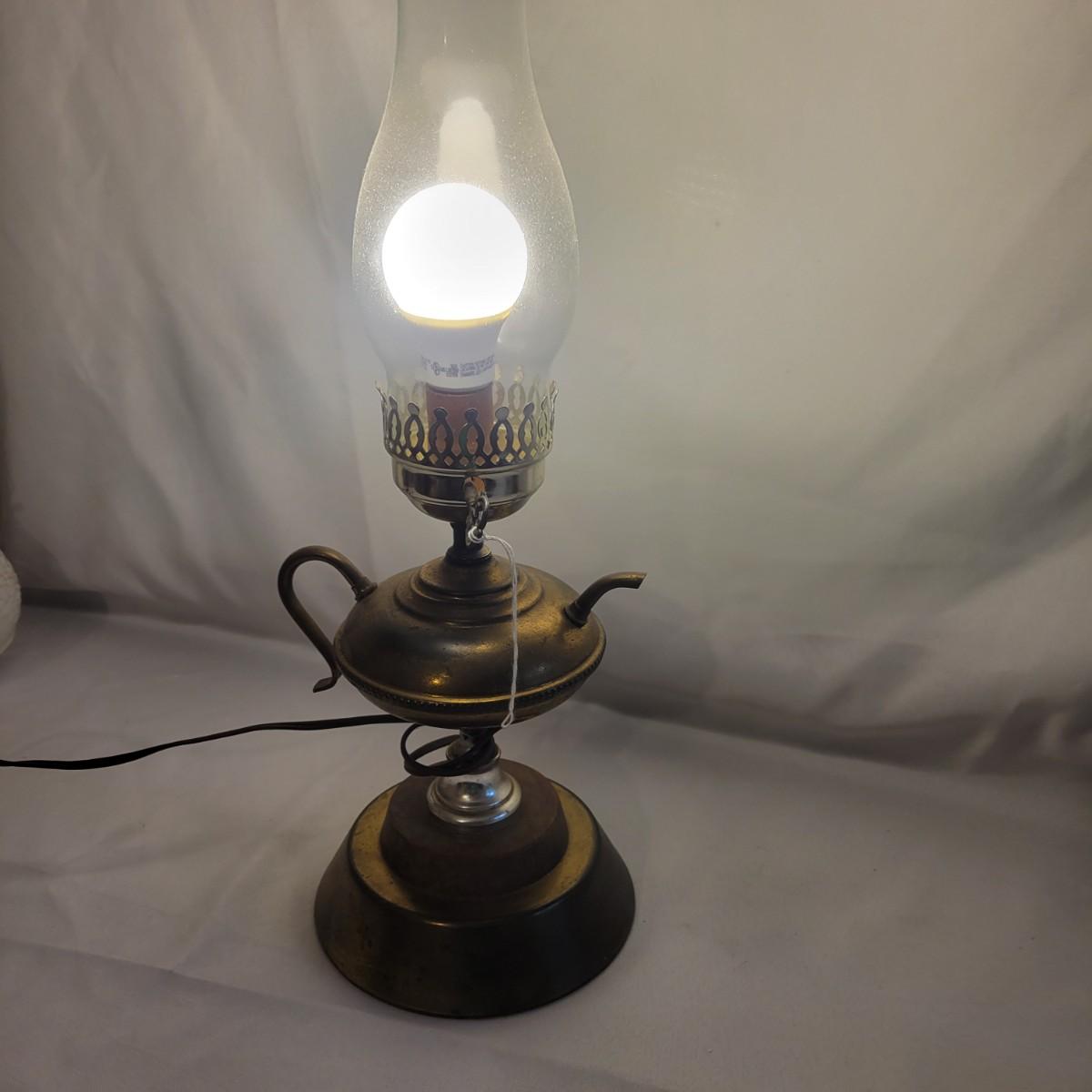 An assortment of 4 vintage hurricane lamps in good condition. 3 are electric and one is oil. One lamp appears to be milk glass and has a frosted globe. The largest lamp has a metal and brass base and a clear globe. This lamp's key to power on is somewhat loose, as is the bulb socket The last electric lamp has a metal base and a frosted globe. The final lamp, the oil lamp, is a clear glass and globe with a metal wick holder. The adjustment stem is bent and the wick has been used up. Largest lamp measures approximately 7" x 19". Shipping available. Shipping can be costly please call UPS store at 828-252-6930 for quote.